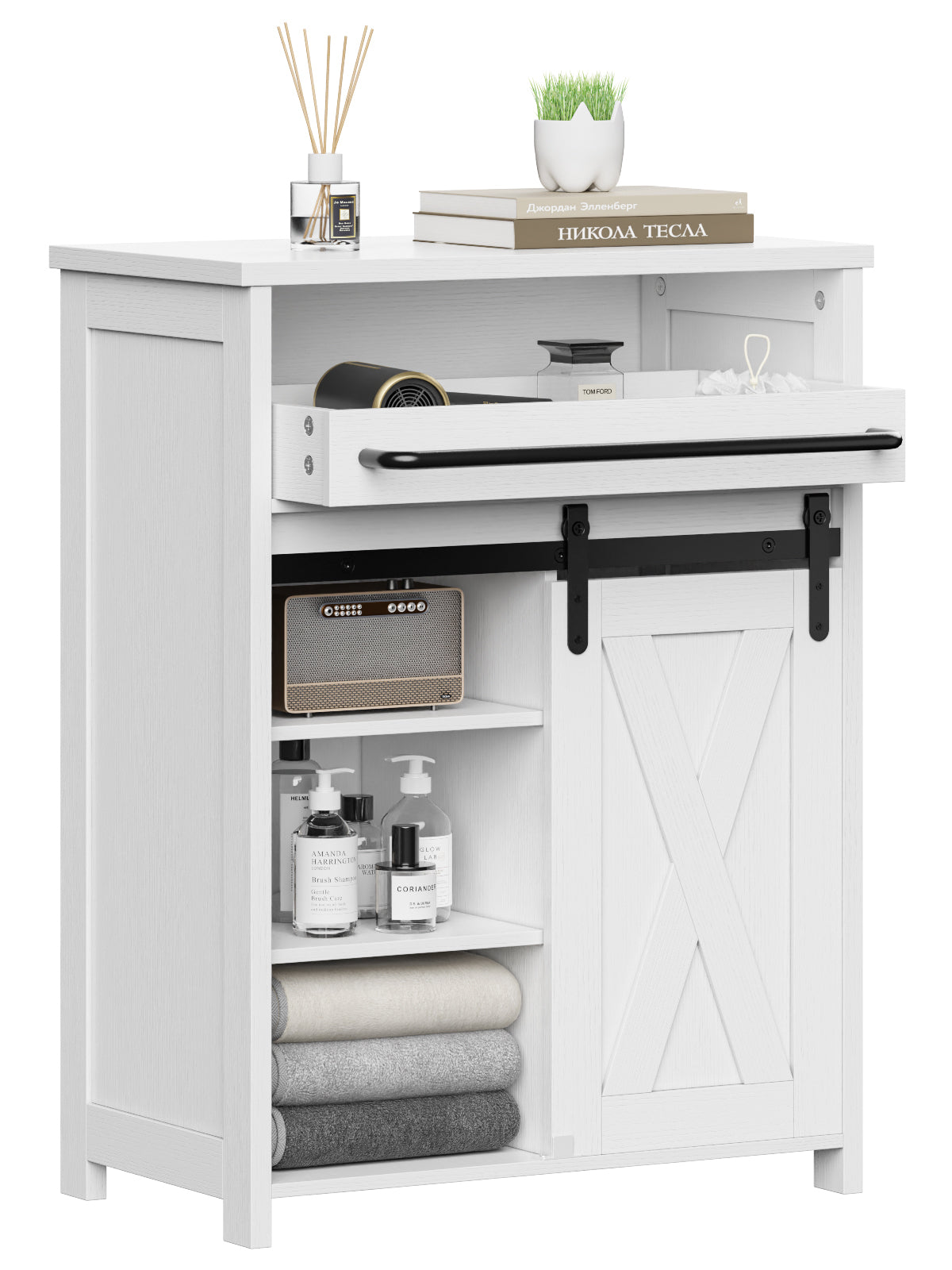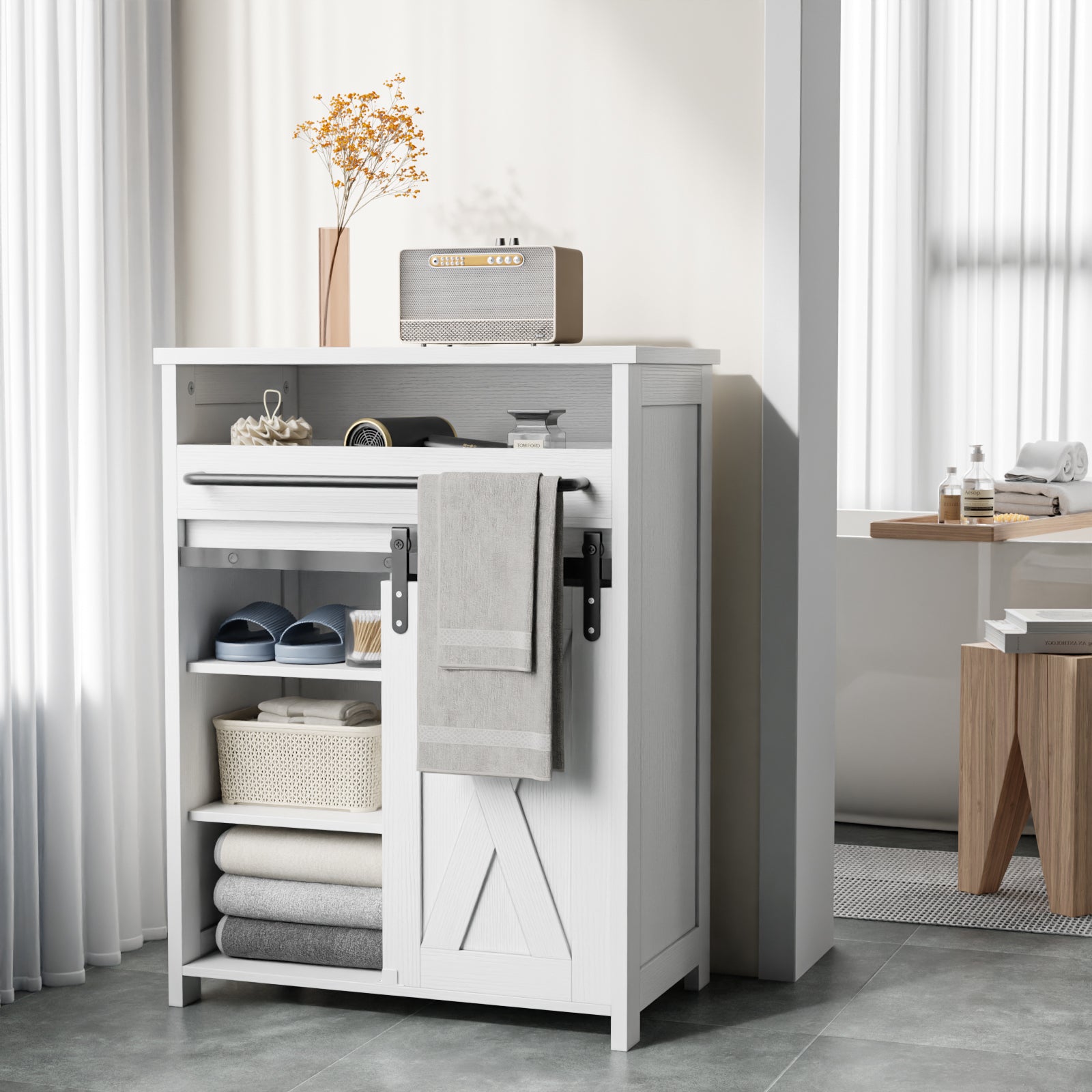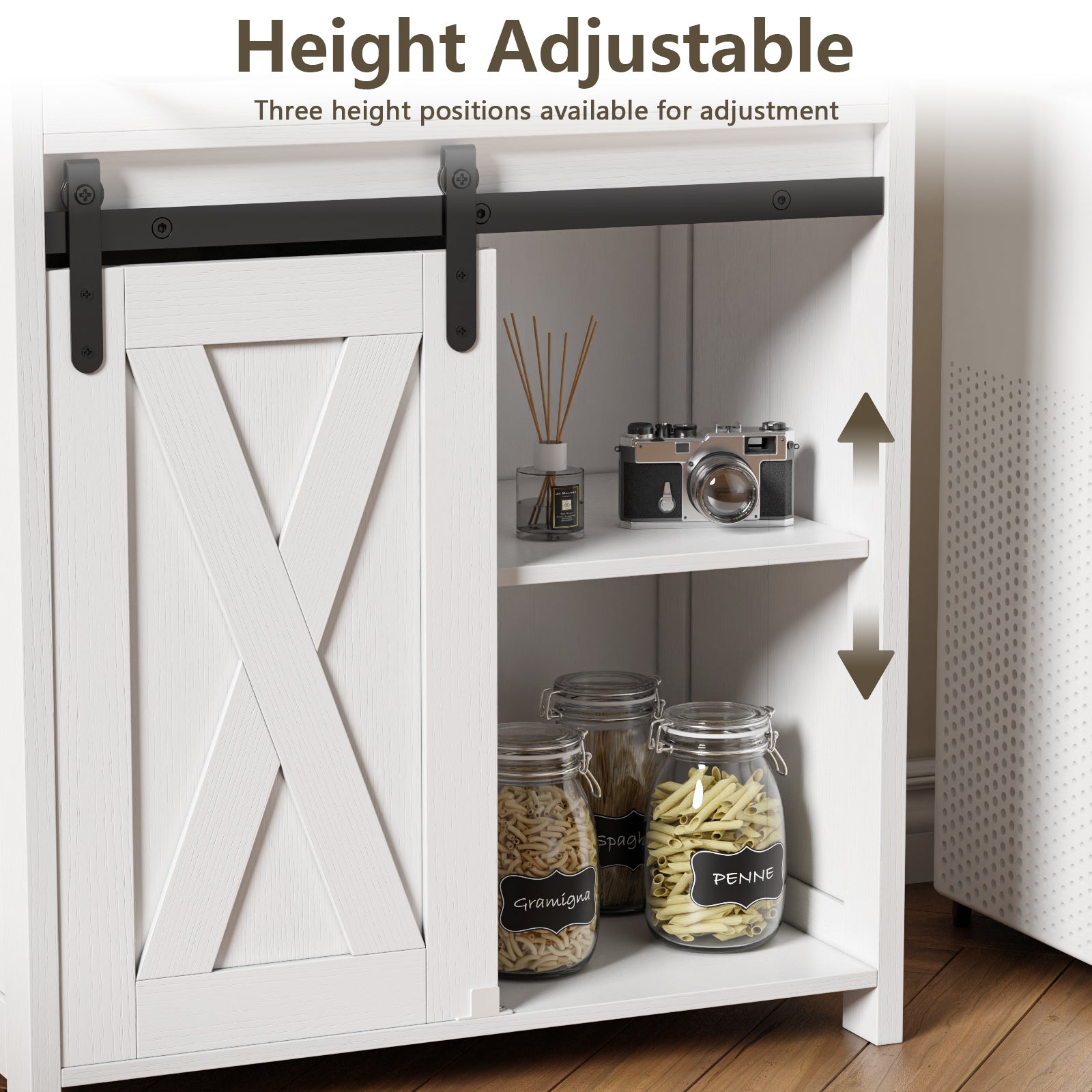 Upgrade your space with this versatile farmhouse-style storage cabinet featuring 2 adjustable shelves to customize storage height. Crafted with durable MDF and metal frame, its rustic distressed finish adds vintage charm to bathrooms, kitchens, or entryways. Water-resistant surface wipes clean easily. Quick assembly with included hardware.