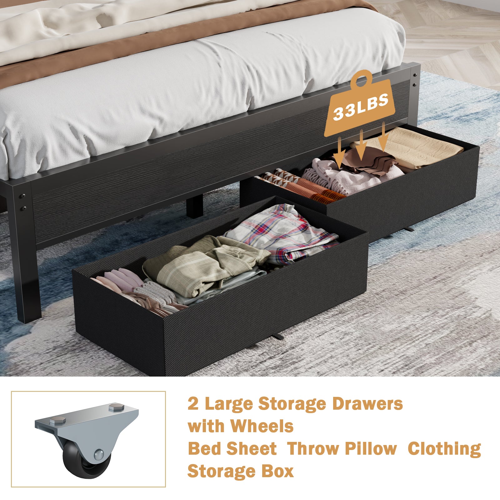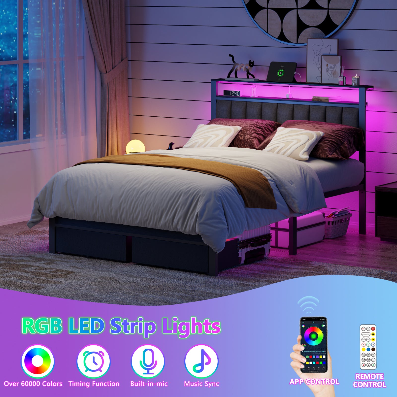 Satifur Full Bed Frame with 2 Drawers & Storage Headboard, Platform Metal Bed with 2 USB Ports and Outlets, No Box Spring Needed