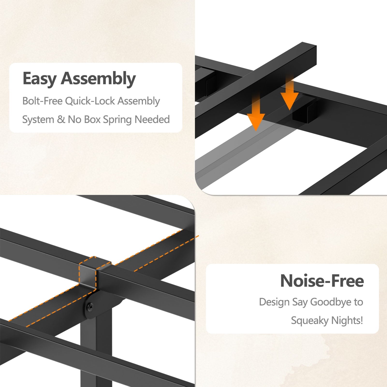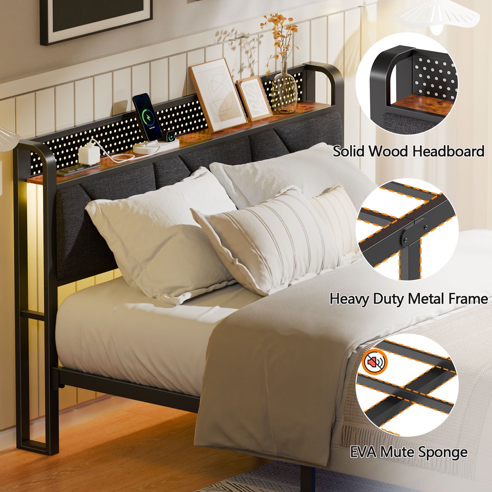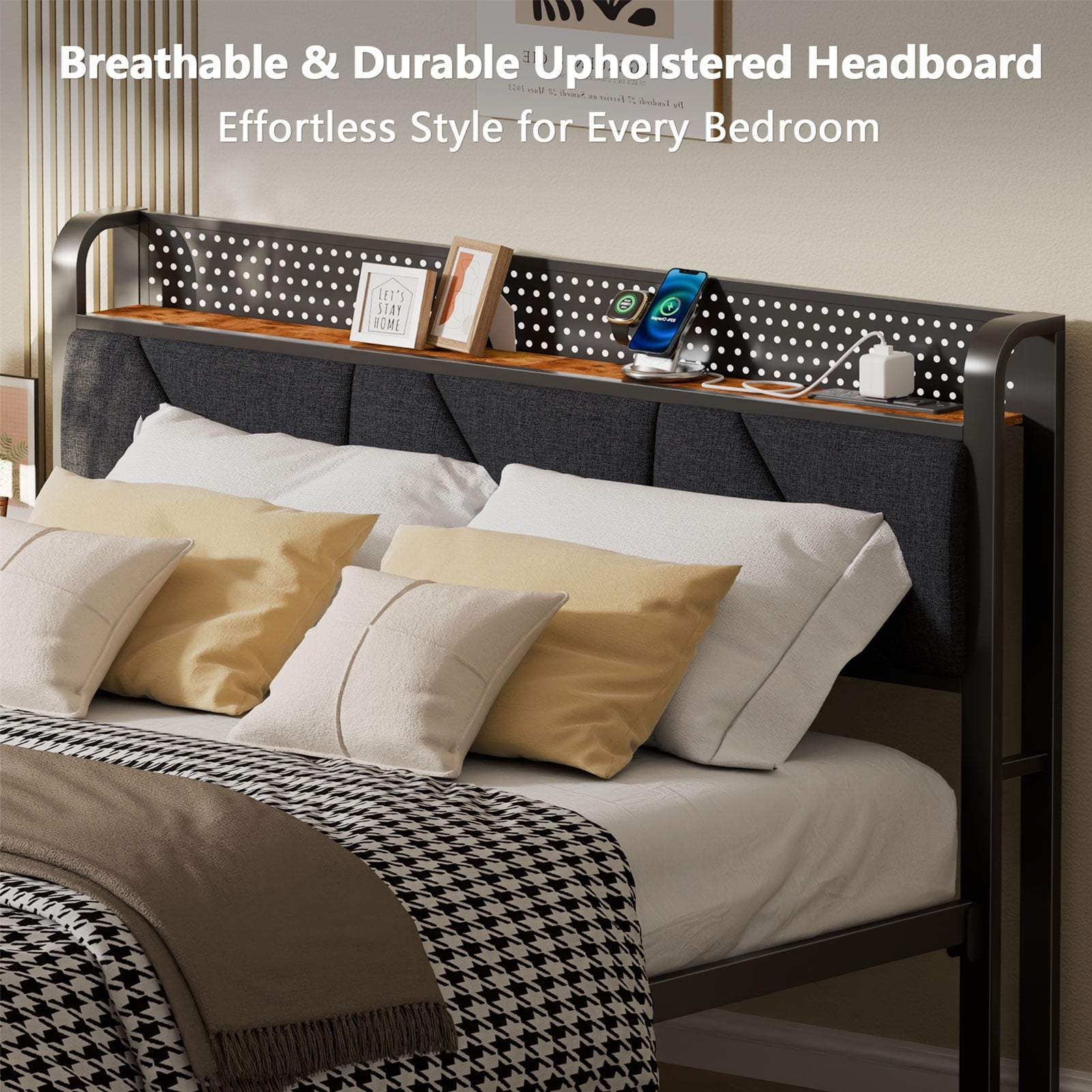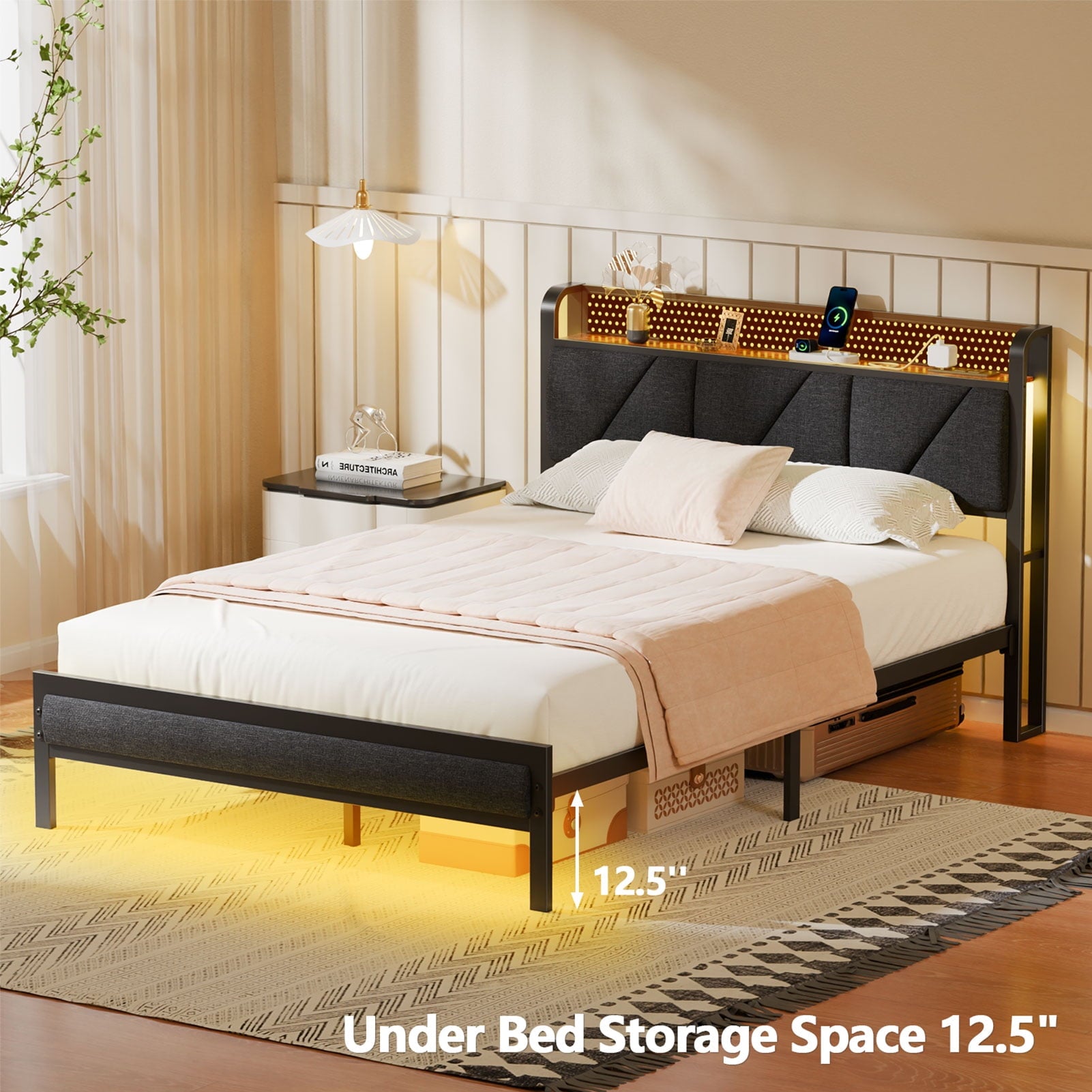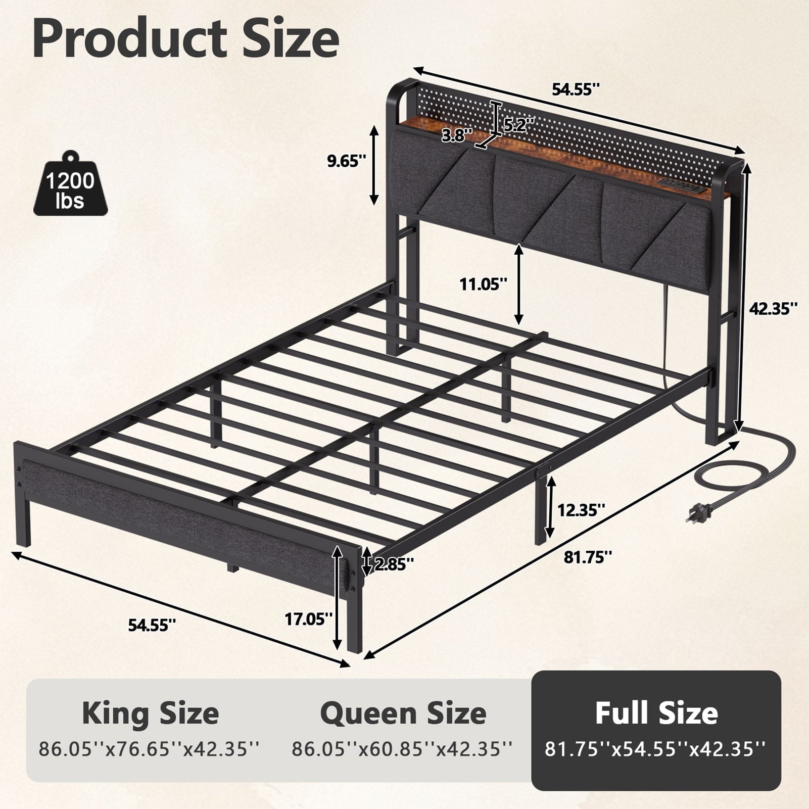 Satifur Full Bed Frame with Upholstered Storage Headboard, Metal Platform Bed Station with Charging Station & LED, Noise-Free. No Box Spring Needed