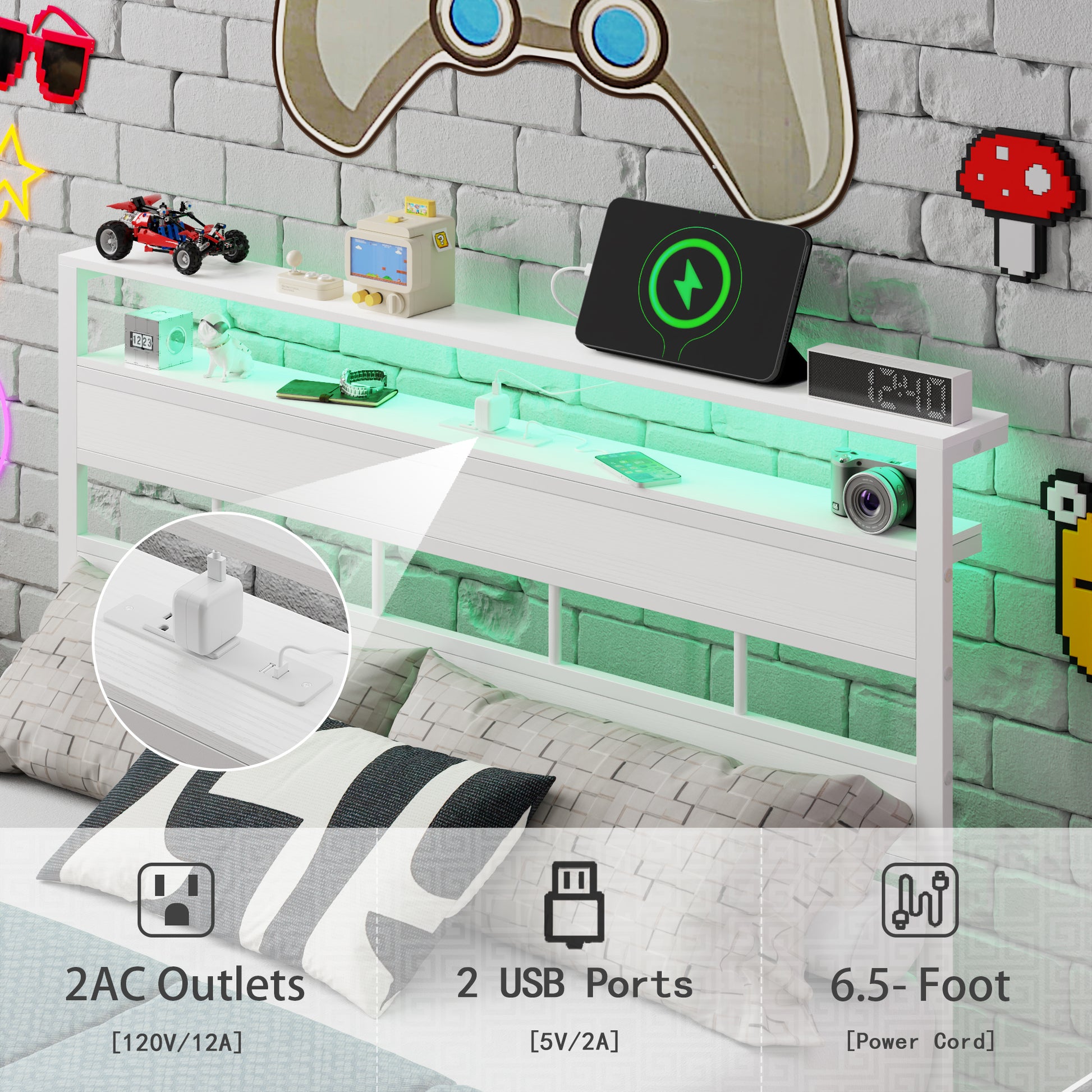 Satifur Full Bed Frames with Charging Station and LED Lights, Full Size Platform Bed with Wood Headboard & 2-Tier Storage Shelves, No Box Spring Needed, White