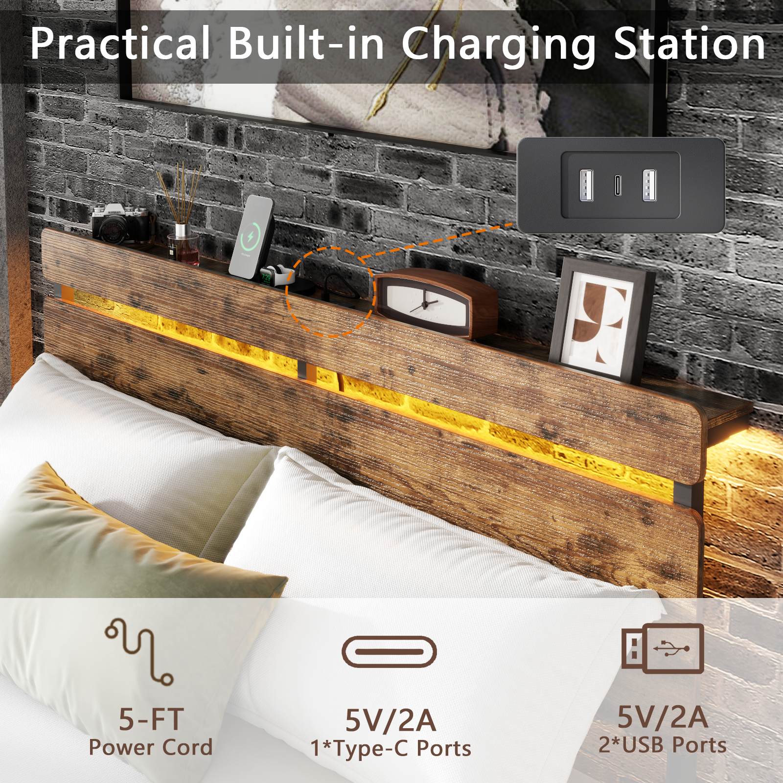 Satifur Full Size Bed Frame with 2 Drawers & LED Lights & Charging Station, Beds with Headboard & 10.10" Under Bed Storage, No Box Spring Needed, Easy Assembly, Rustic Brown
