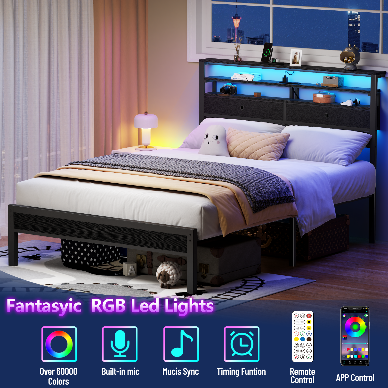 Smart Lighting, Ambiance at Your Fingertips - Featuring customizable smart RGB LED lights, adjust the color and brightness effortlessly via a remote control or smartphone app. From a cozy sleep environment to a vibrant party setting, switch to your desired ambiance with a single tap.