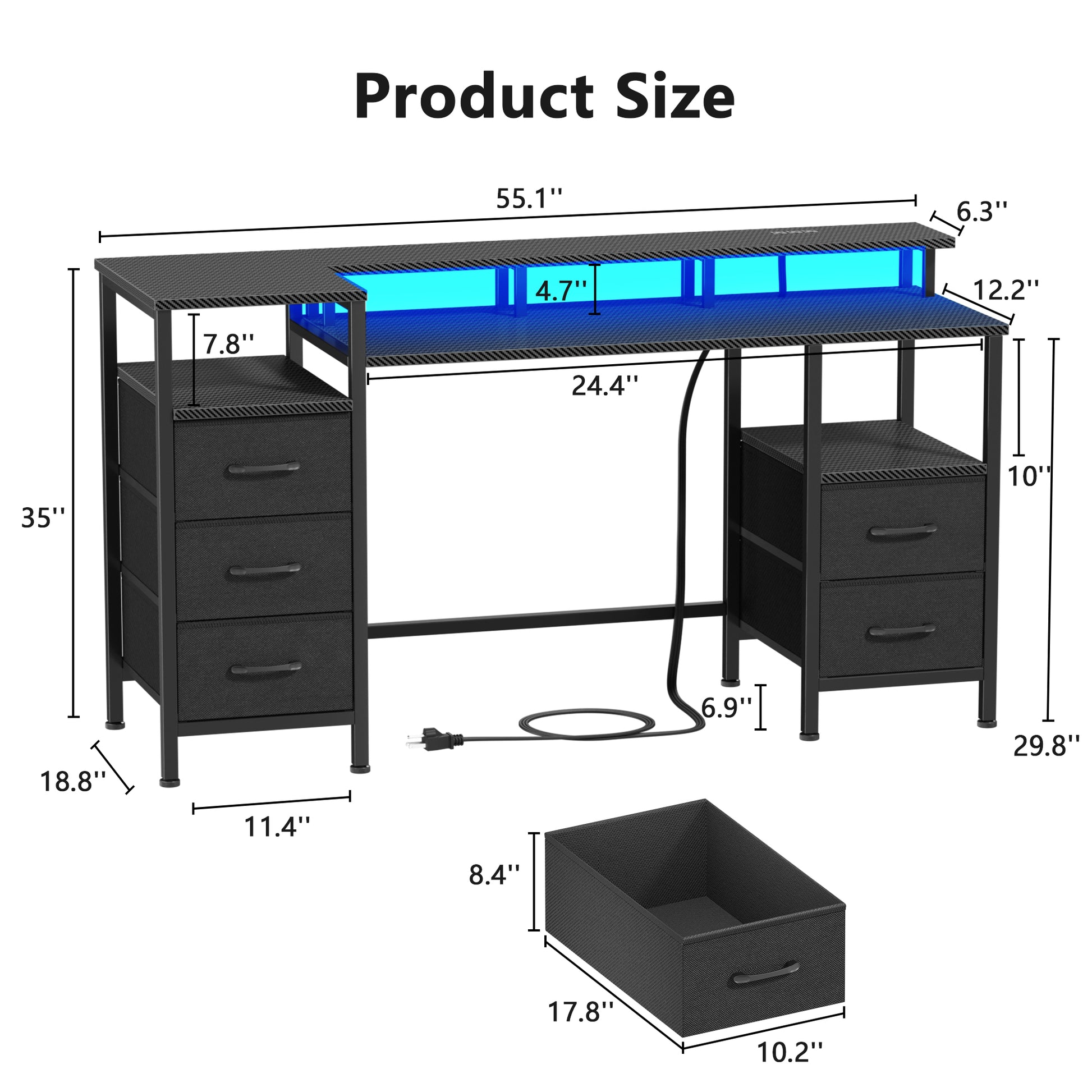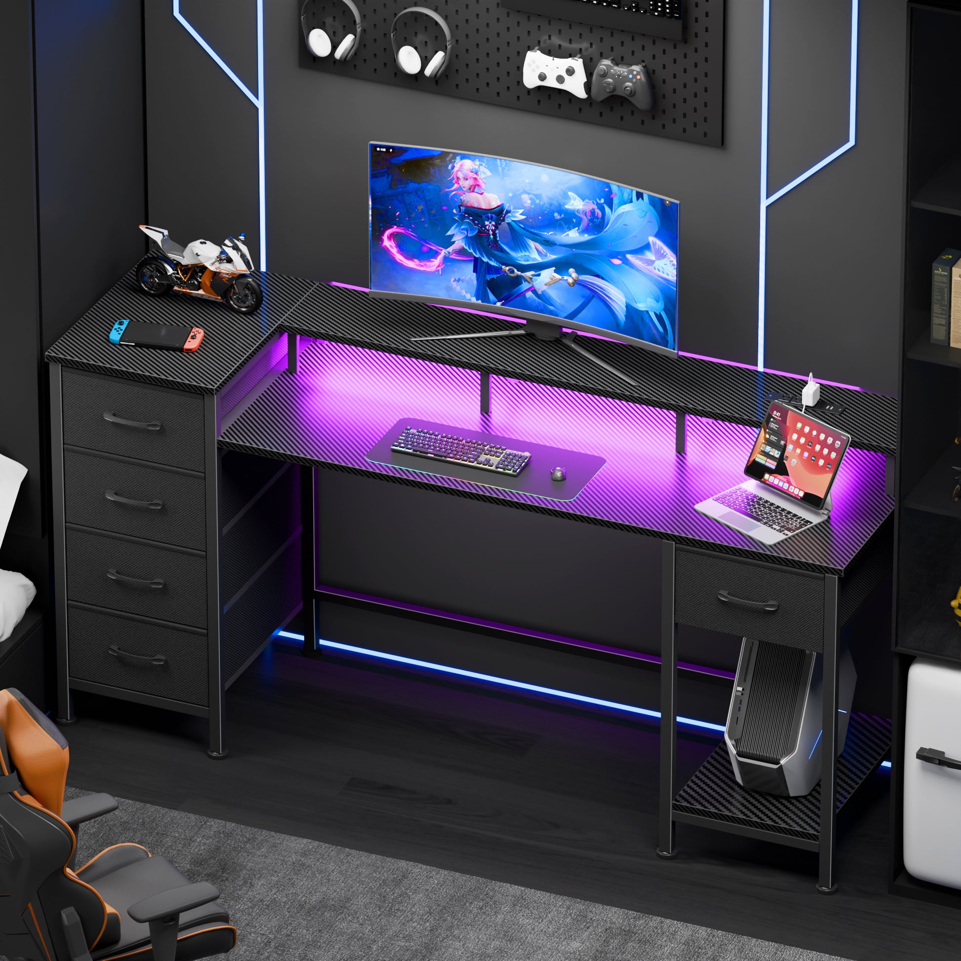 Satifur Gaming Desk with LED Lights & Power Outlets, 55" Computer Desk with 5 Fabric Drawers & Open Storage, Reversible Home Office Desk,Carbon Fiber Black