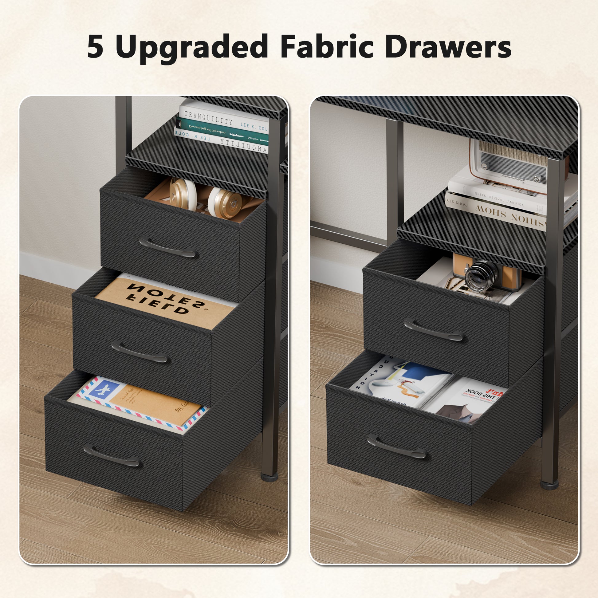 Superior Storage Capacity: Outfit your space with the exceptional organization offered by this computer desk. It includes 5 versatile fabric drawers and 2 handy open shelves beneath the desktop, providing ample room for everything from office supplies to gaming accessories.
