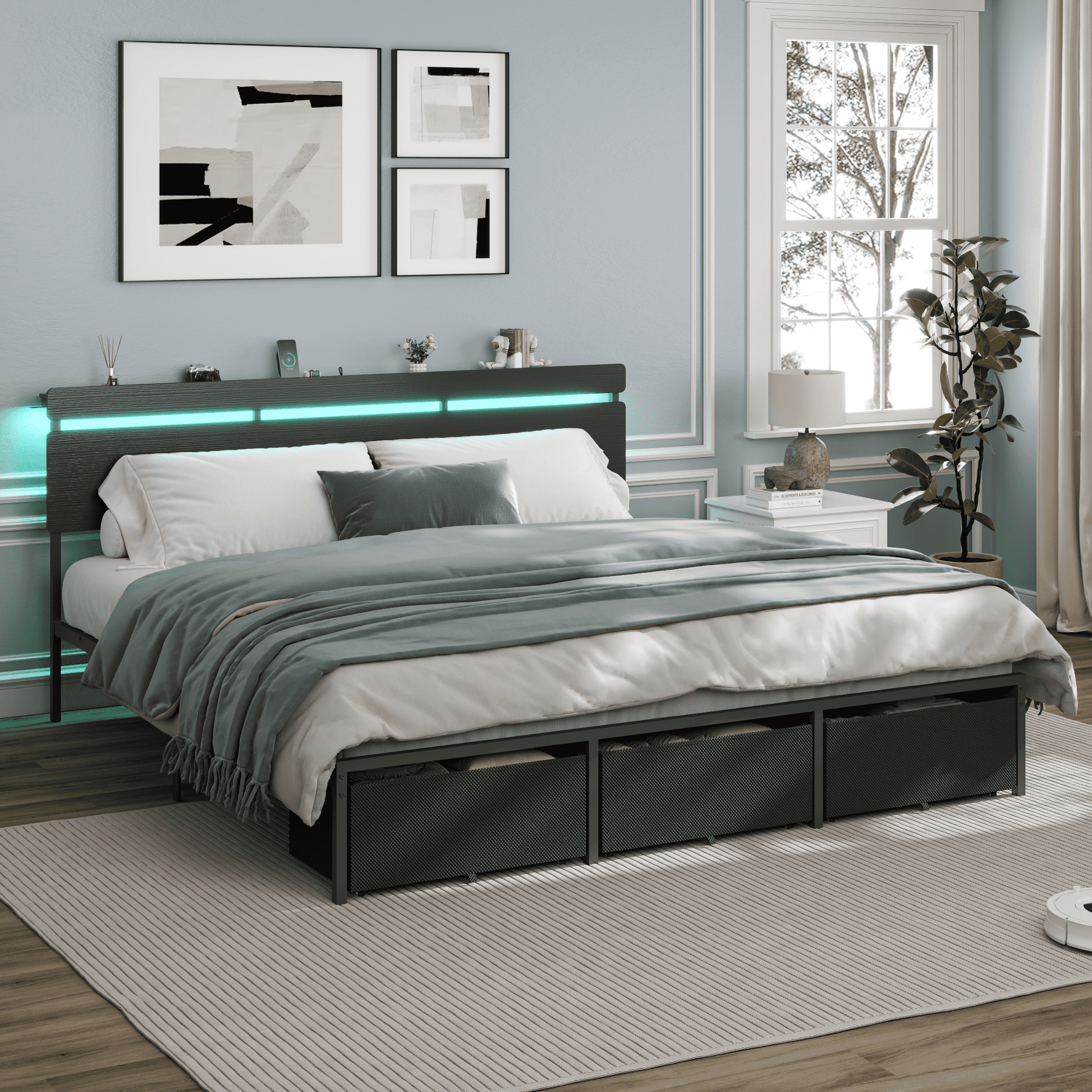 Satifur King Size Bed Frame with 3 Drawers & LED Lights & Charging Station, Beds with Headboard & 10.10" Under Bed Storage, No Box Spring Needed, Easy Assembly, Black