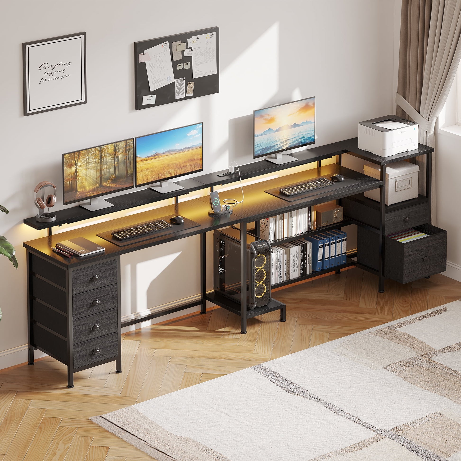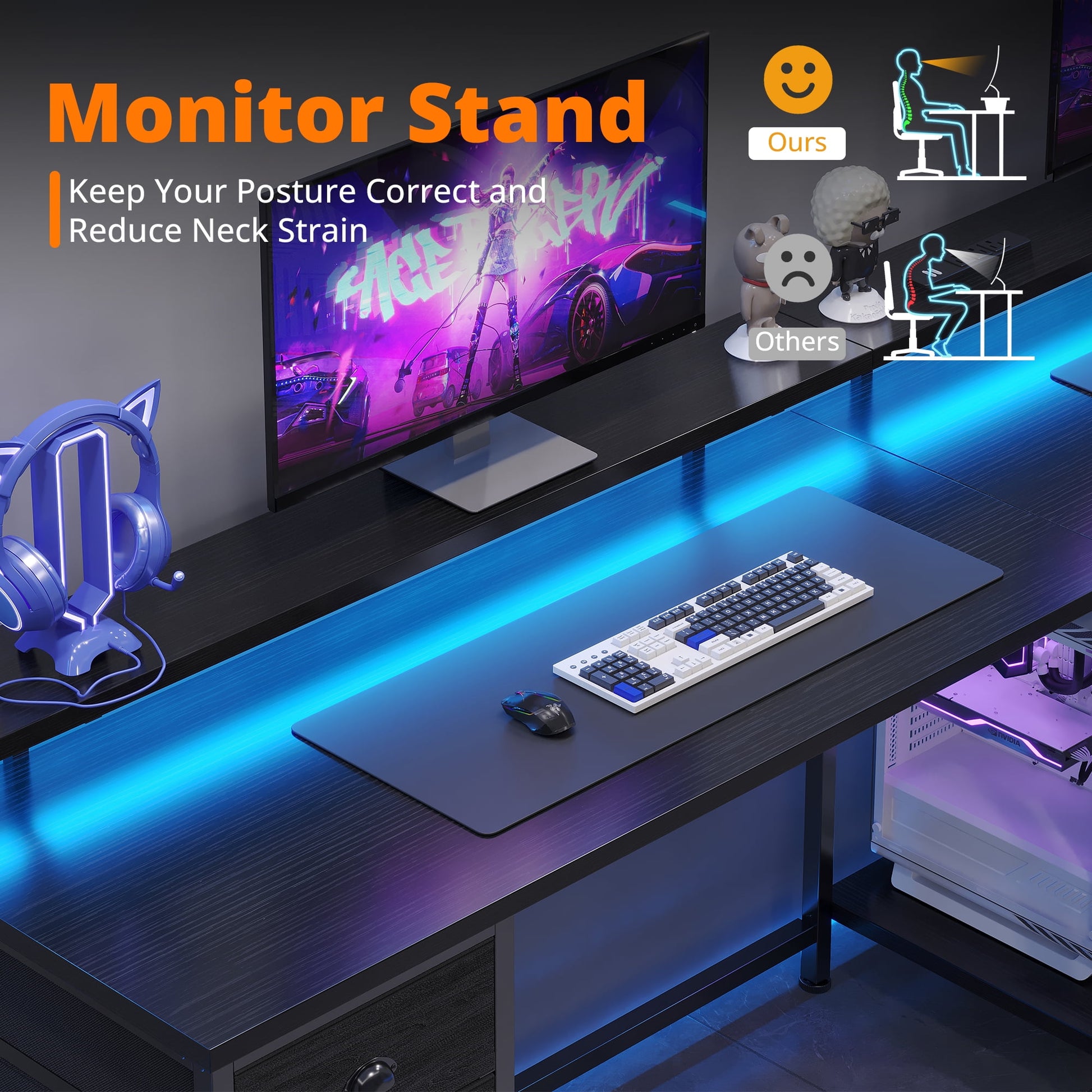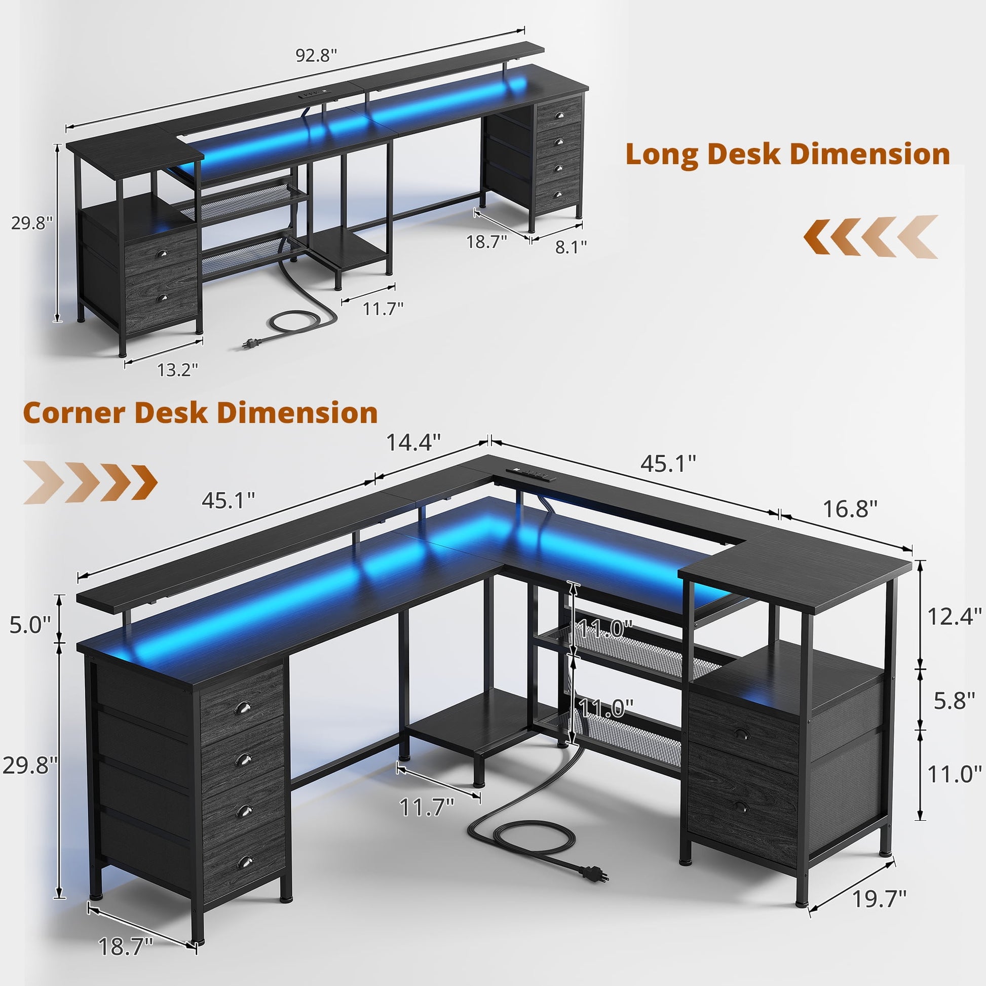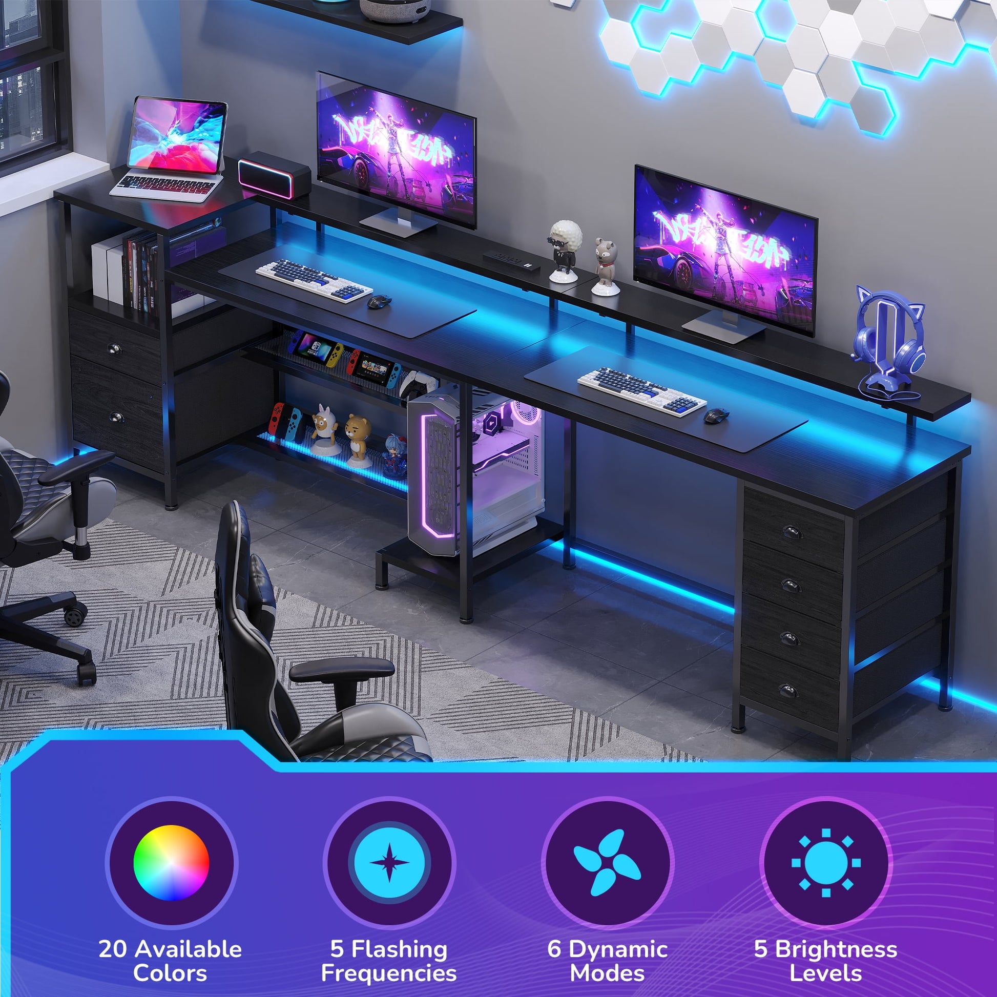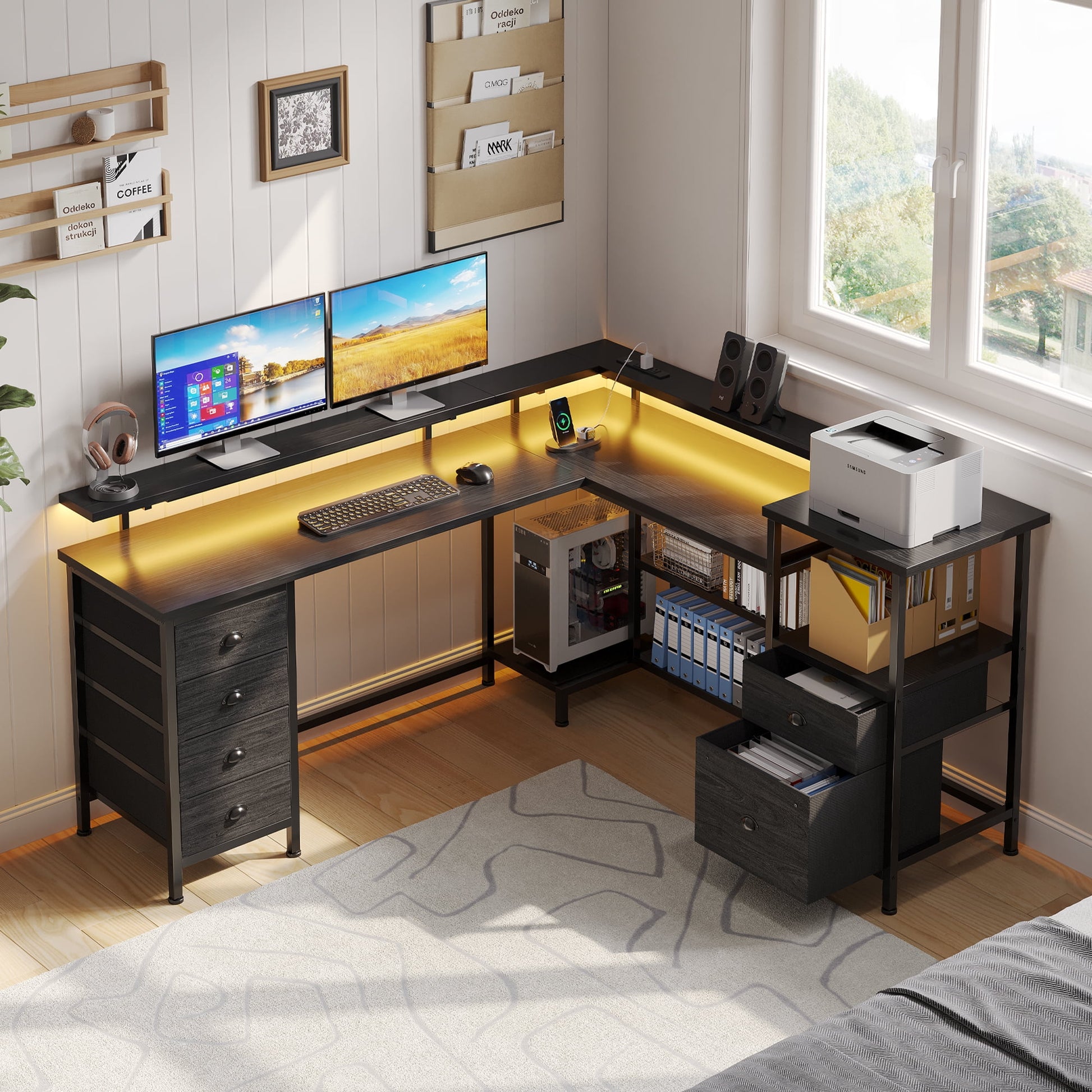 Satifur L Gaming Desk with Drawers and Outlet, Black Computer Desk with LED Light , Corner Desk with File Cabinet & Shelves