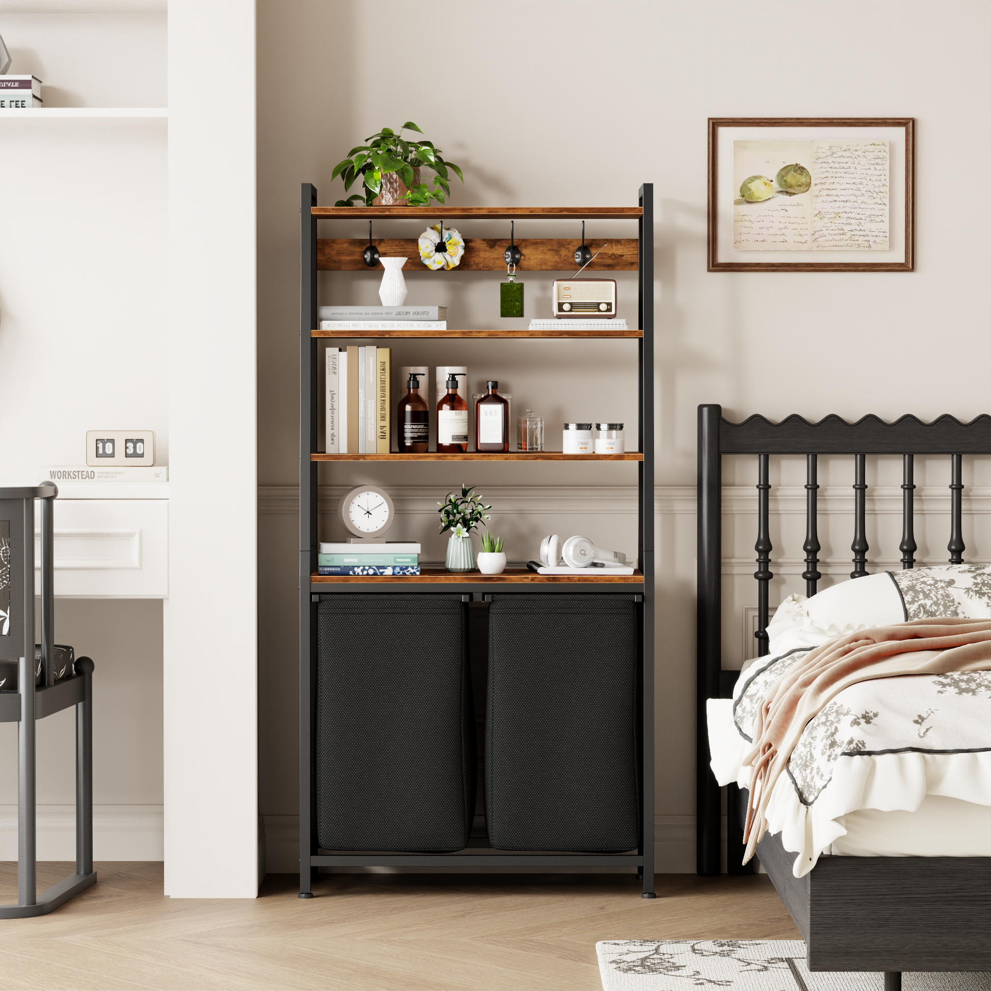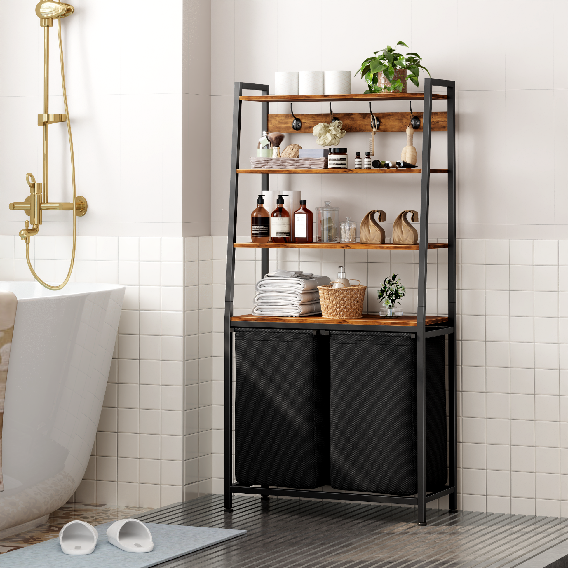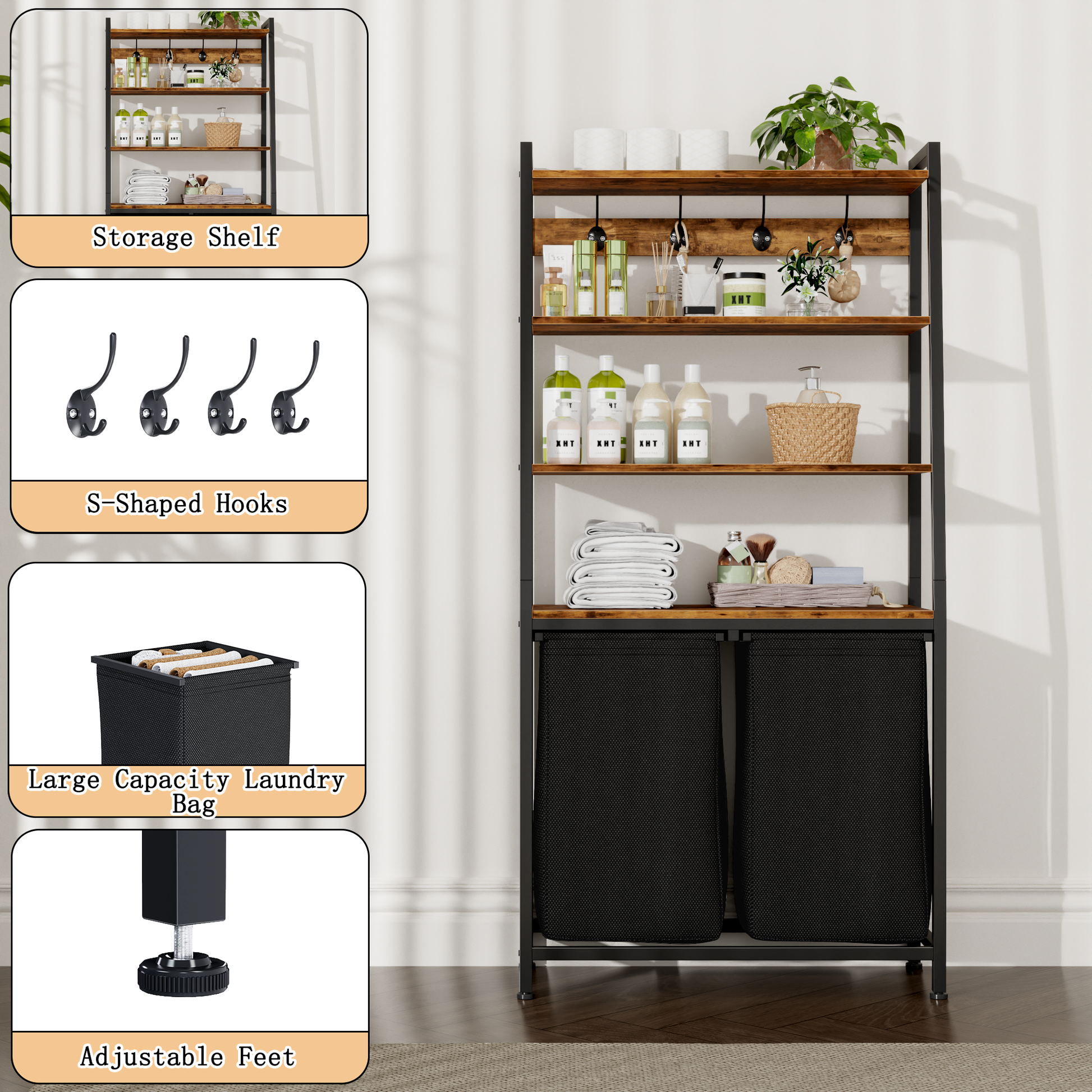 - Versatile 3-in-1 Design: Featuring a special 3-layer storage shelf and 4 sturdy steel hooks, this laundry hamper simplifies your laundry room while providing extra space for daily essentials.