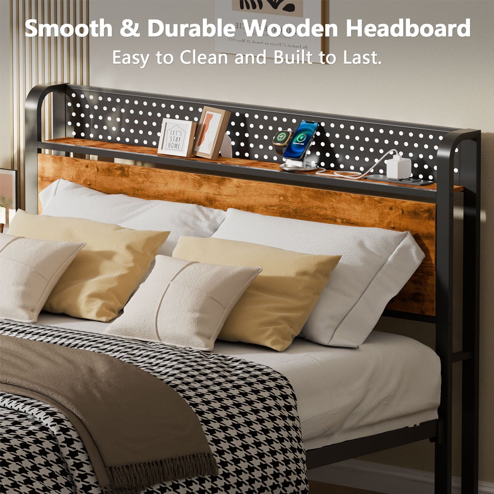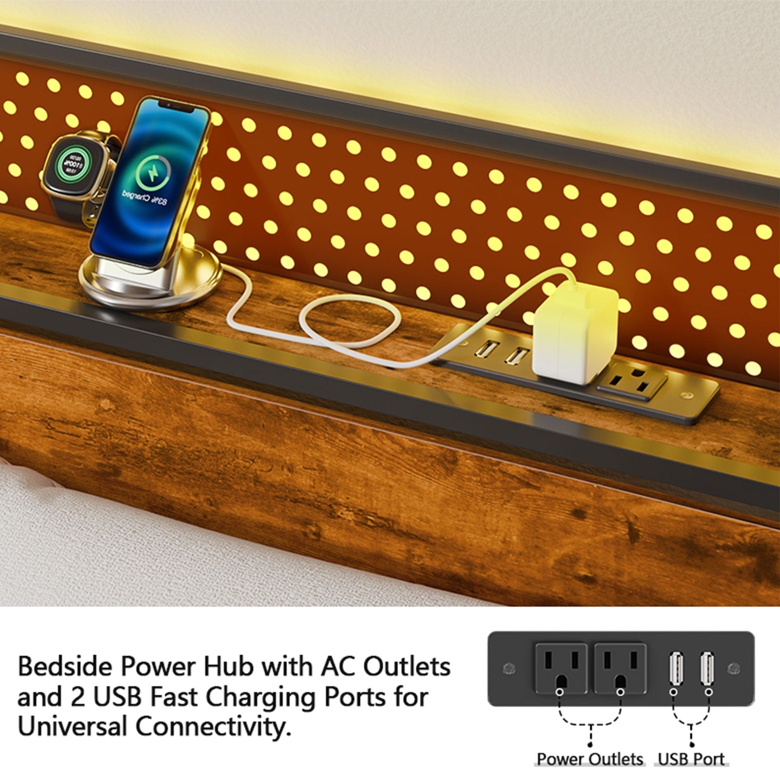 The Satifur Queen size LED bed frame is constructed from durable metal, ensuring stable support and protecting the floor from damage. It includes 2 AC outlets and 2 USB ports, allowing for convenient charging of devices such as phones, lamps, and more. The sturdy metal slats can support up to 1200 lbs and are equipped with silent sponges to reduce noise. With 20 color options for the LED lights, the bed can create any desired ambiance using a remote controller or mobile app. This rustic wood bed is a versatile and stylish addition to any bedroom, suitable for a master bedroom.