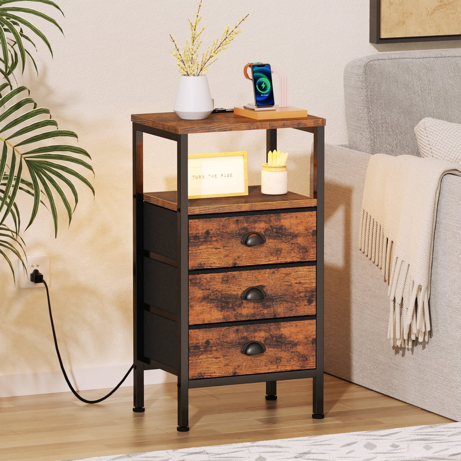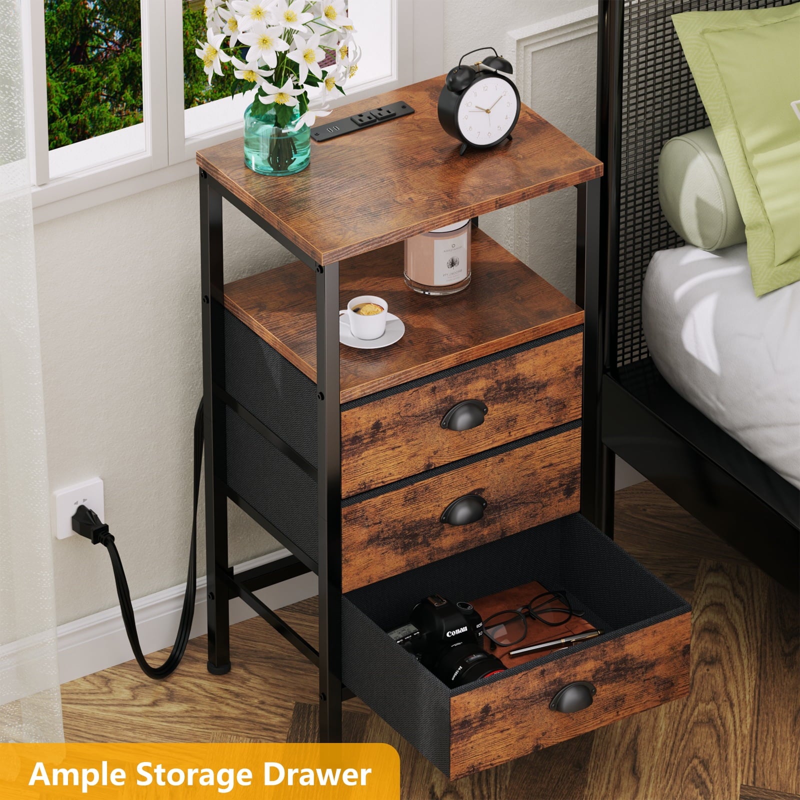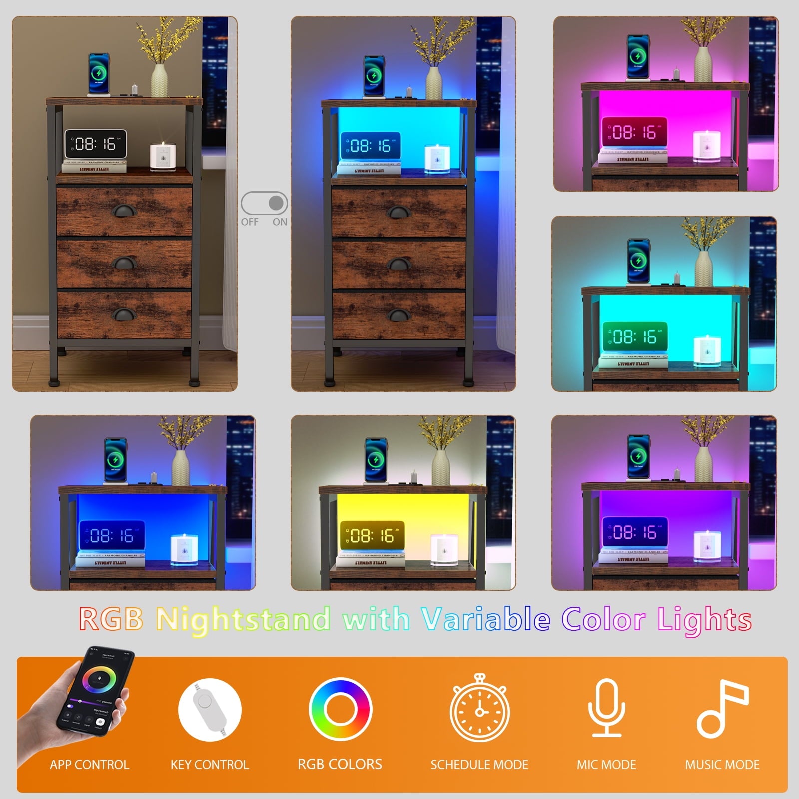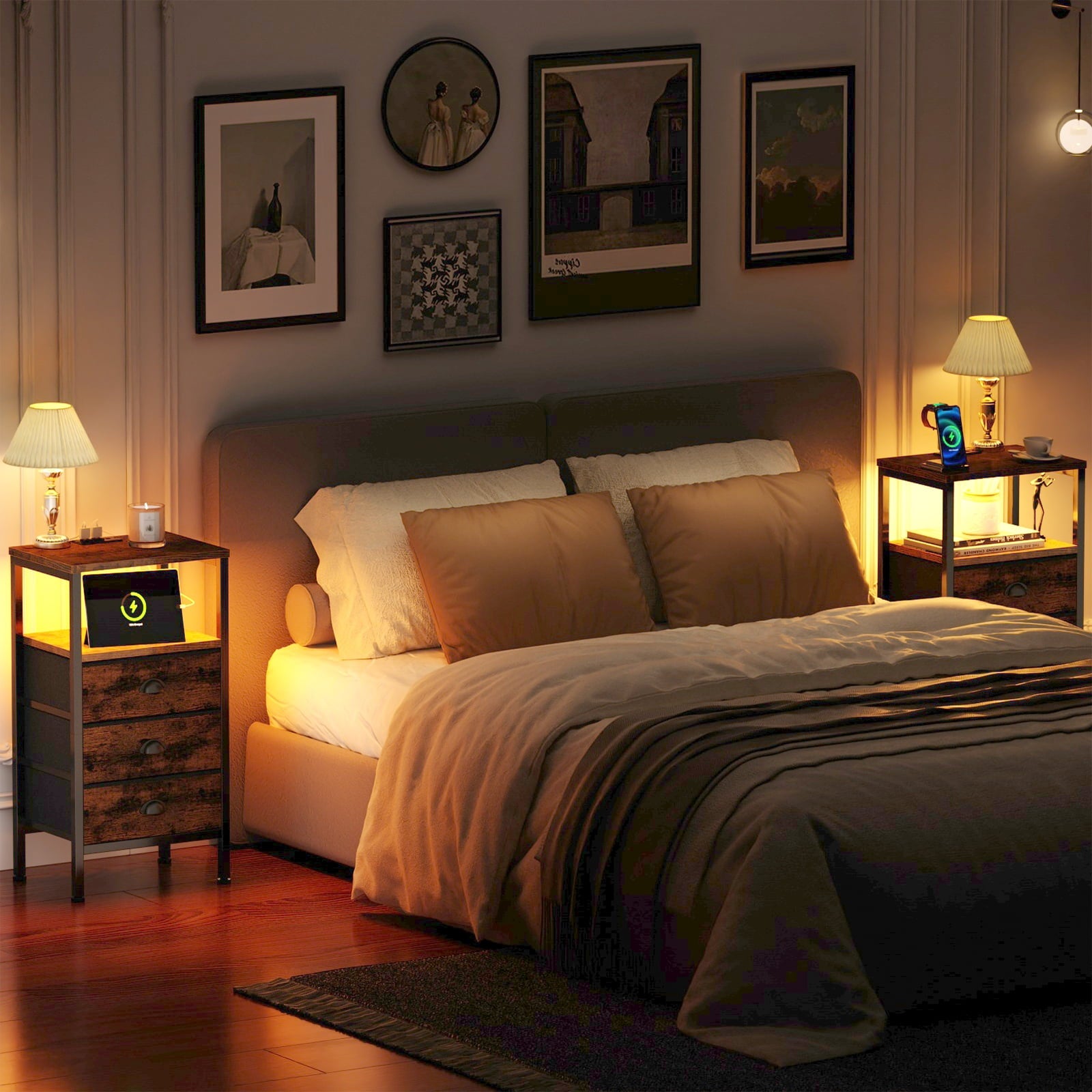Satifur Night Stand with Charging Station,LED Nightstand with USB Ports and Outlets,Fabric Drawers Bed Side Table,Rustic Brown