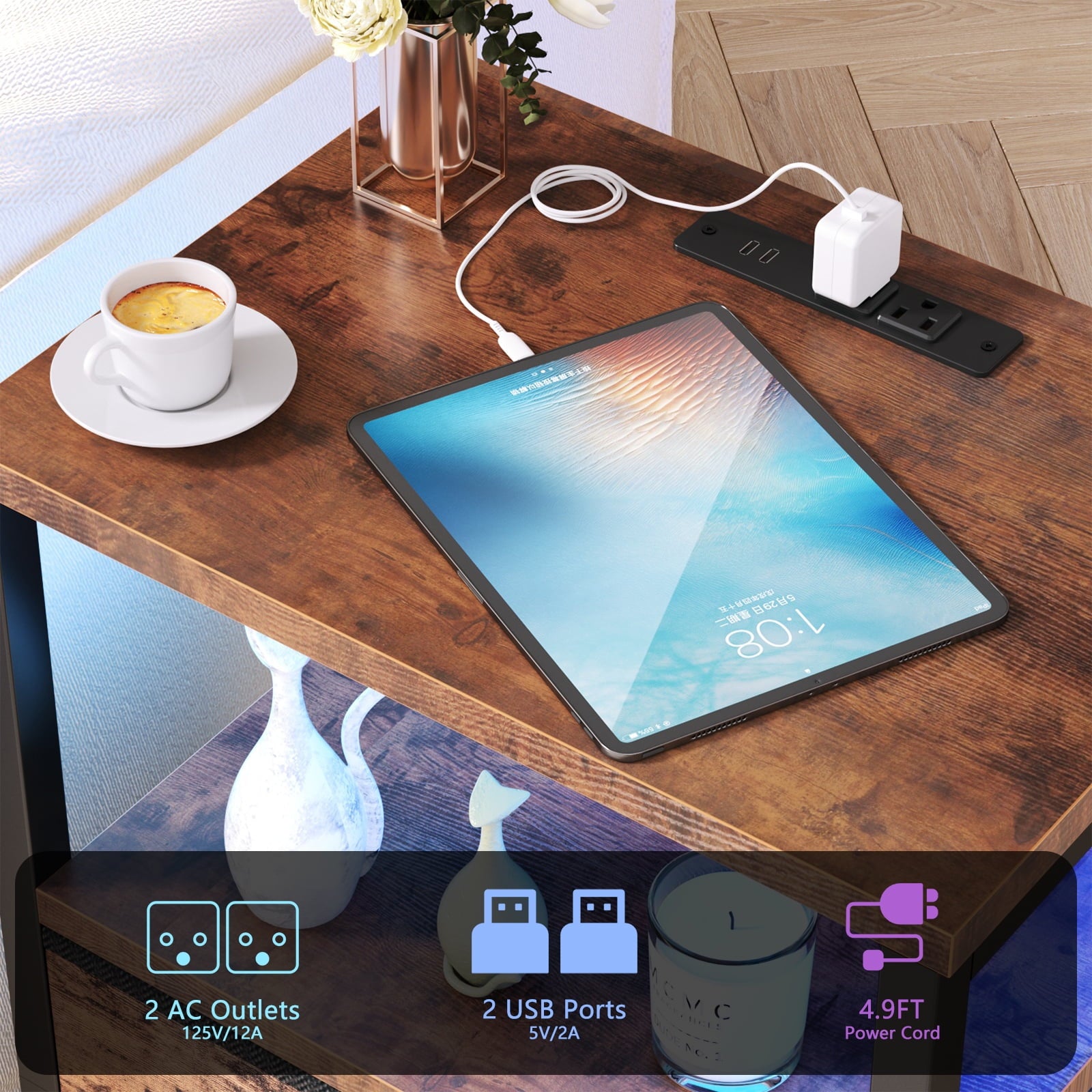 Statifur end table with charging station for livingroom, bedroom and office comes with 2 USB ports and 2 power outlets, you can easily charge your mobile phone, computer, Bluetooth speaker or iPad at any time. This wooden nightstand features with 2 foldable fabric drawers( Not Wood) providing large capacity of daily necessities, such as books, remote controls, charging cables, etc. Steel frame structure offers stability and sturdy. In addition, the RGB color light is nice bonus that makes rooms attractive.