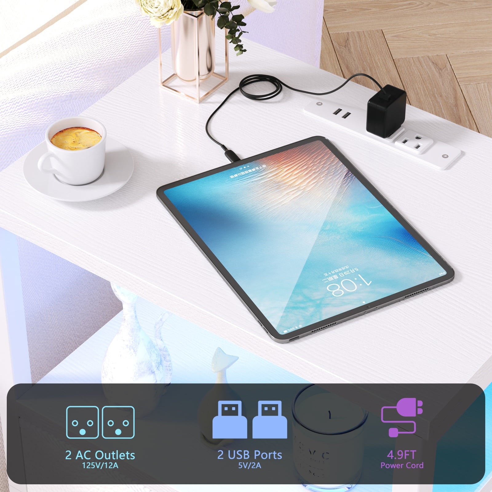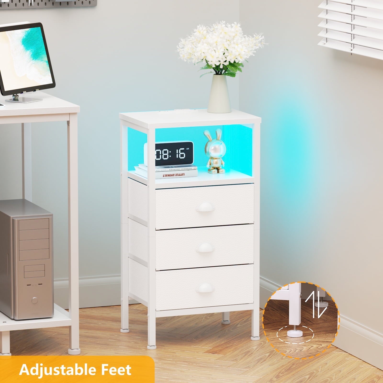 Satifur Night Stand with Charging Station,LED Nightstand with USB Ports and Outlets,Fabric Drawers Bed Side Table,White