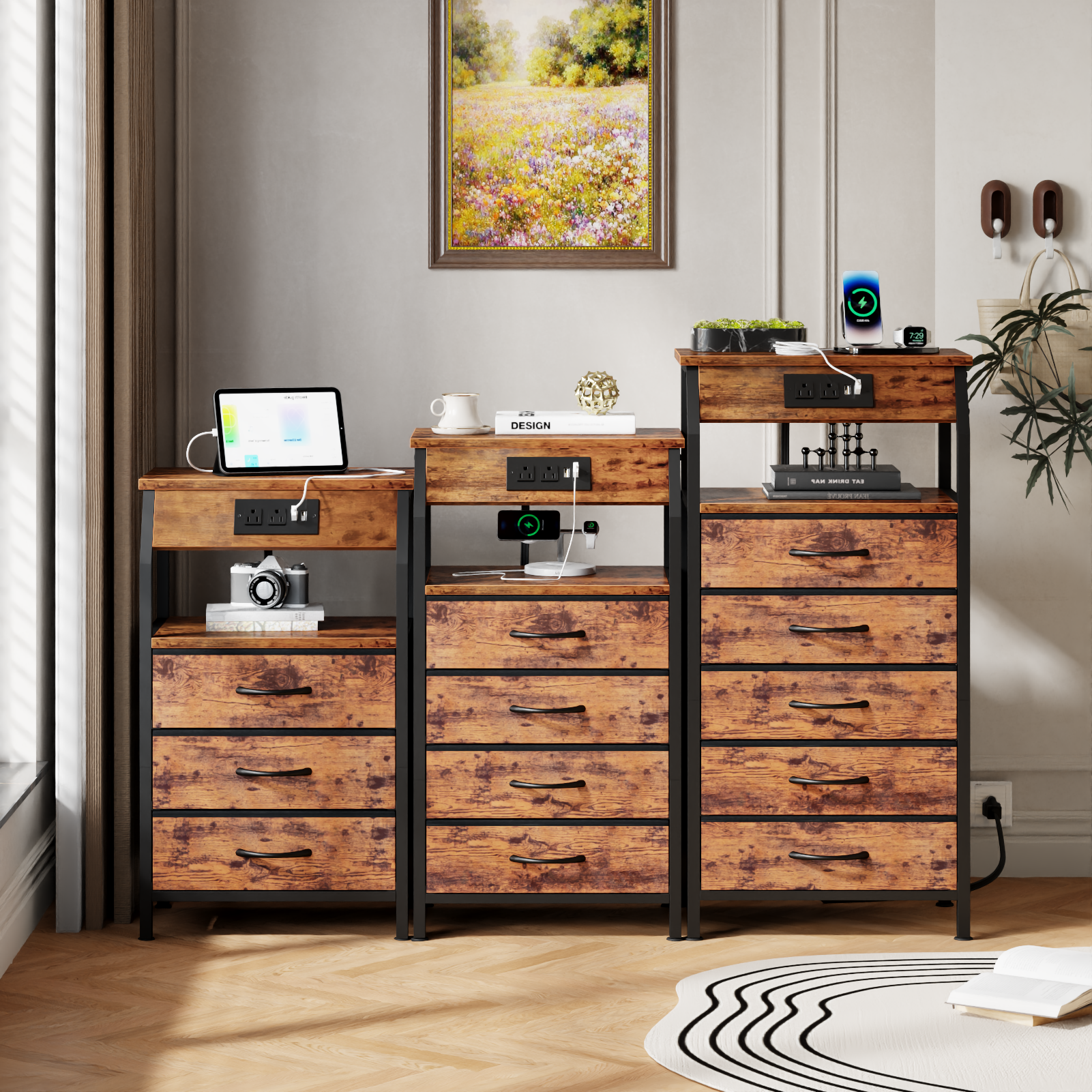 Satifur Nightstand with Charging Station, Bedside Dresser with 5 Fabric Drawers and Storage Shelves for Bedroom, Rustic Brown