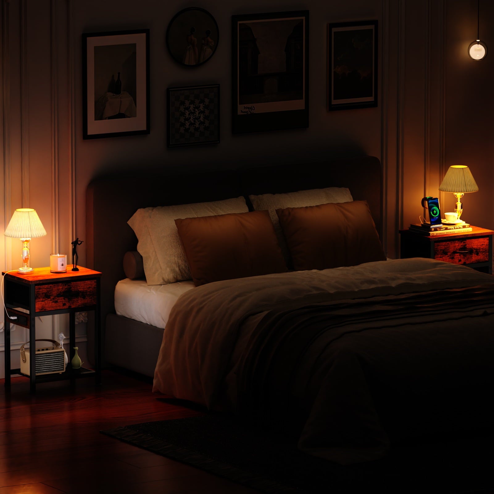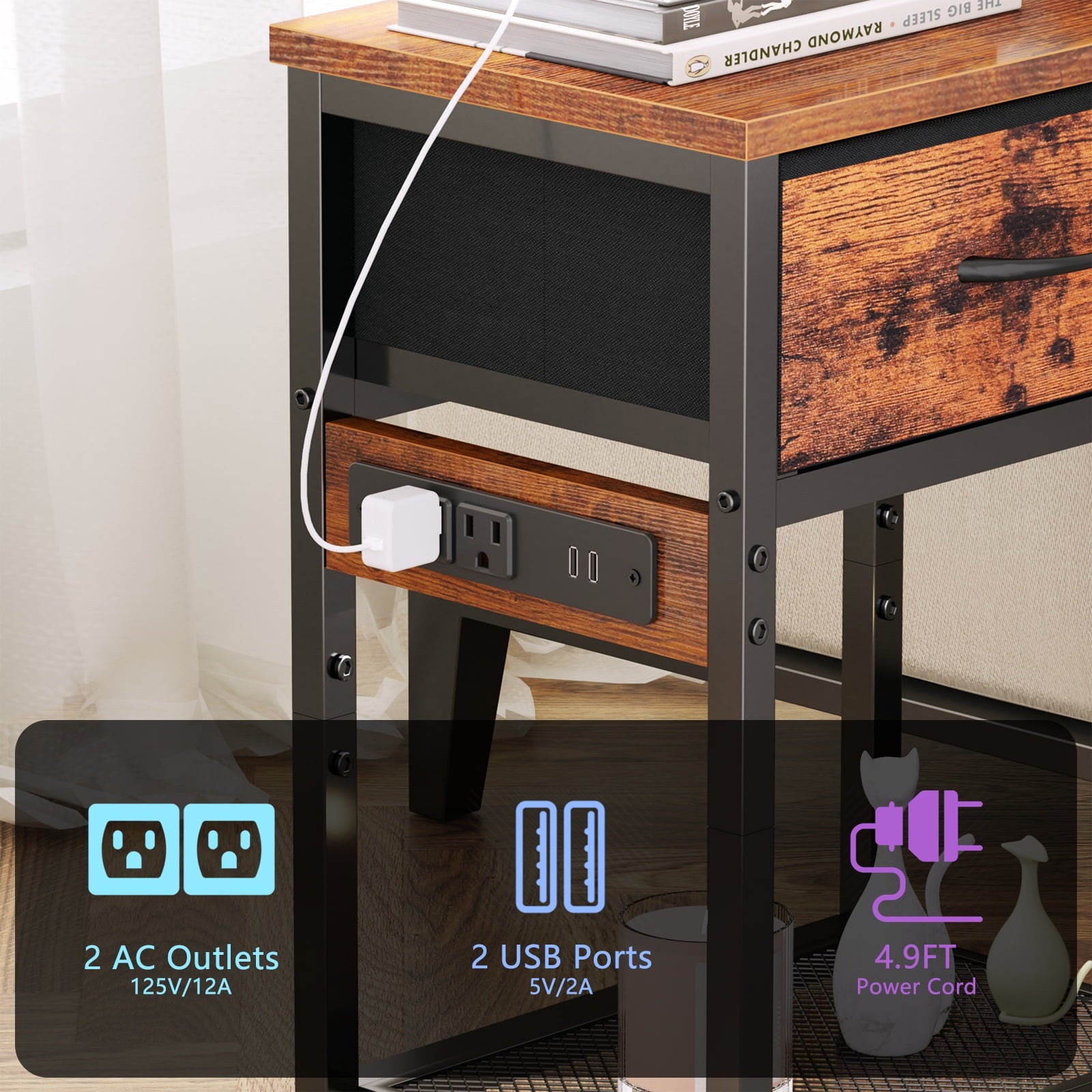 Satifur Nightstand features with charging station,1 fabric drawers,1 open speace and wooden table top.You can place alarm clock, album, table lamp,snacks,books and other daily necessities or exhibitions. Each of fabric drawers is designed with pull handles,so you can easily reach everything you want. The charging station with 2 AC outlets and 2 USB ports is enough to charge your laptop, phone etc, saving time and effort without looking for USB charging cable or outlets. Whether you're looking for a coffee table, side table or nightstand, Satifur can be satisfactory!