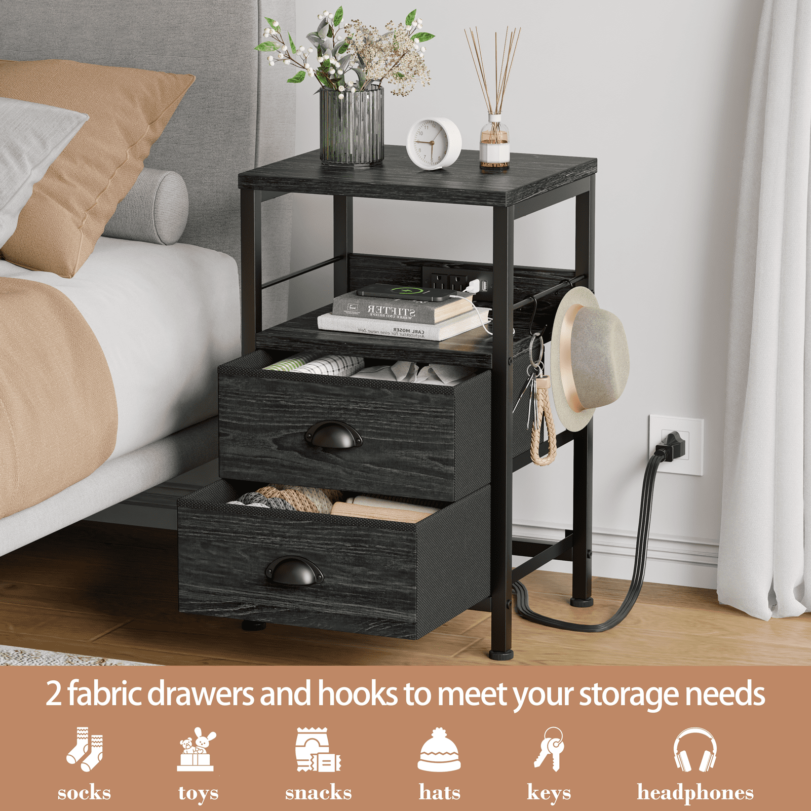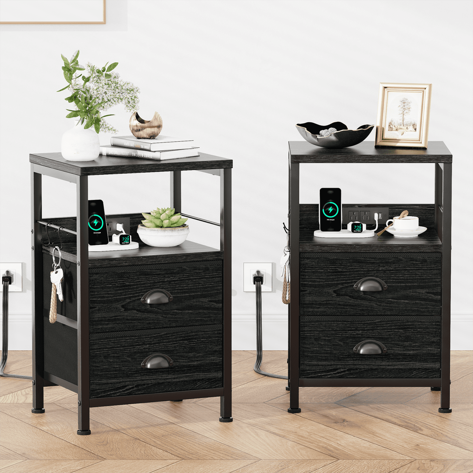 Satifur Nightstand with Charging Station, Set of 2 Bedside End Table with Fabric Drawers,Outlets & USB Ports,Black Oak