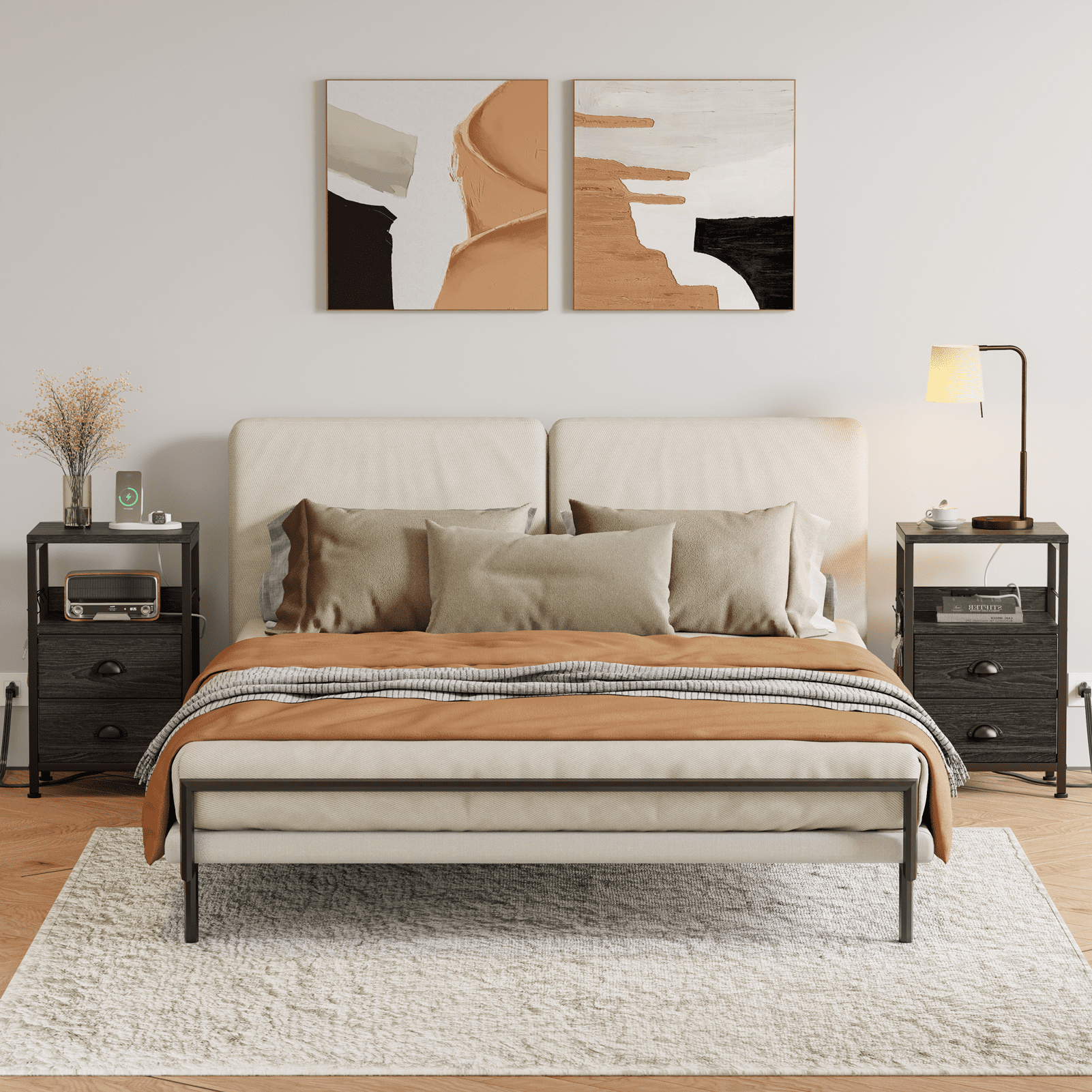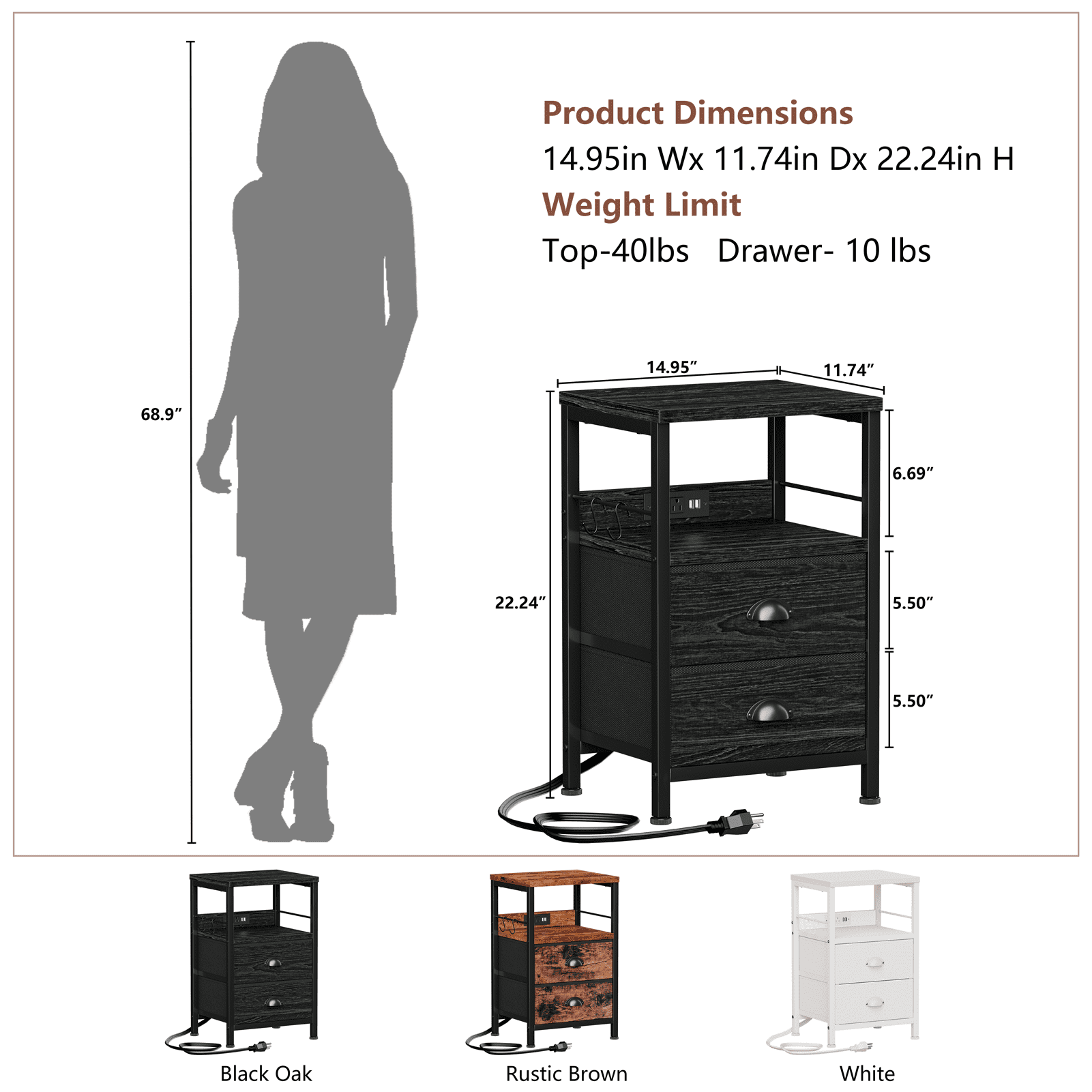 Satifur Set of 2 Nightstand with Charging Station, Bedside End Table with Fabric Drawers, 2 Outlets & 2 USB Ports, Black Oak: