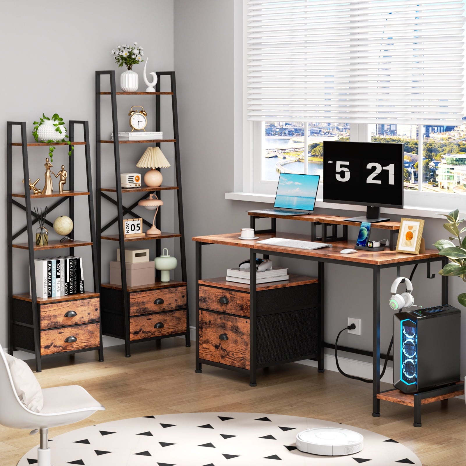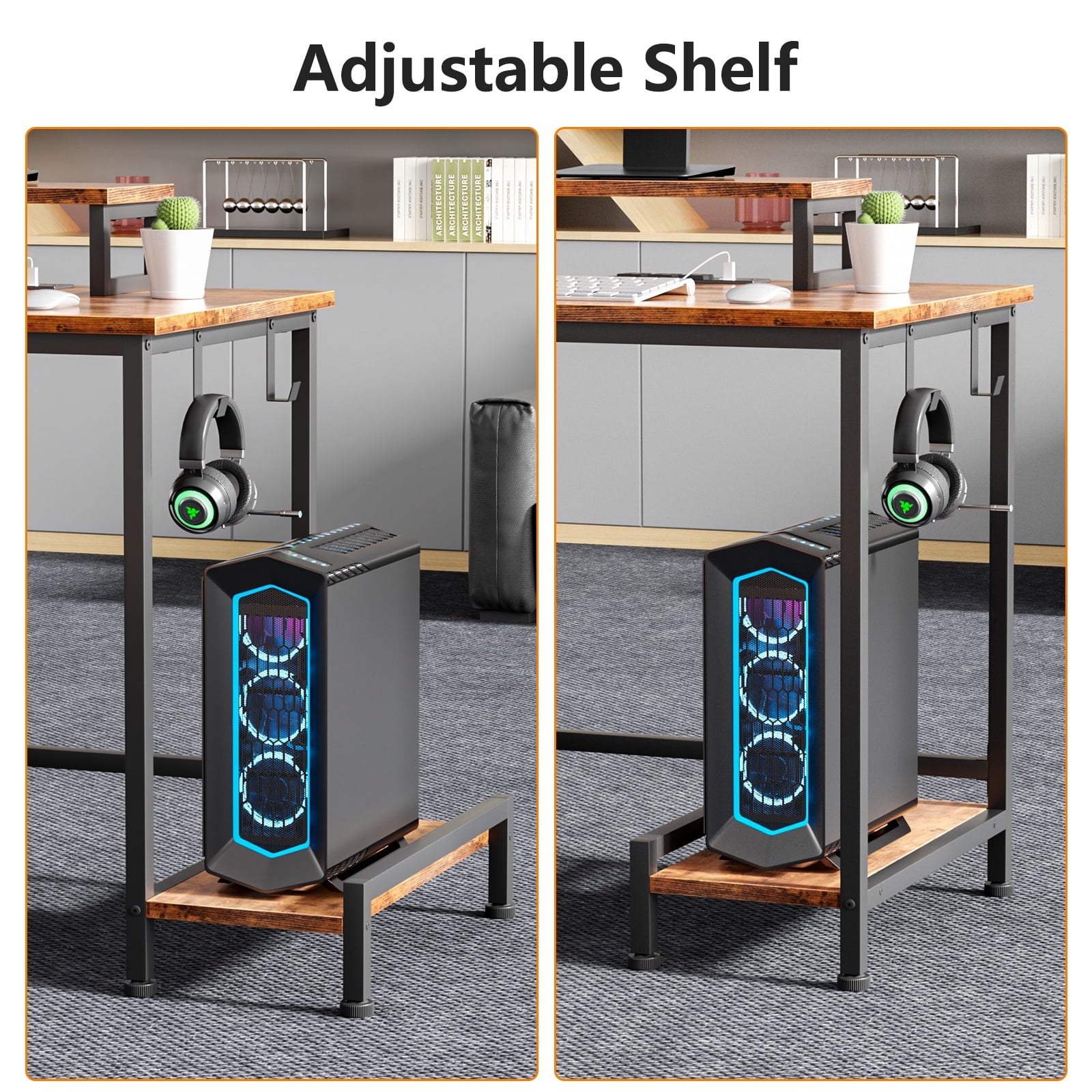 Satifur Office Desk with Drawers & Charging Station, Gaming Desk with Movable Monitor Stands, Corner Desk with Storage Shelves & File Cabinet, Rustic Brown
