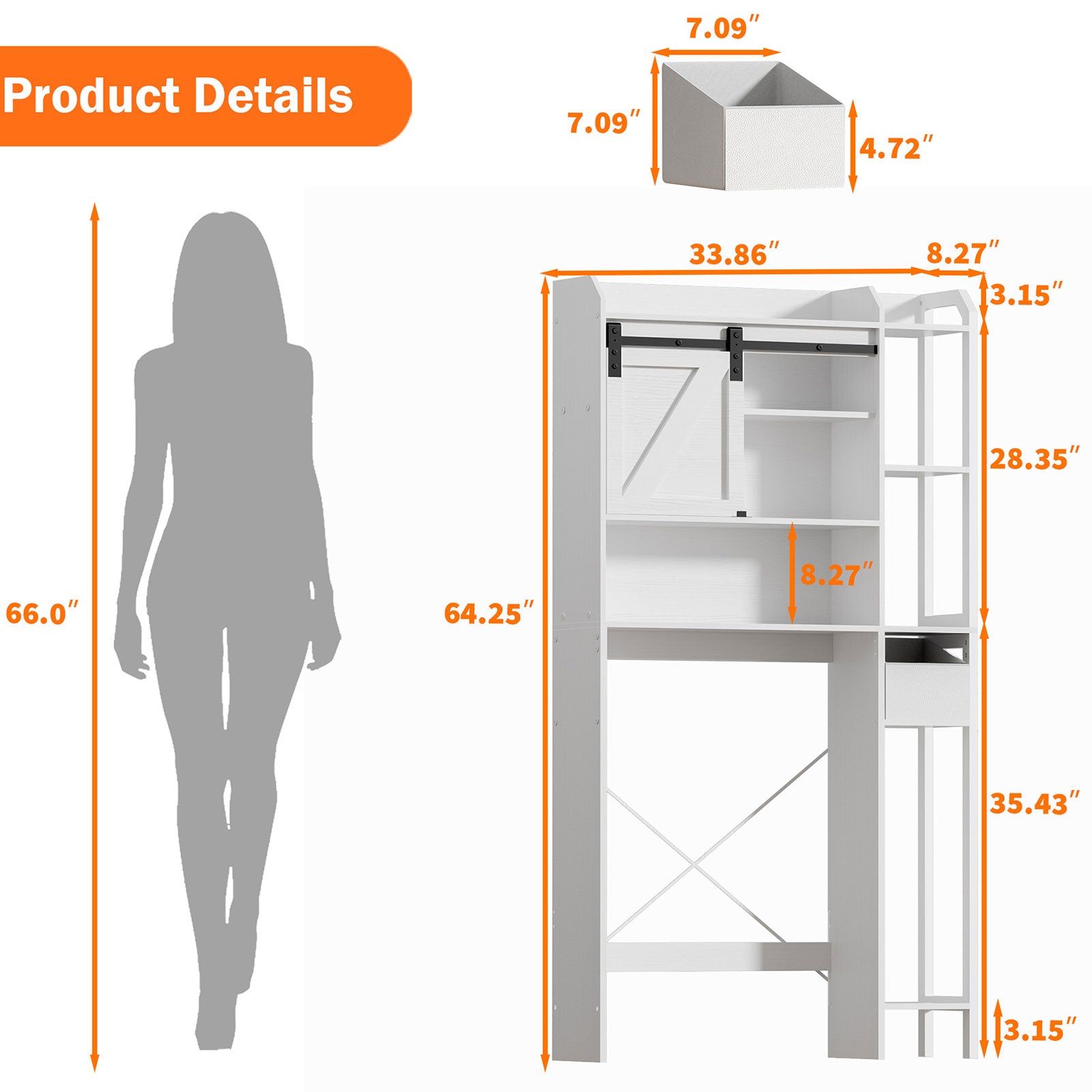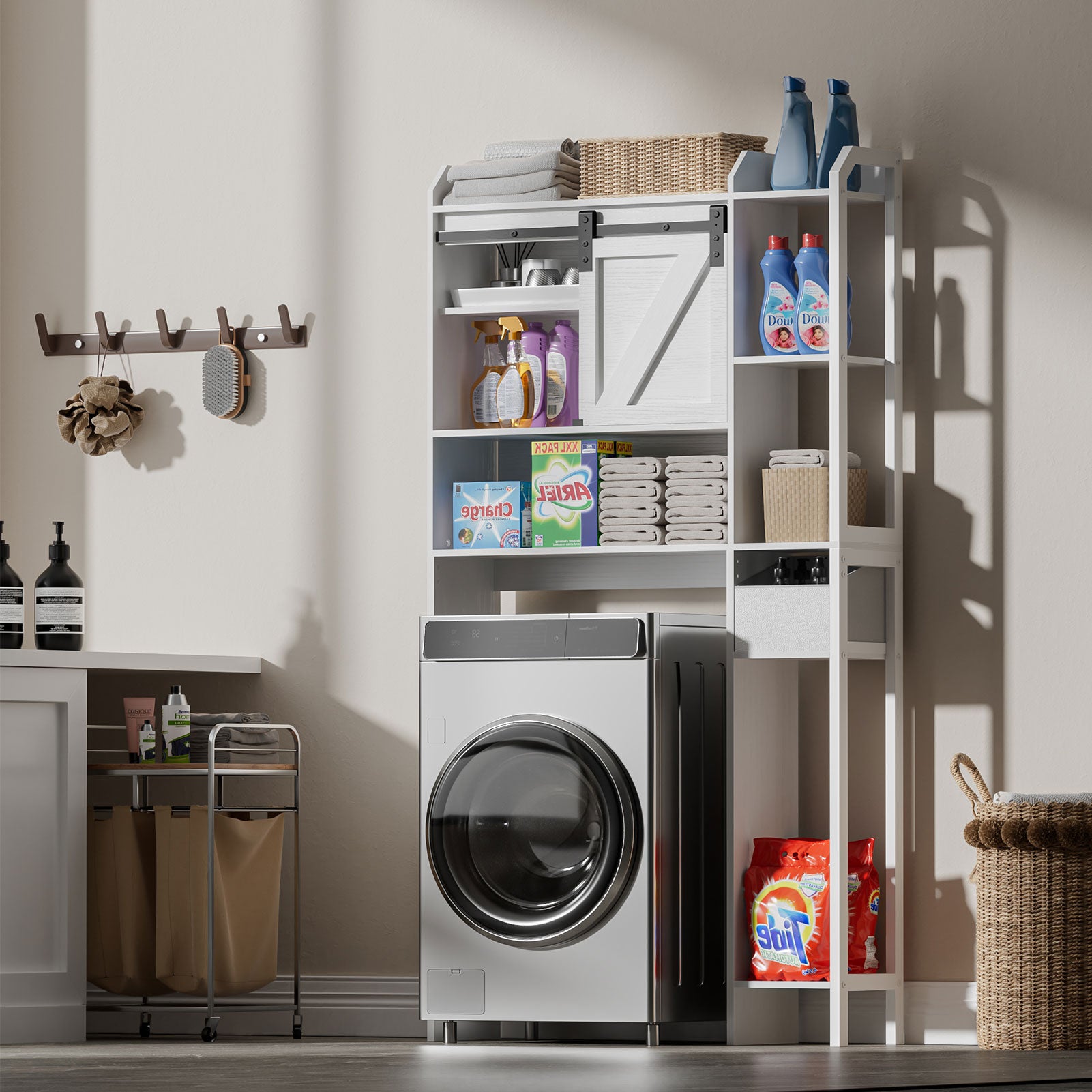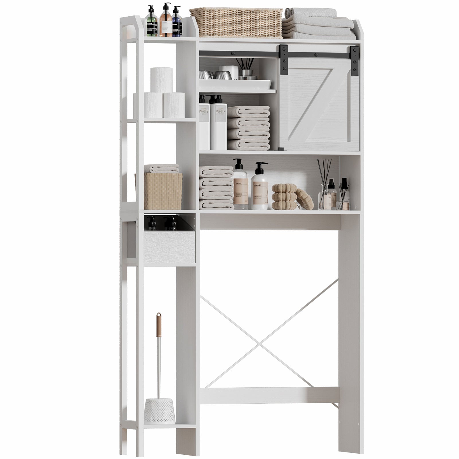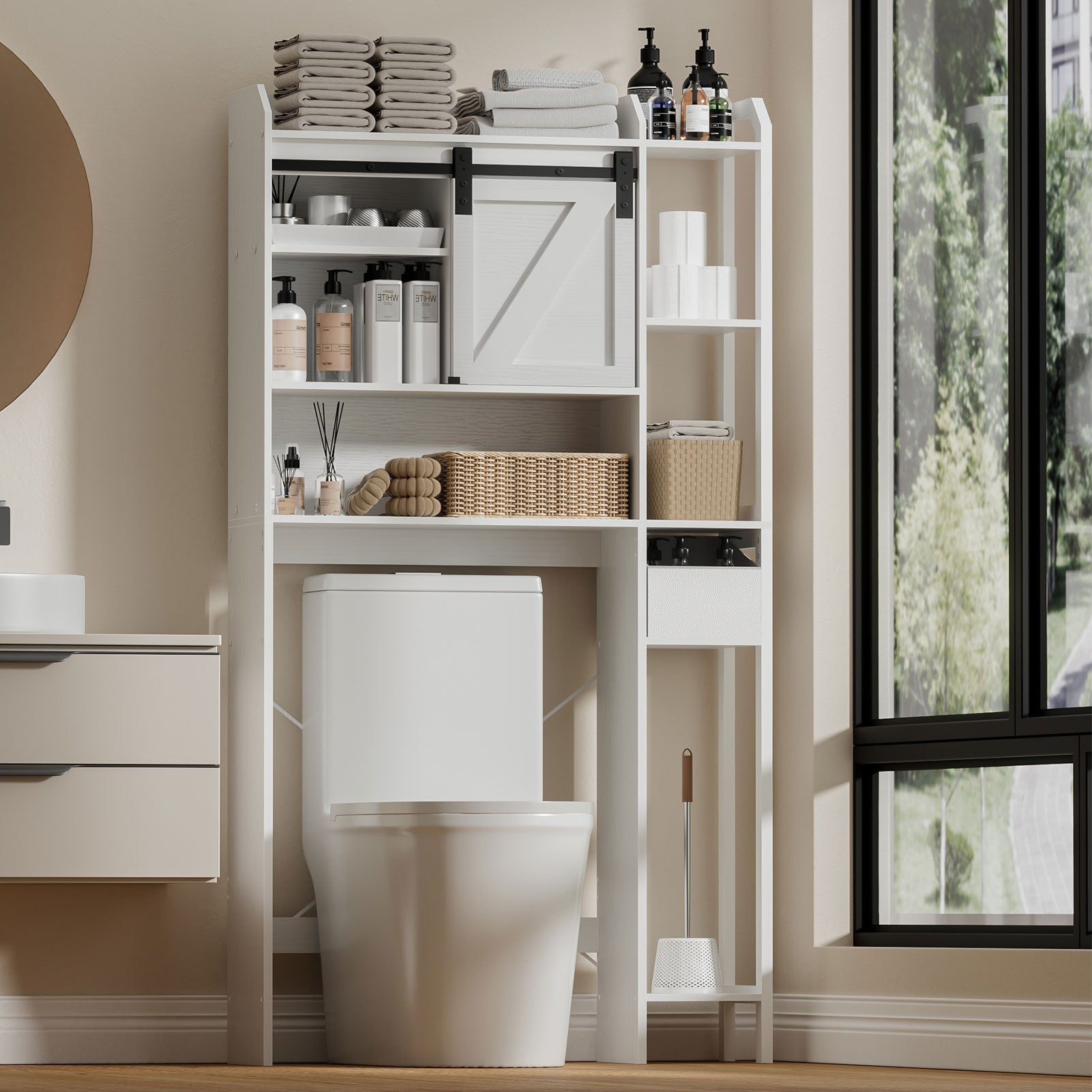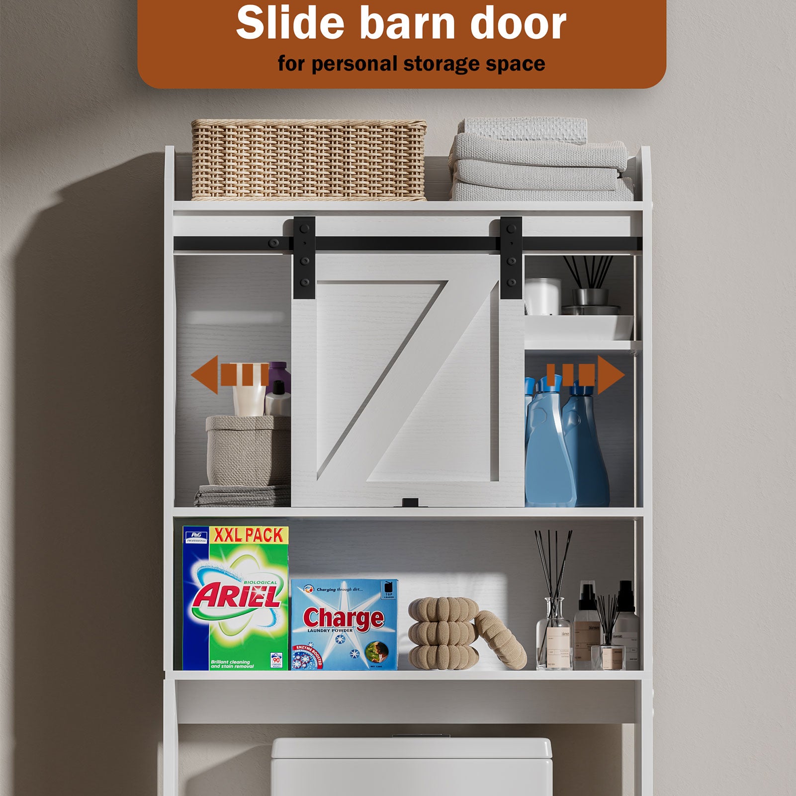 Satifur Over The Toilet Storage Cabinet, Bathroom Space Saver with Sliding Barn Door, 6-Tier Freestanding Bathroom Shelf Farmhouse Organizer, White
