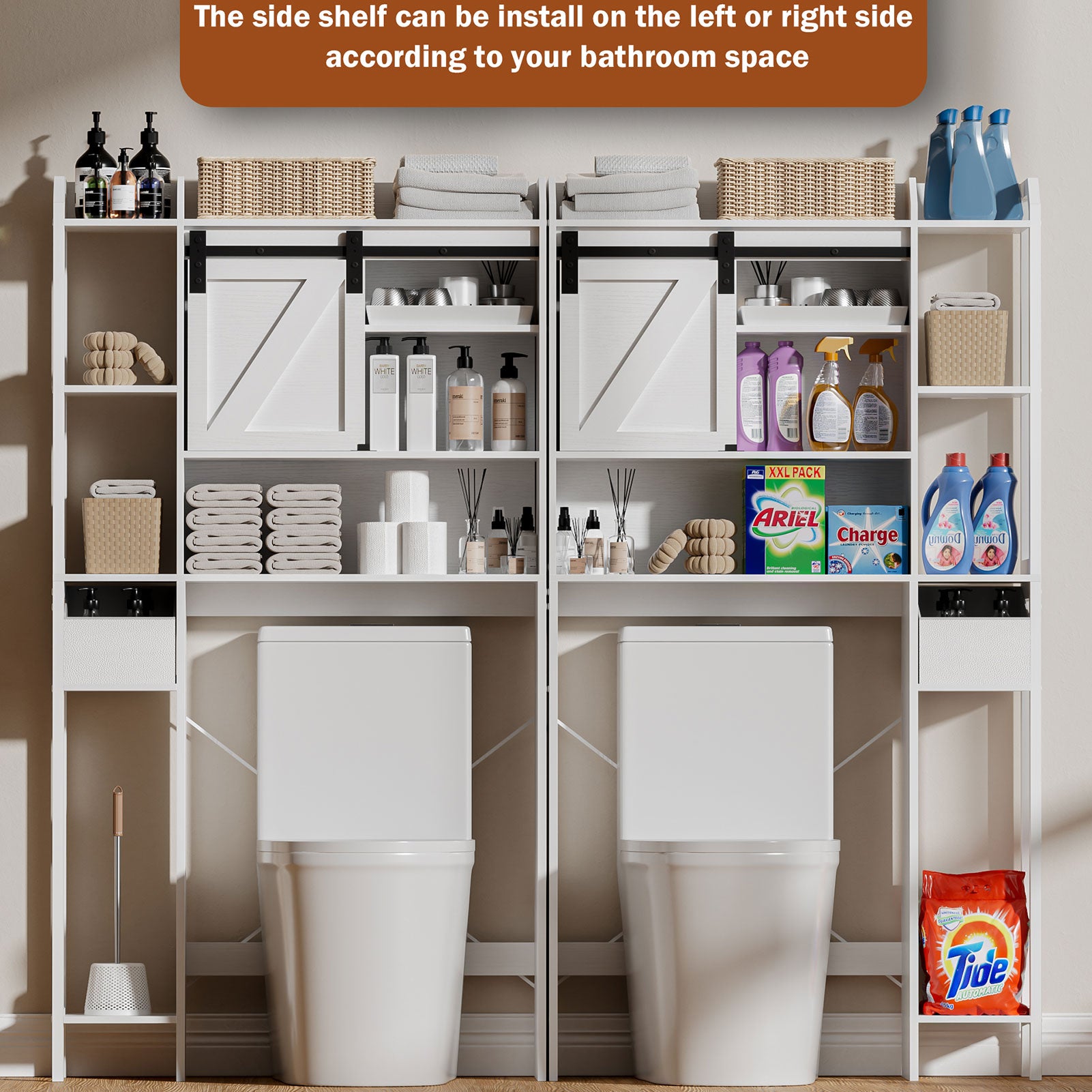 - This over toilet bathroom organizer features a storage cabinet with doors for storing toiletries out of sight and an additional open shelf at the bottom for easy access or display. And you can lnstall the side shelf on the left or right depending on you preference.
