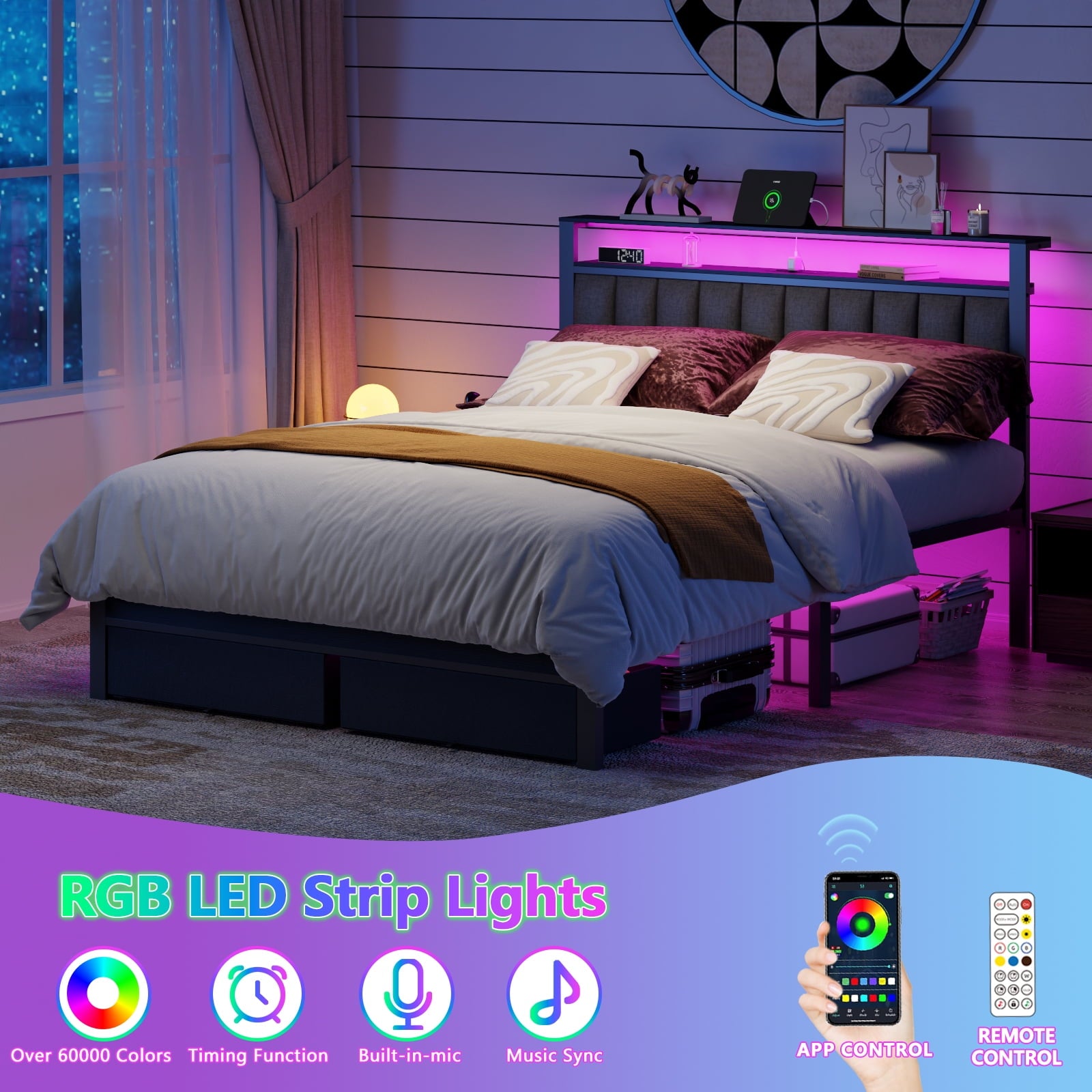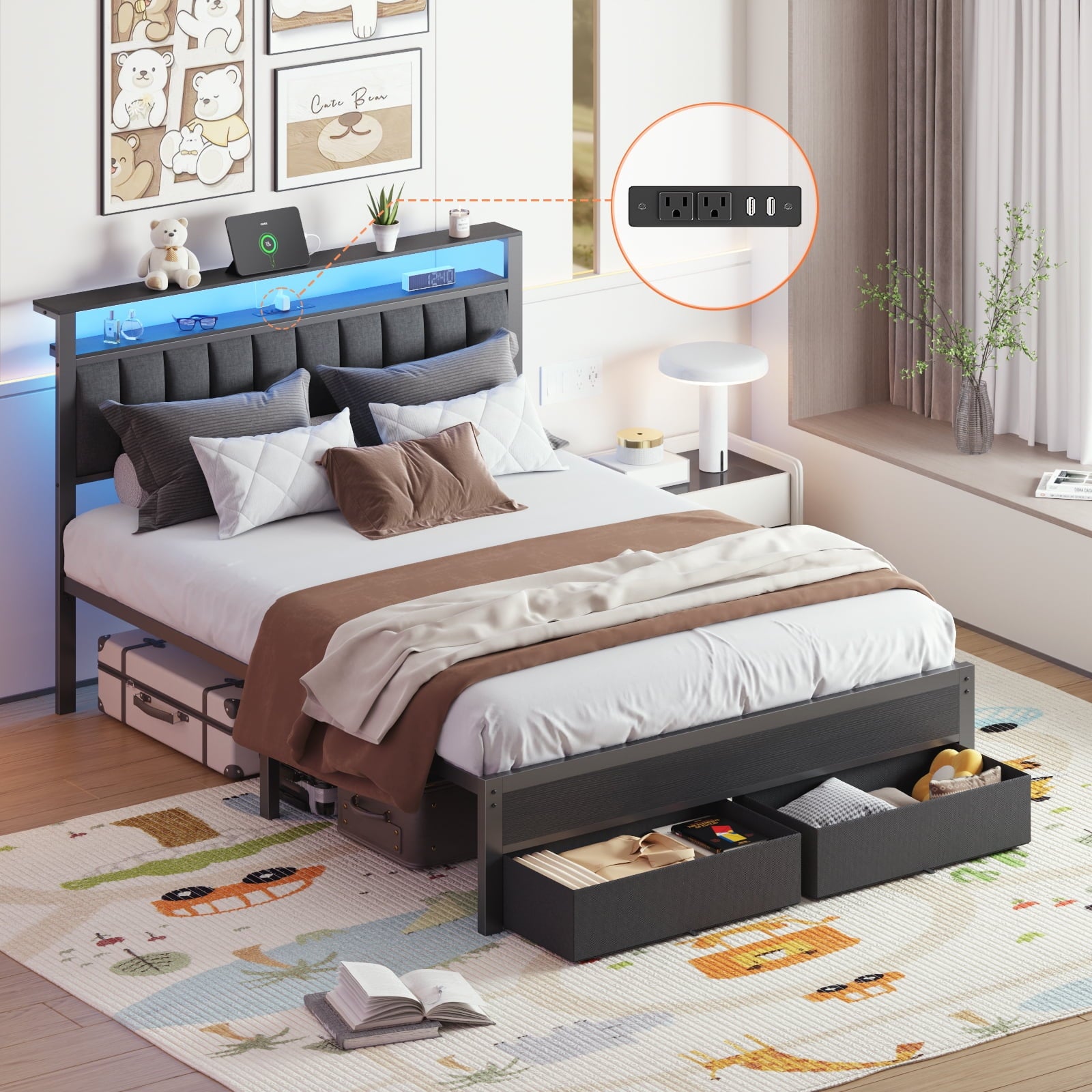 Satifur Queen Bed Frame with 2 USB Ports & Upholstered Headboard & 2 Storage Drawers, Black