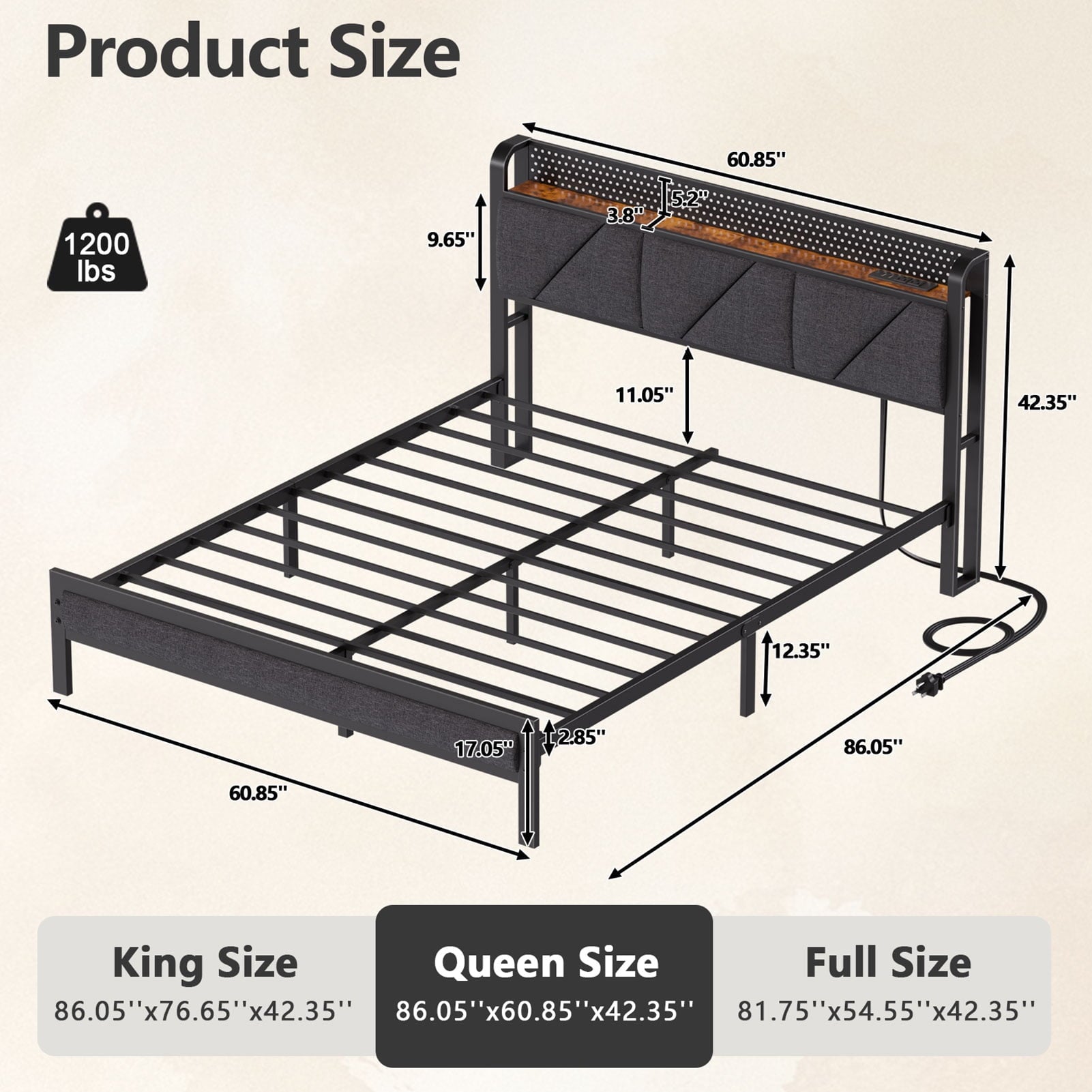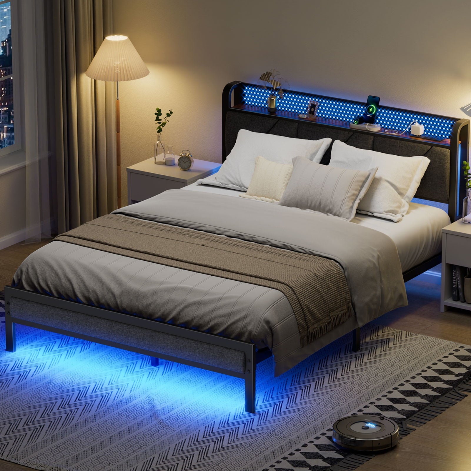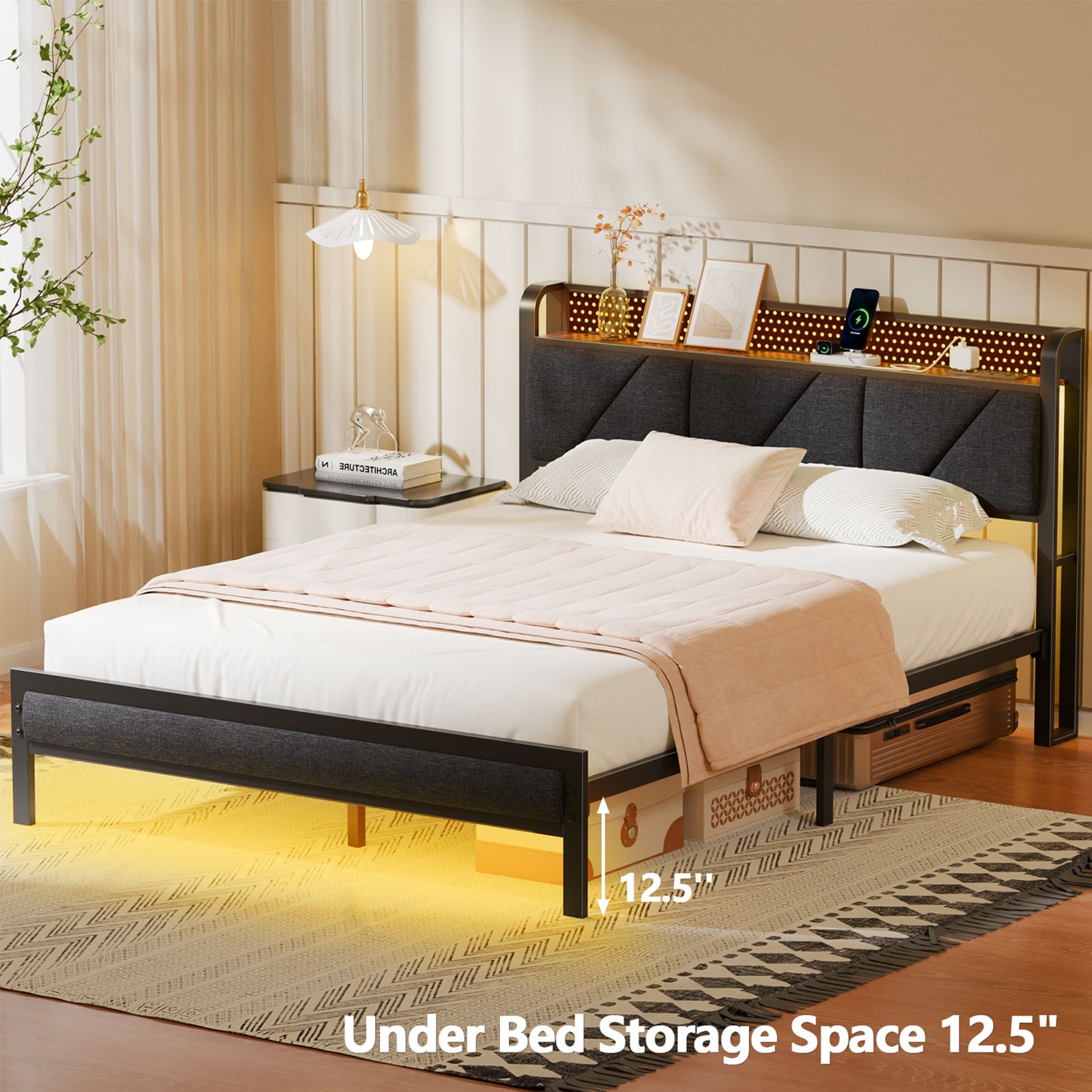 Satifur Queen Bed Frame with Upholstered Storage Headboard, Metal Platform Bed Station with Charging Station & LED, Noise-Free.No Box Spring Needed