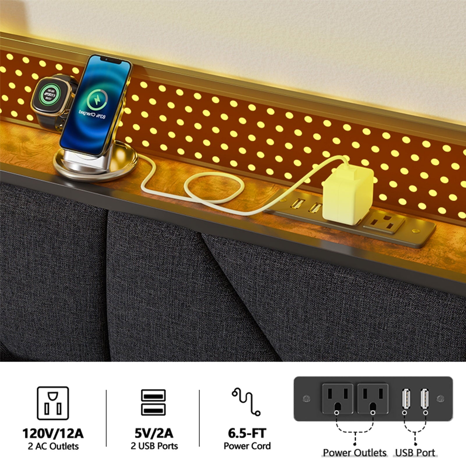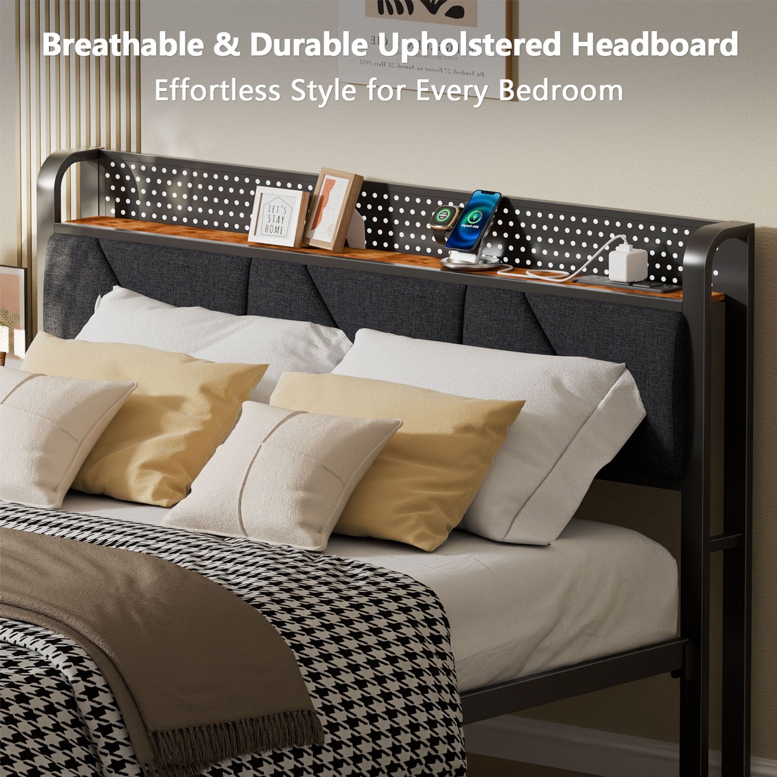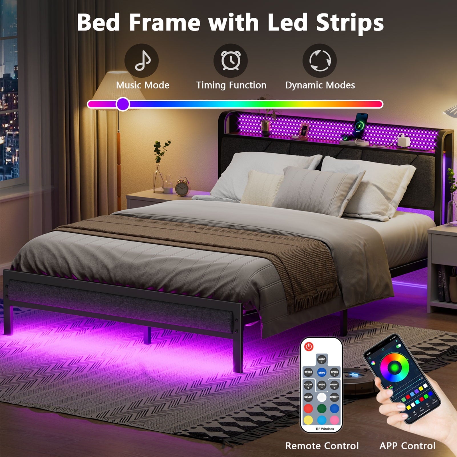 Satifur Queen Bed Frame with Upholstered Storage Headboard, Metal Platform Bed Station with Charging Station & LED, Noise-Free.No Box Spring Needed