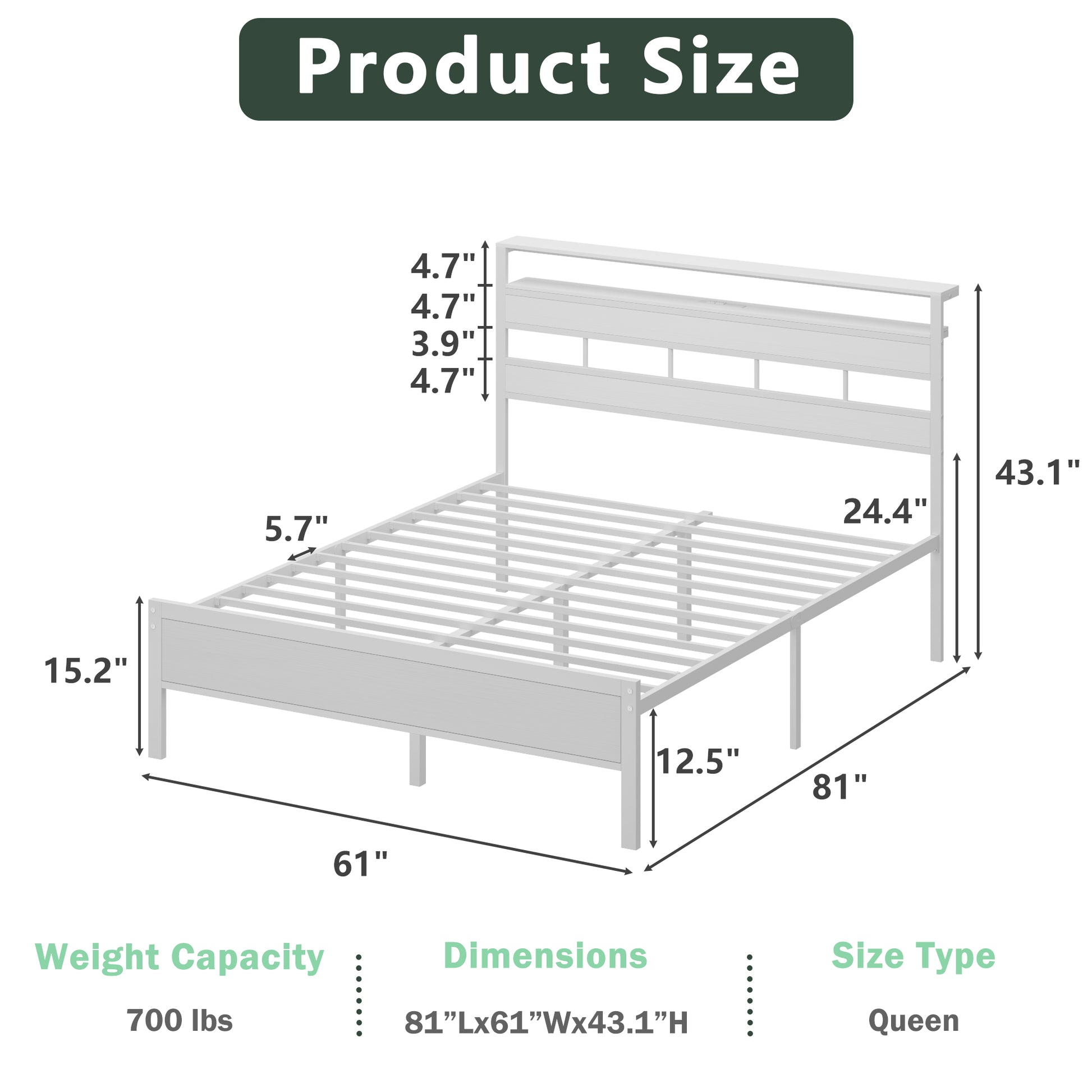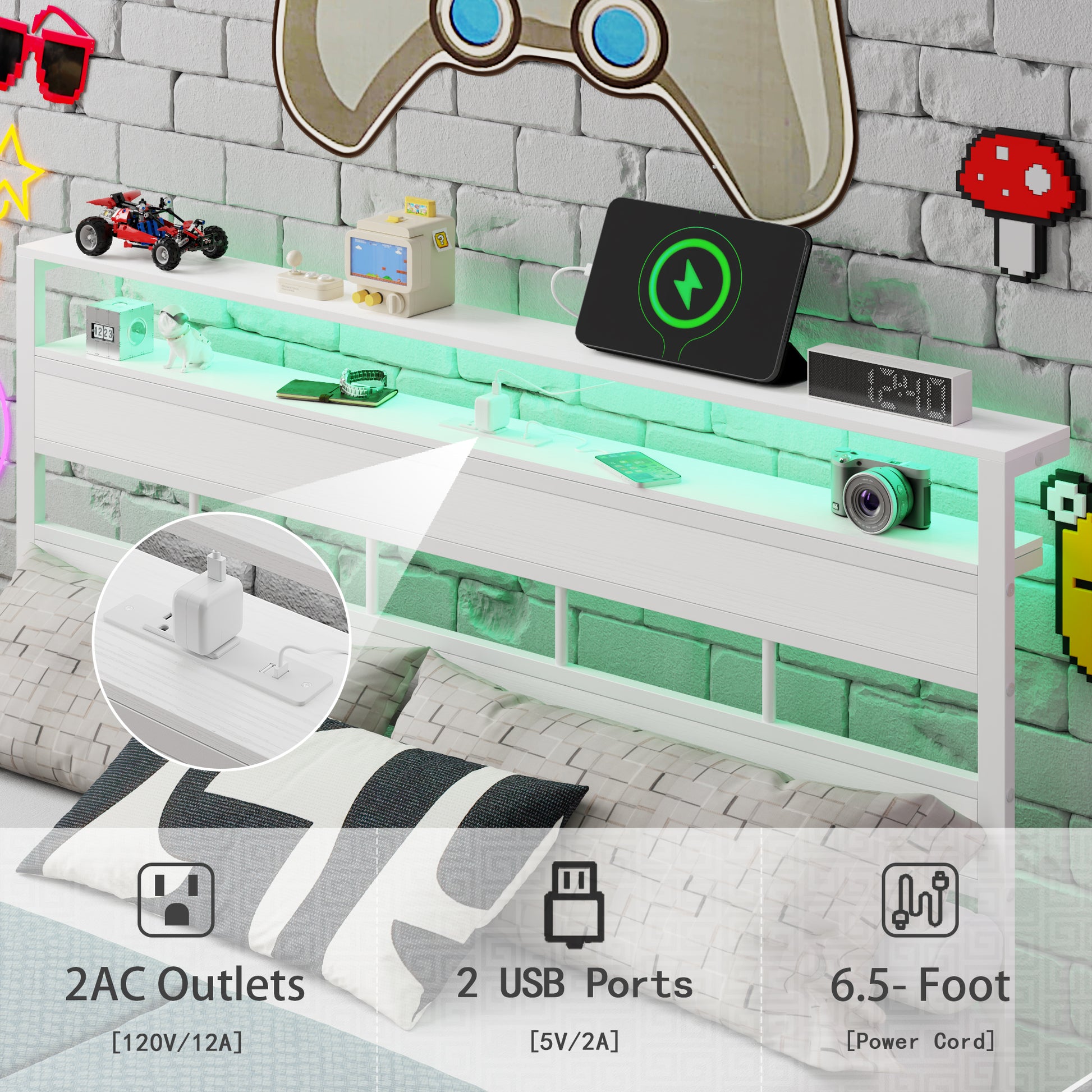 Satifur Queen Bed Frames with Charging Station and LED Lights, Queen Size Platform Bed with Wood Headboard & 2-Tier Storage Shelves, No Box Spring Needed, White