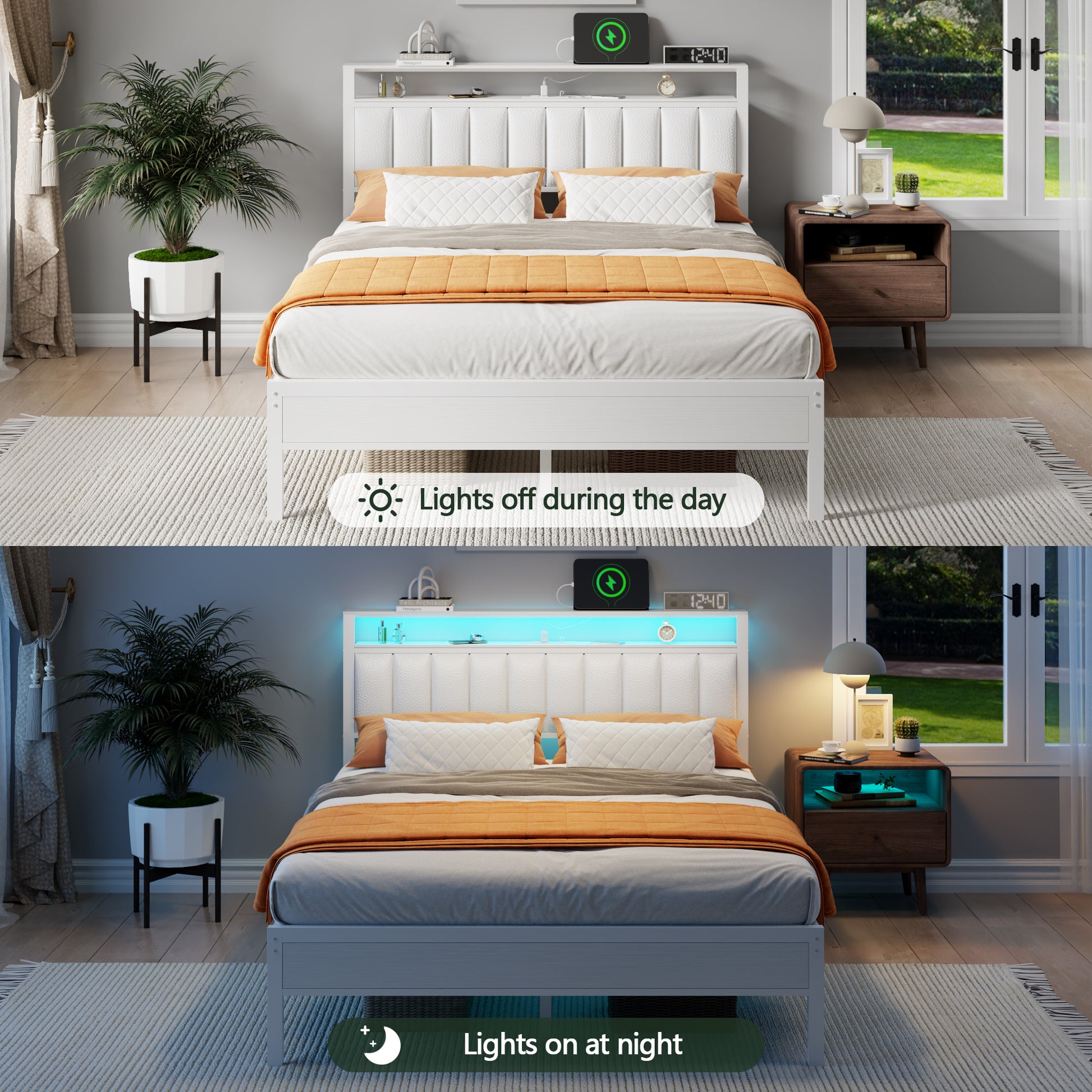 Satifur Queen Bed Frames with LED Lights & Charging Station, Platform Bed with Metal Slats, Headboard with 2-Tier Storage Shelves, No Box Spring Needed, White
