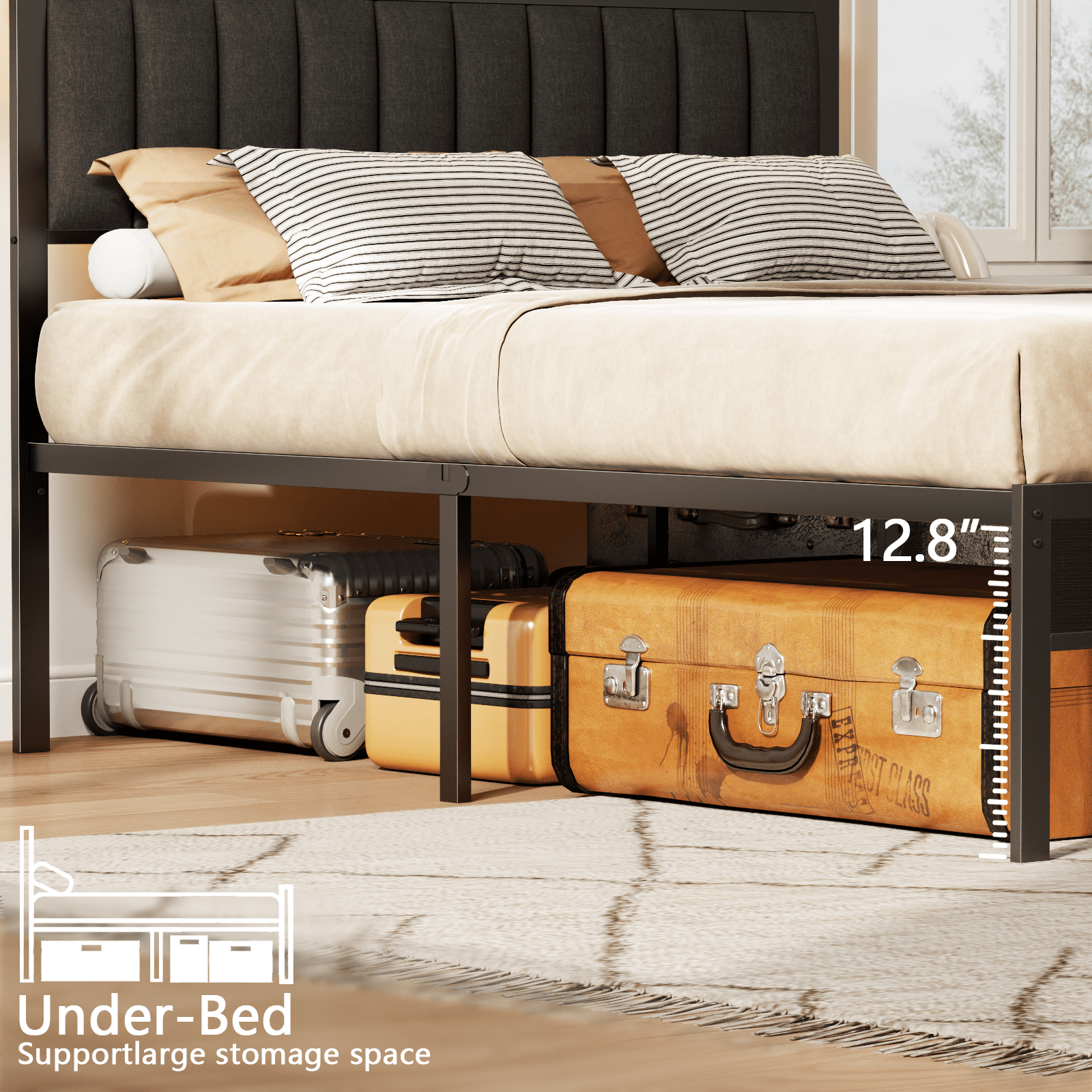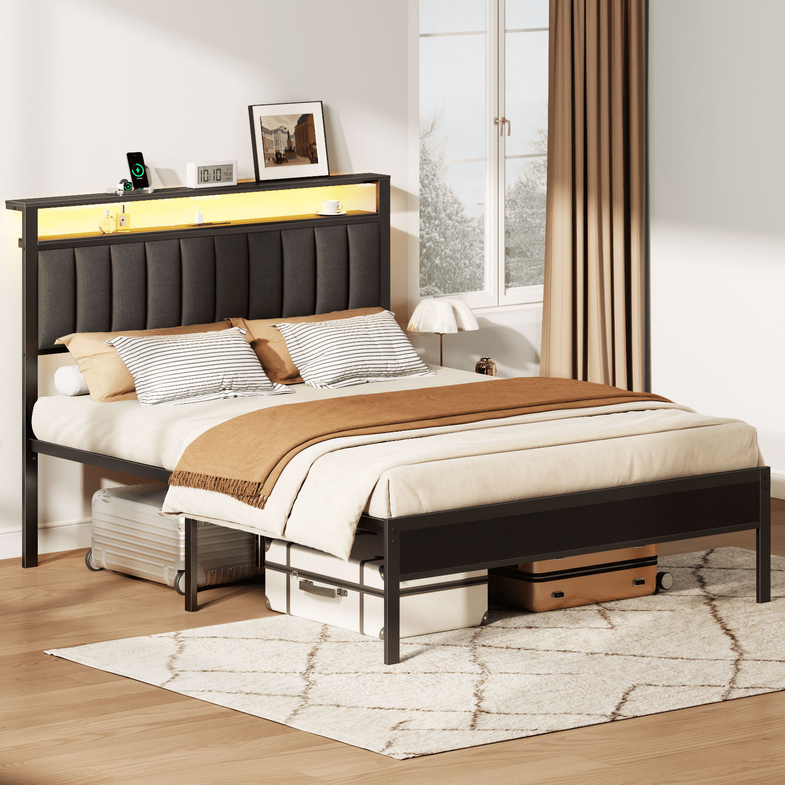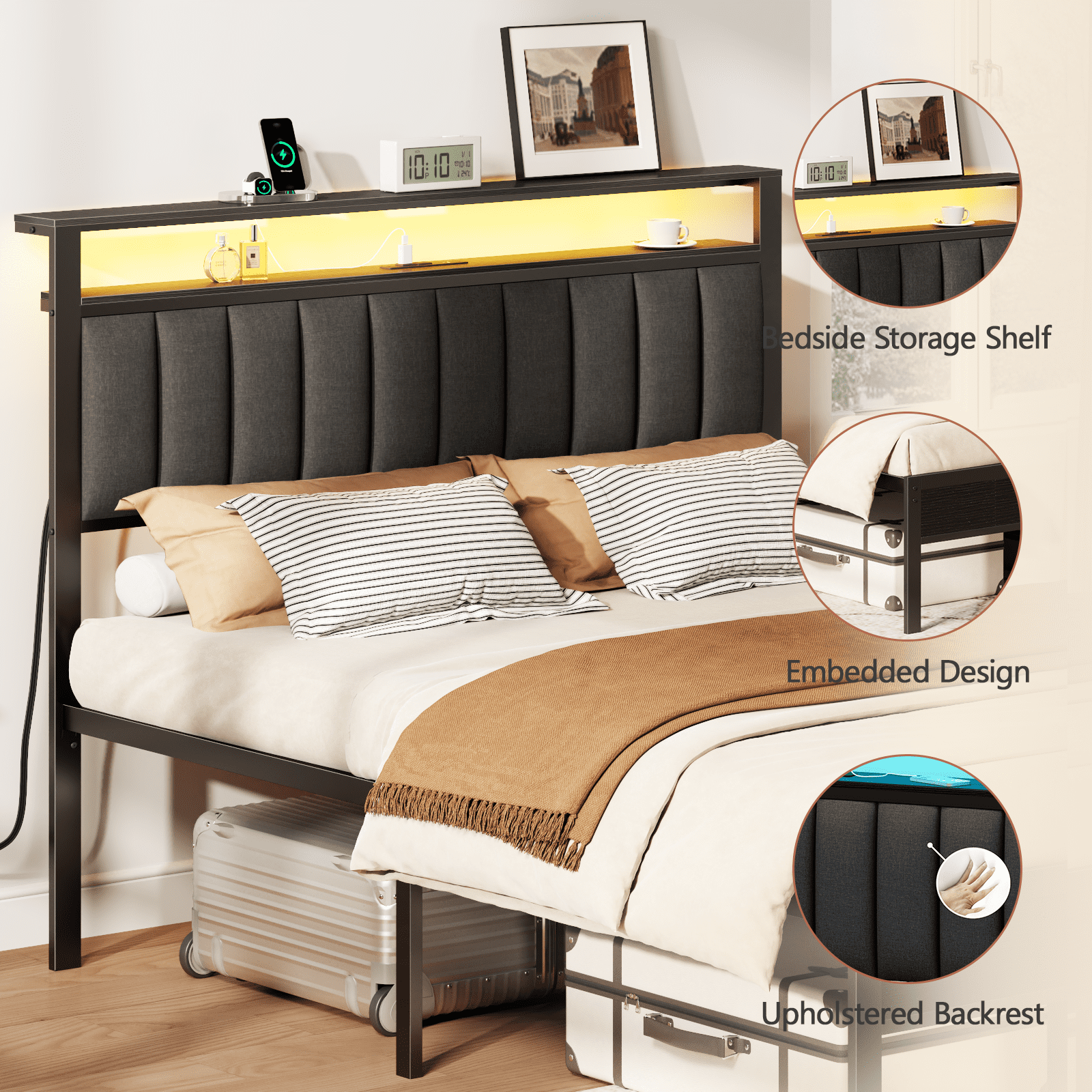 Satifur Queen LED Bed Frame with Smart RGB Lights, Headboard Charging Station, Versatile Storage Solution, Comfortable Upholstered Backrest, No Box Spring Needed