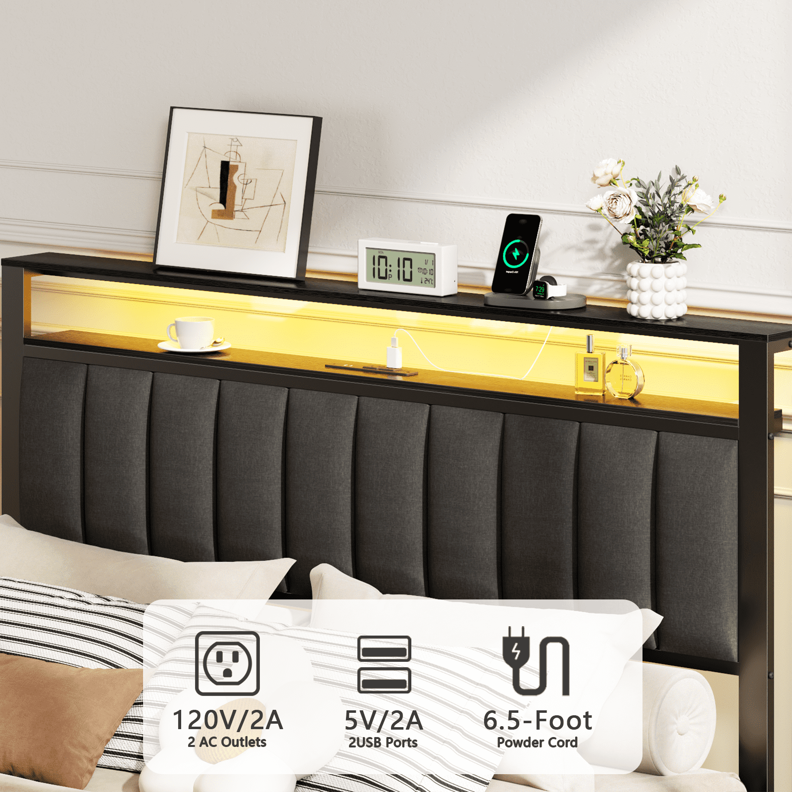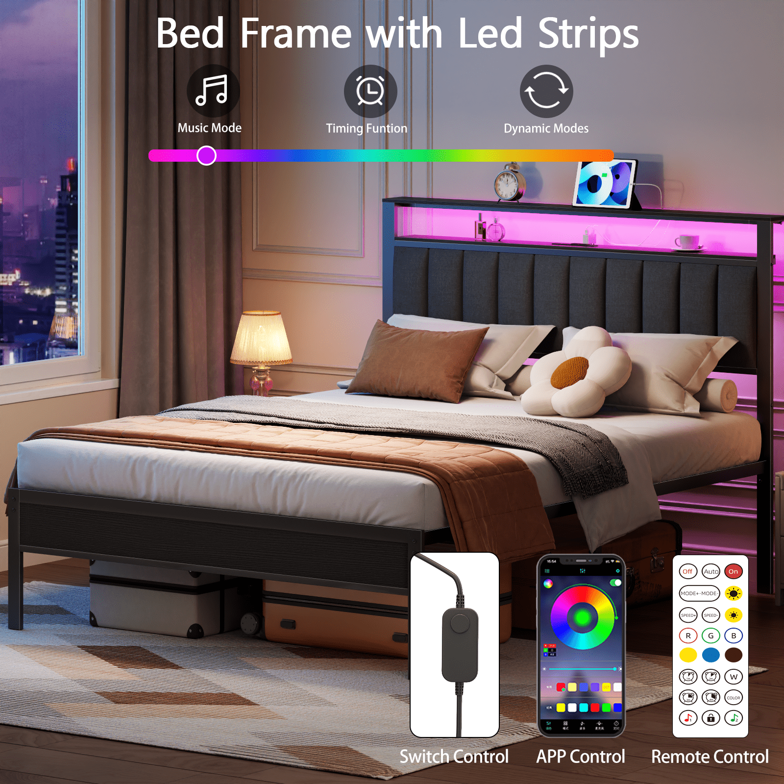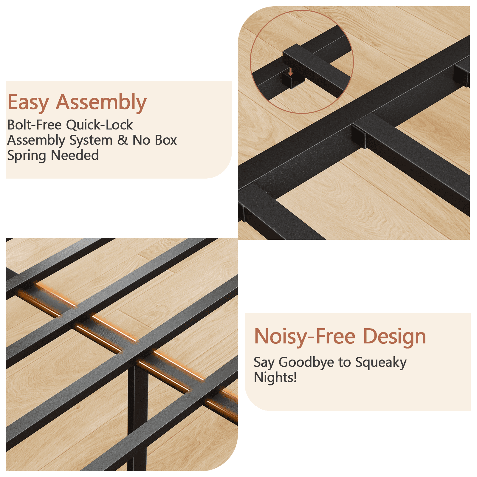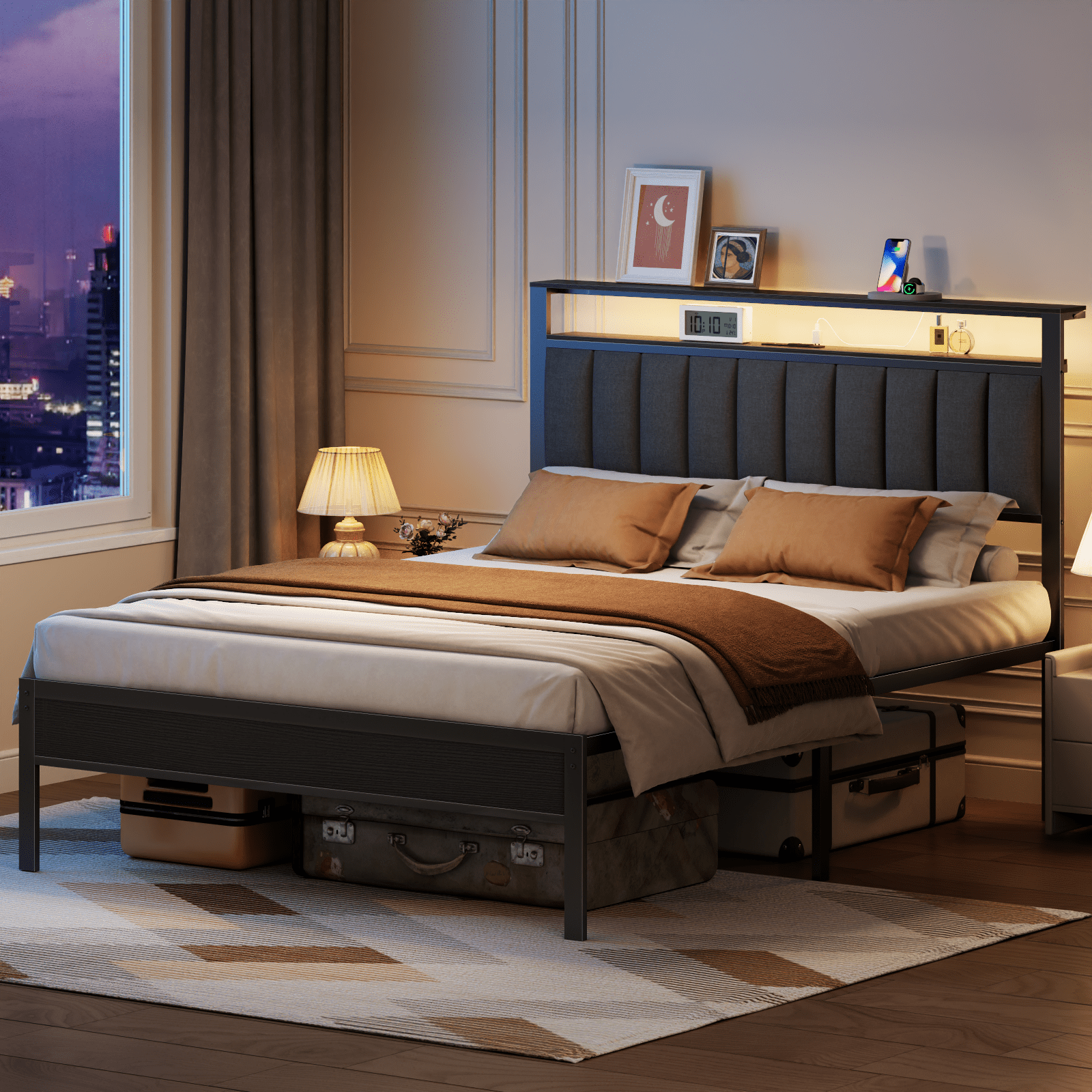 Satifur Queen Metal Bed Frame with 2 USB Ports & Upholstered Headboard, Black