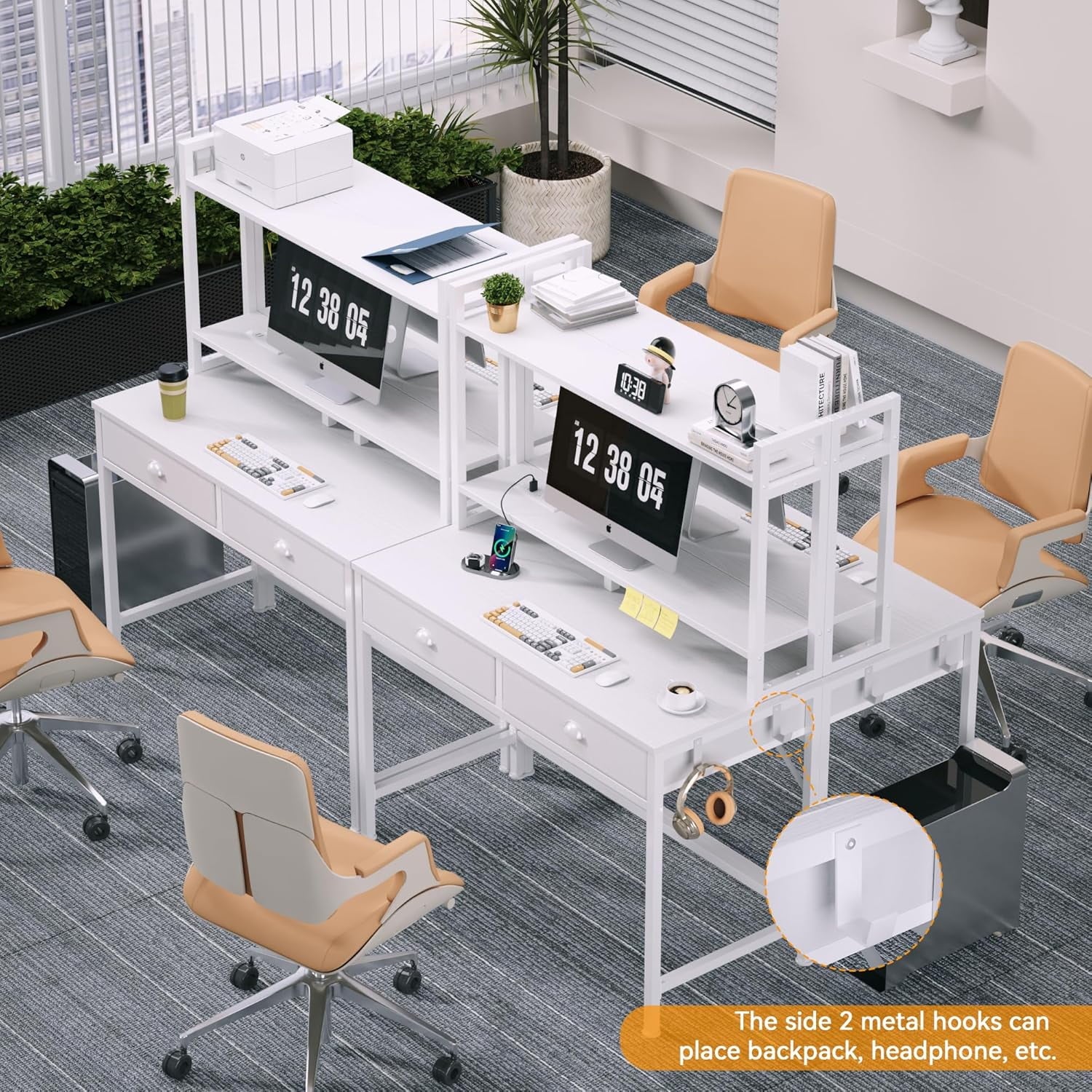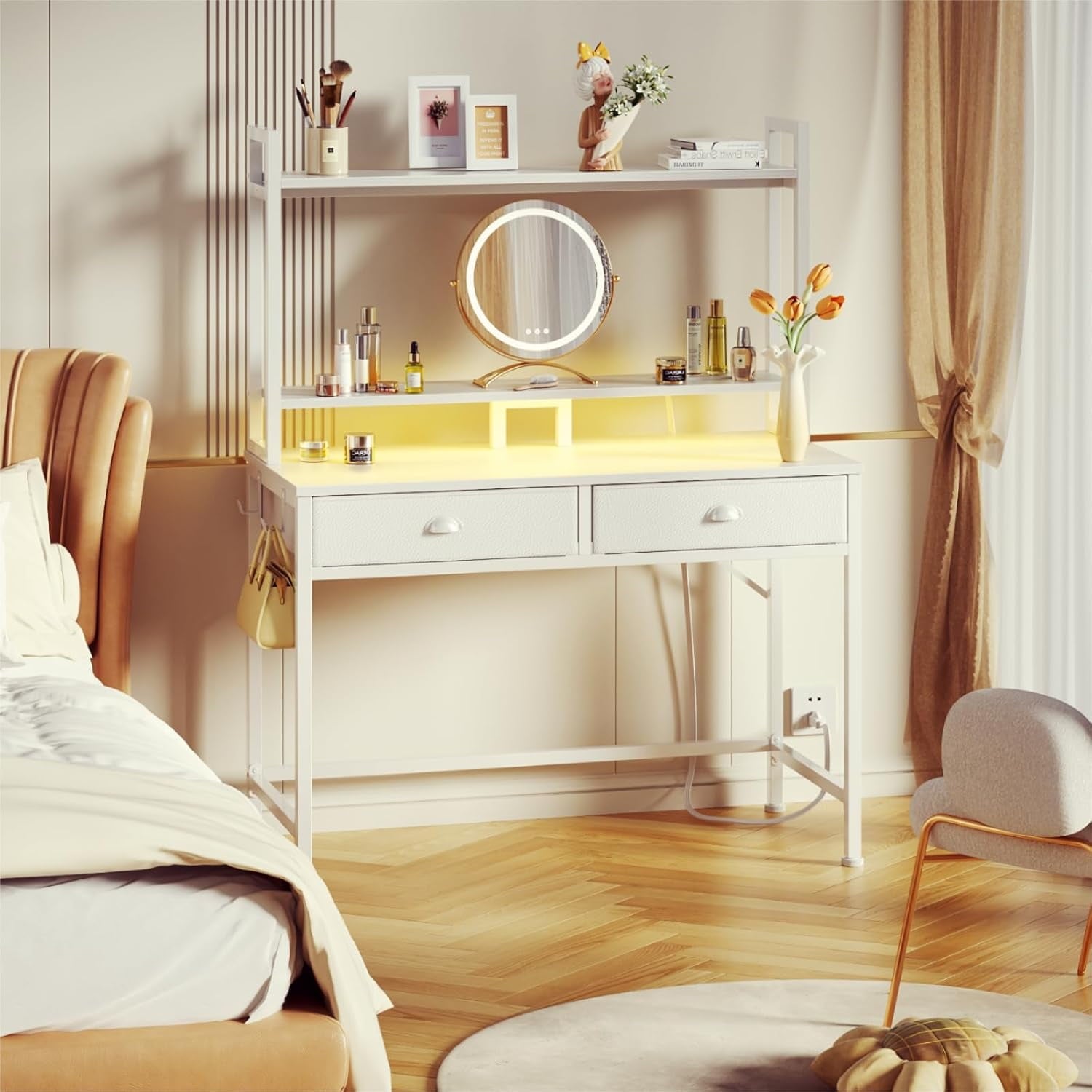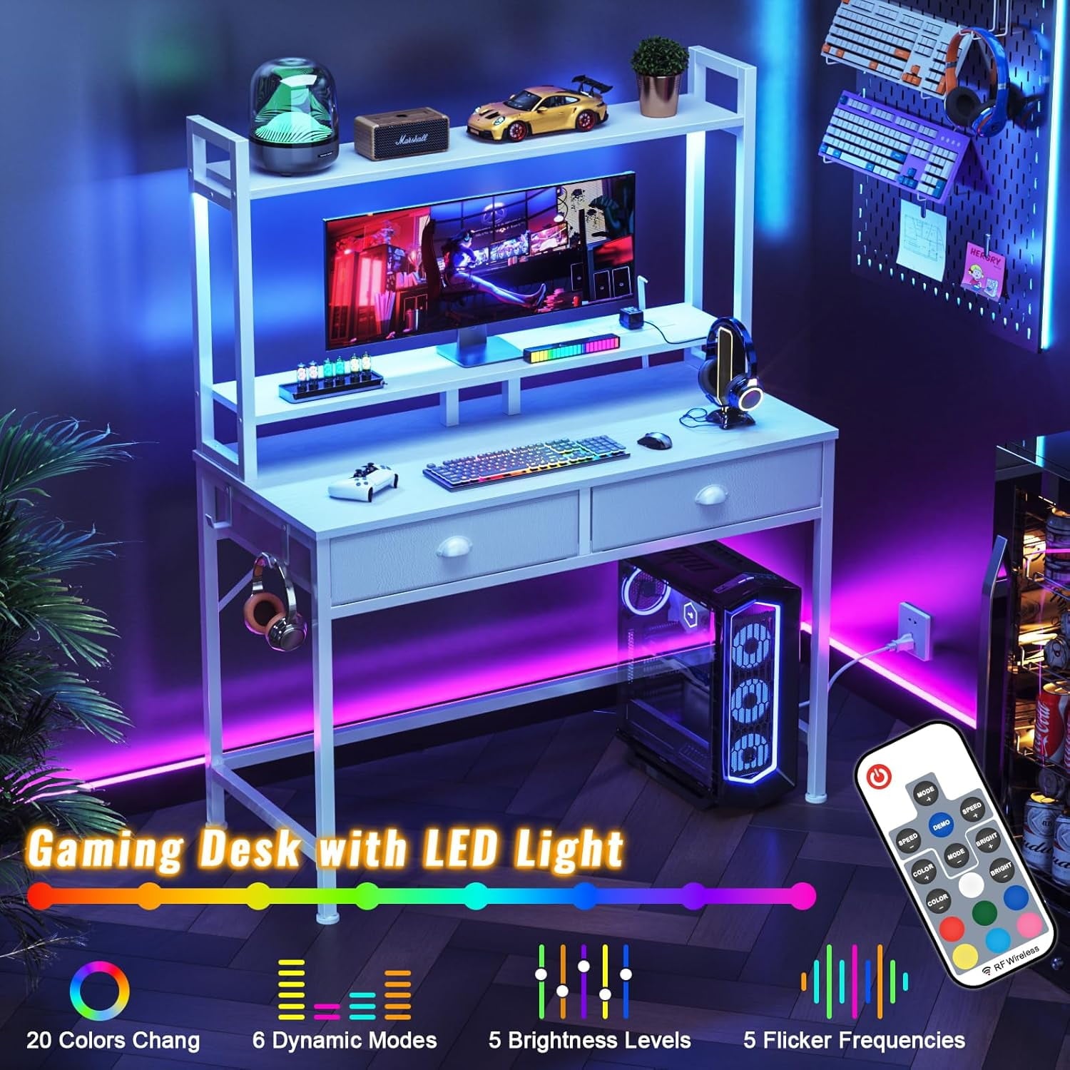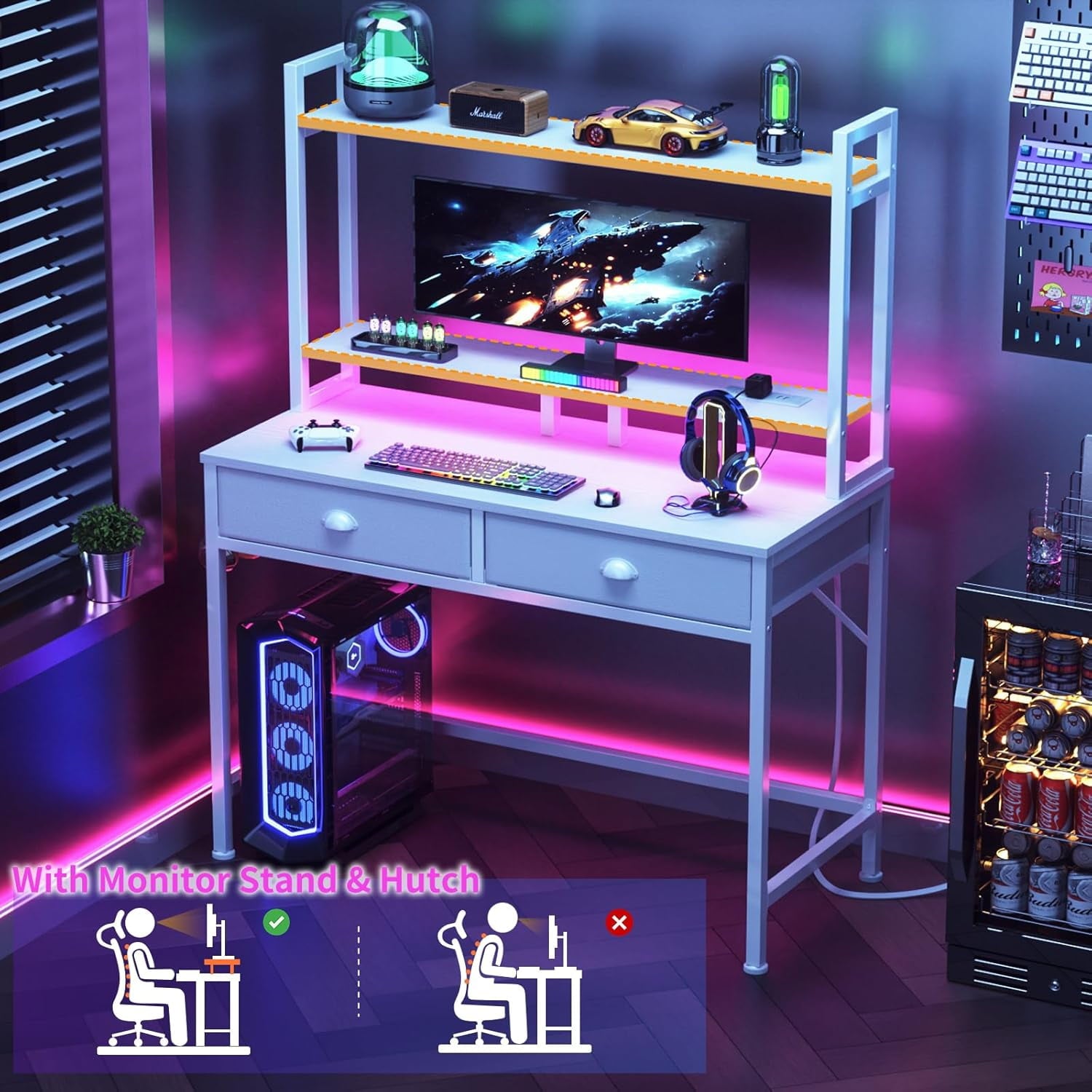 Satifur Small Computer Desk with Power Outlet & 2 Fabric Drawers, Gaming Desk with LED Light and Monitor Stand, Home Office Desk with Shelf and Hutch for Small Space, White
