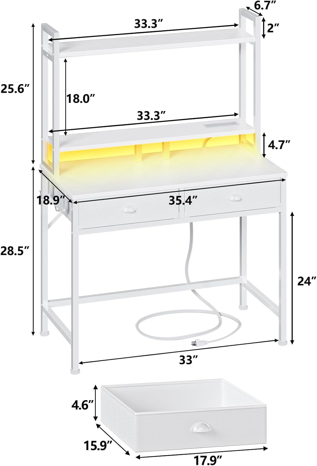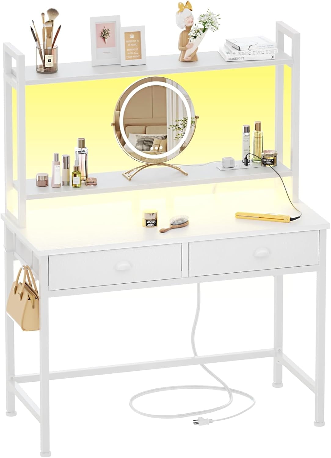 Satifur Small Computer Desk with Power Outlet & 2 Fabric Drawers, Gaming Desk with LED Light and Monitor Stand, Home Office Desk with Shelf and Hutch for Small Space, White-1