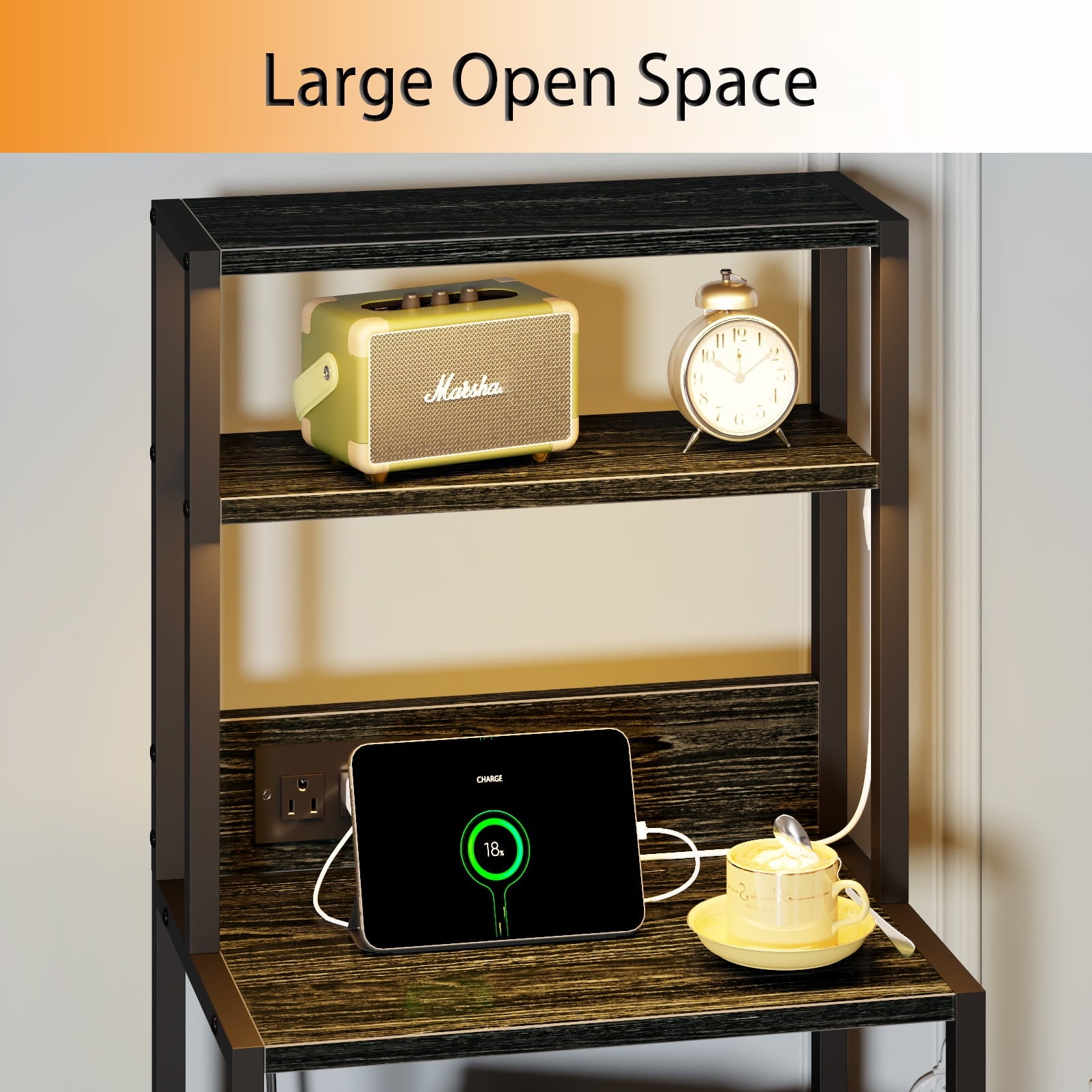 This versatile nightstand offers a perfect blend of style and functionality for your bedroom. Featuring a built-in charging station with 2 AC outlets and 2 USB ports, it allows you to conveniently power up your devices. The adjustable LED lighting with cool, white, and warm color options creates a cozy ambiance, while the 4 open shelves and 2 fabric drawers provide ample storage for your essentials. Crafted with high-quality wooden shelves and a sturdy metal frame, this durable nightstand can support up to 50 lbs on the top and 11 lbs in each drawer, ensuring long-lasting use. With easy assembly and a sleek black oak finish, this nightstand is a practical and stylish addition to your bedroom decor.
