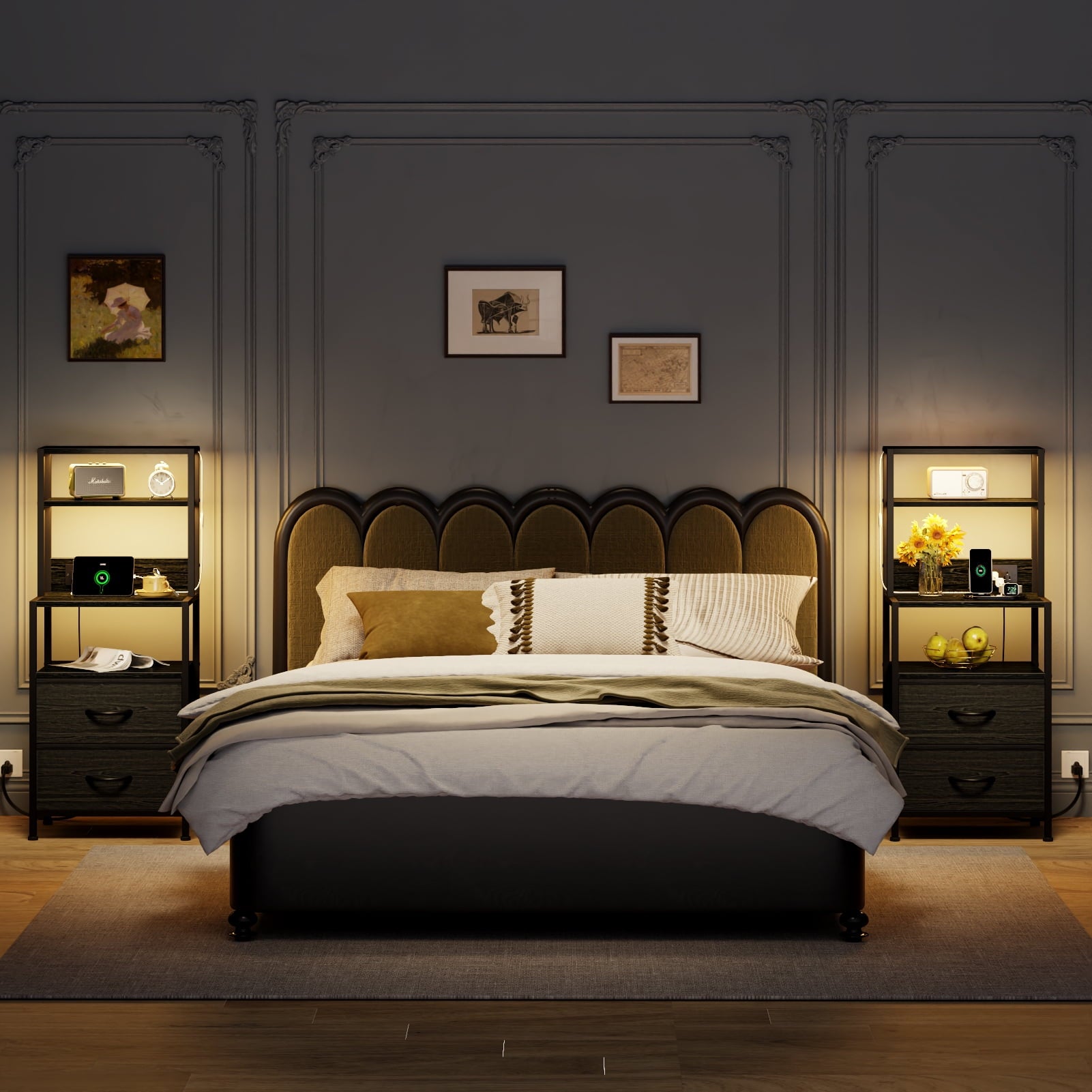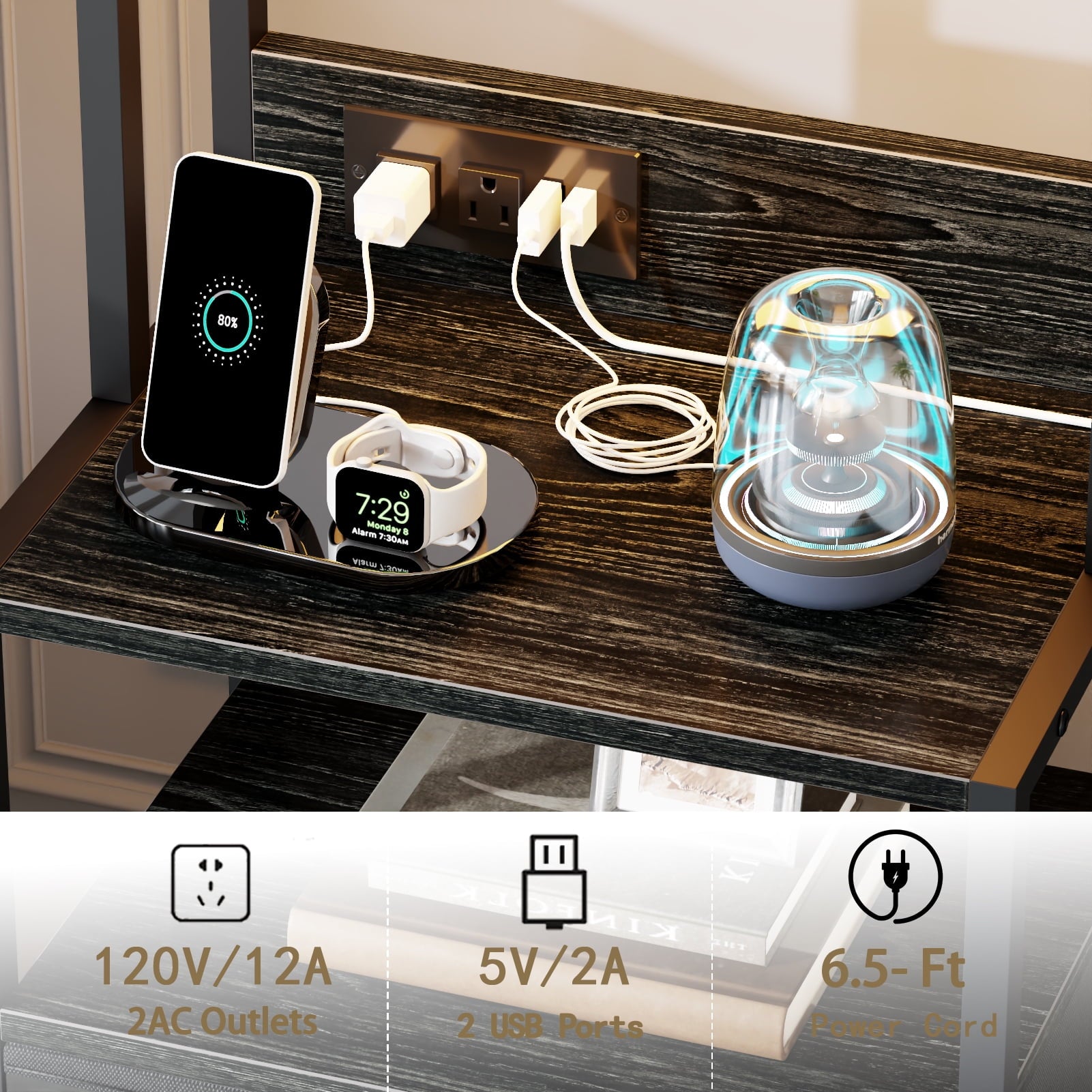 - Nightstand with charging station: 2 AC outlets, 2 USB ports, and a 6.5 ft power cord