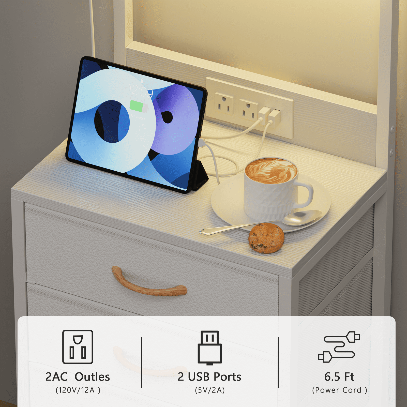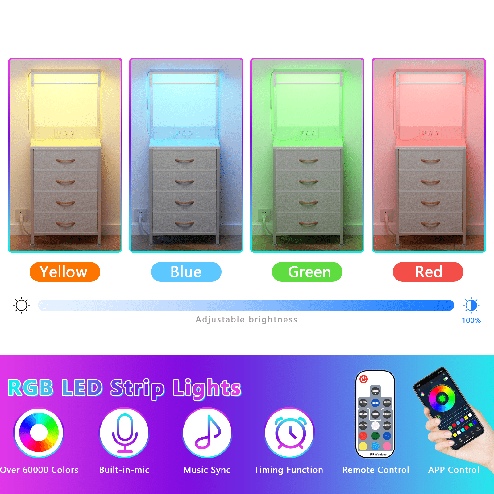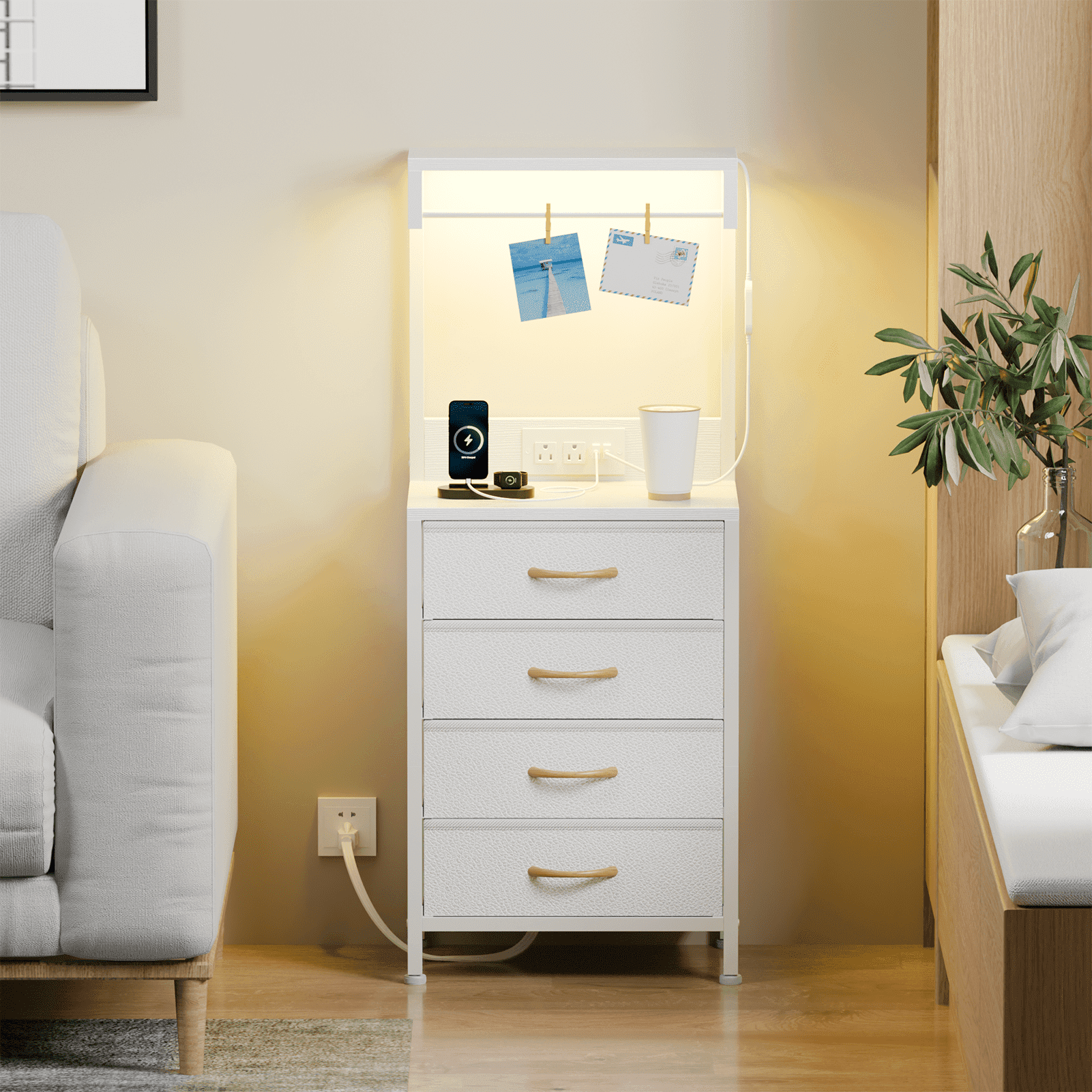 Satifur Tall Nightstand with Charging Station and Drawers, Bedside Table with 4 Fabric Drawers, LED Lights, and 2 Storage Shelves, White