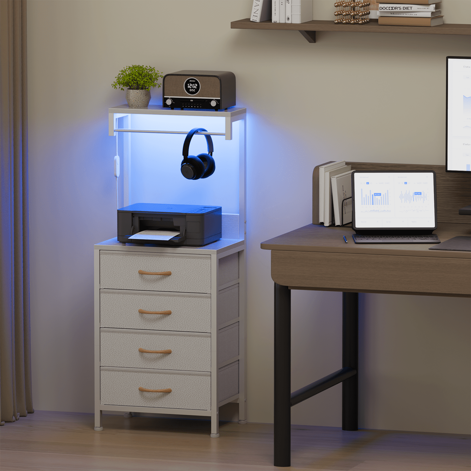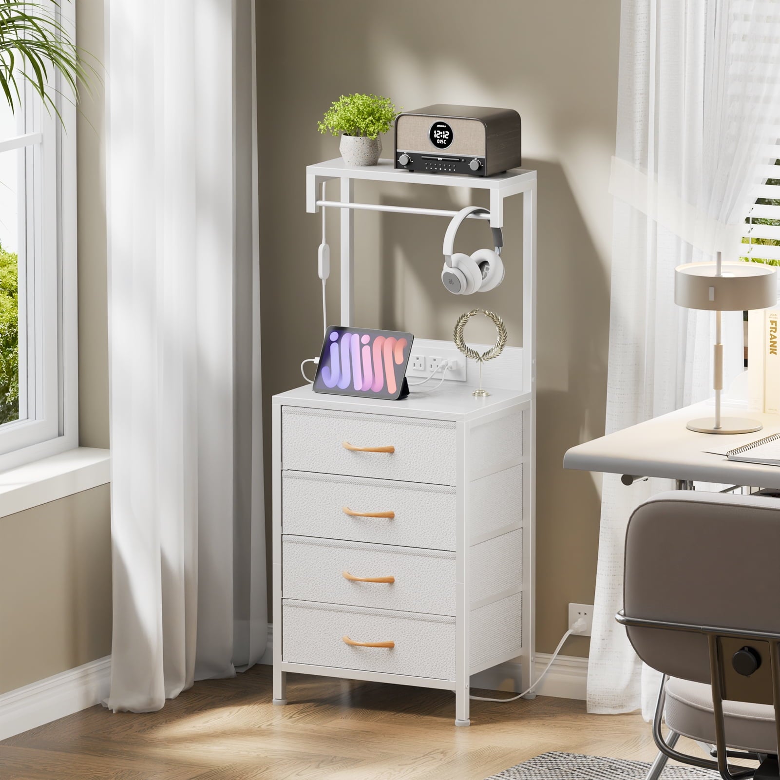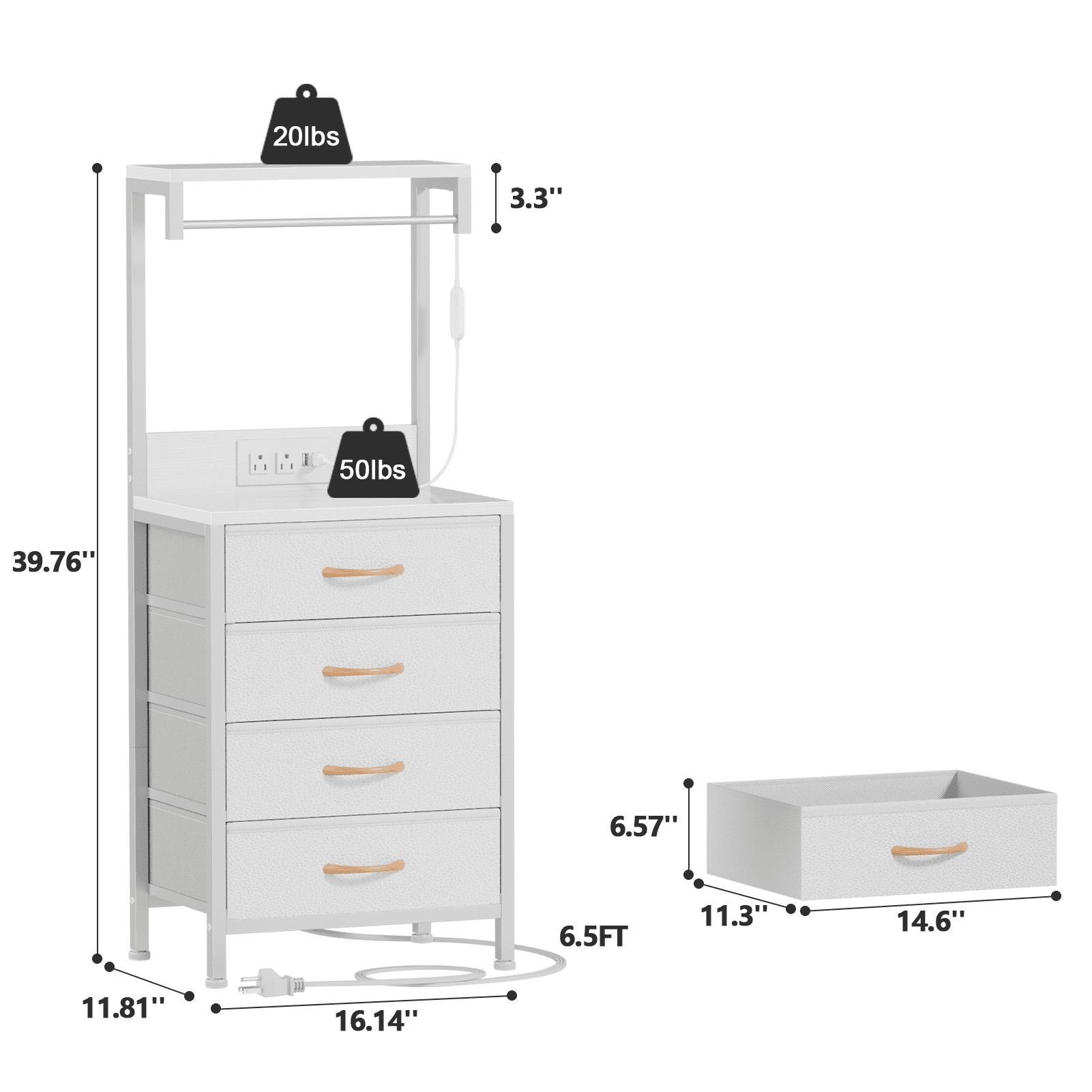 Satifur Tall Nightstand with Charging Station and Drawers, Bedside Table with 4 Fabric Drawers, LED Lights, and 2 Storage Shelves, White