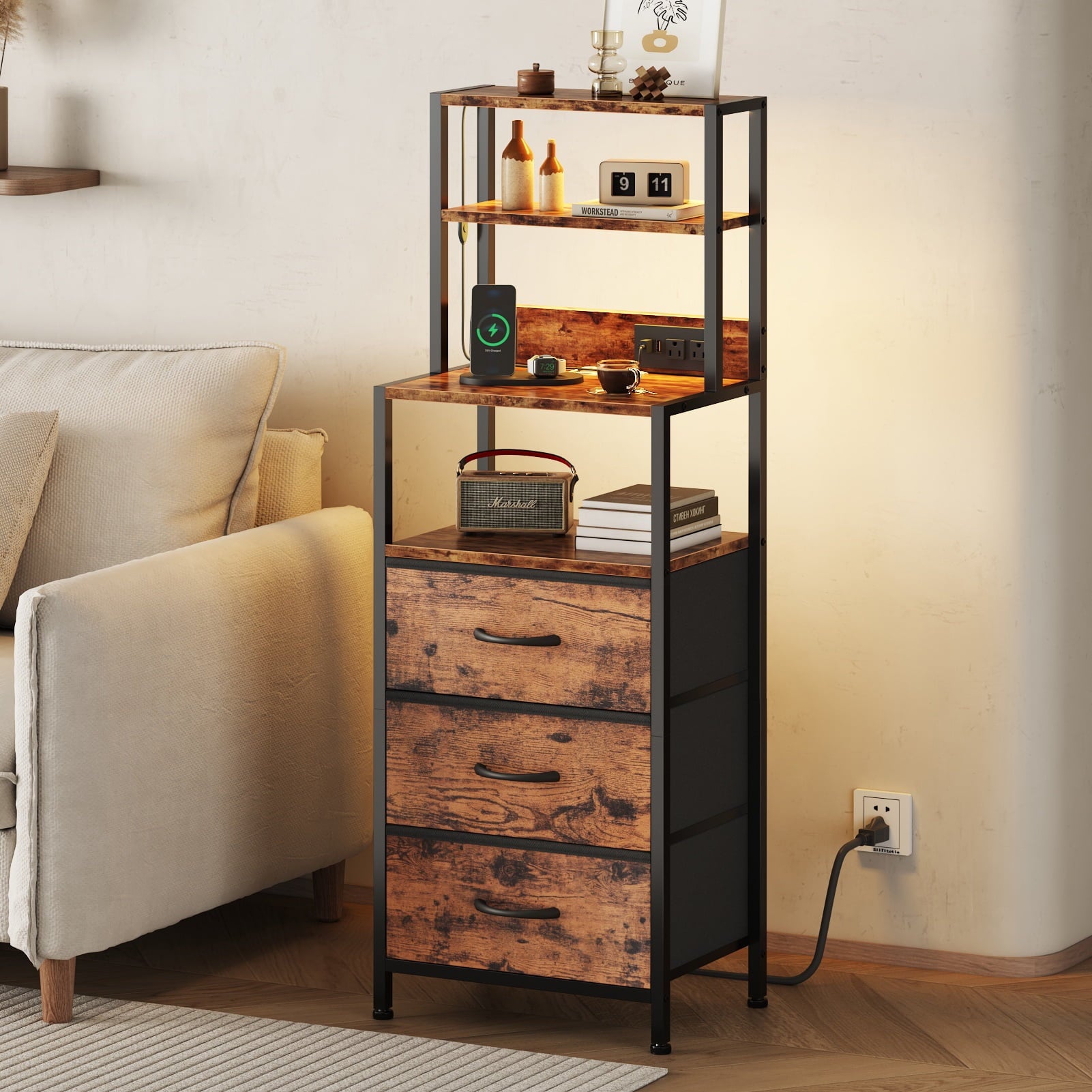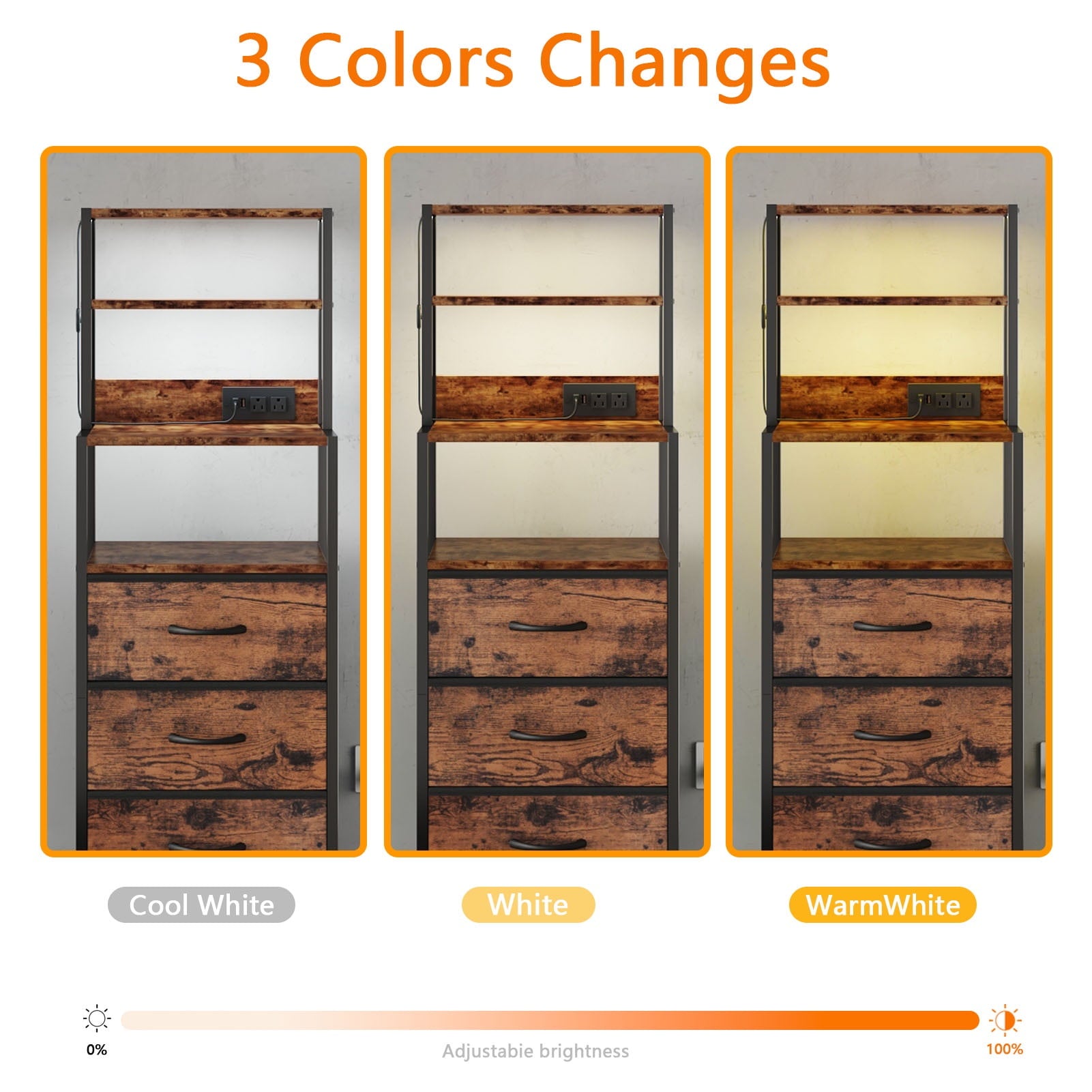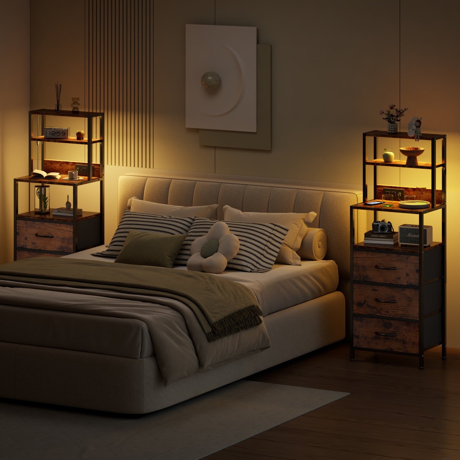 Satifur Tall Nightstand with Charging Station and LED Lights, Bedside Table with Bookshelf,3 Fabric Drawers, Rustic Brown