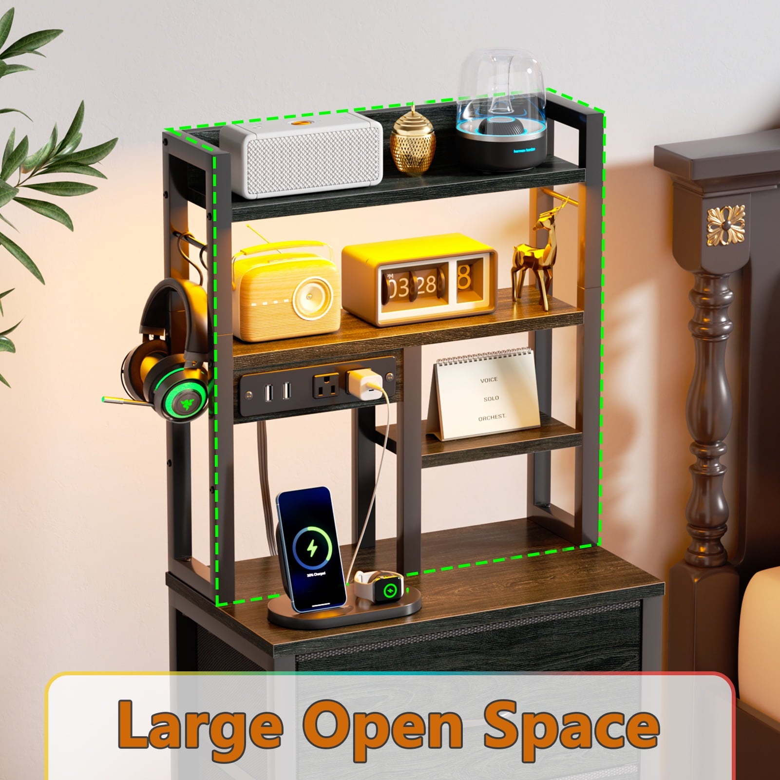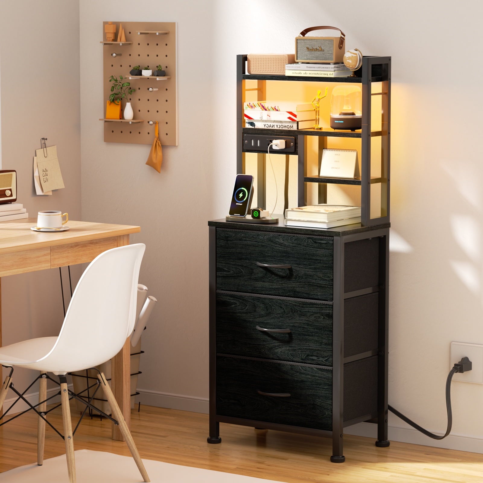 Satifur Tall Nightstand with charging station and led night is a best complementary to your livingroom, bedroom, office, etc. Constructed of selected particle board and sturdy metal frame, this organizer unit provides with good load capacity and last for years. The 3 fabric drawes and 4 open shelves helps you manage your stuffs and keep room tidy. It also include colorful led lights for adding atomosphere to the house.