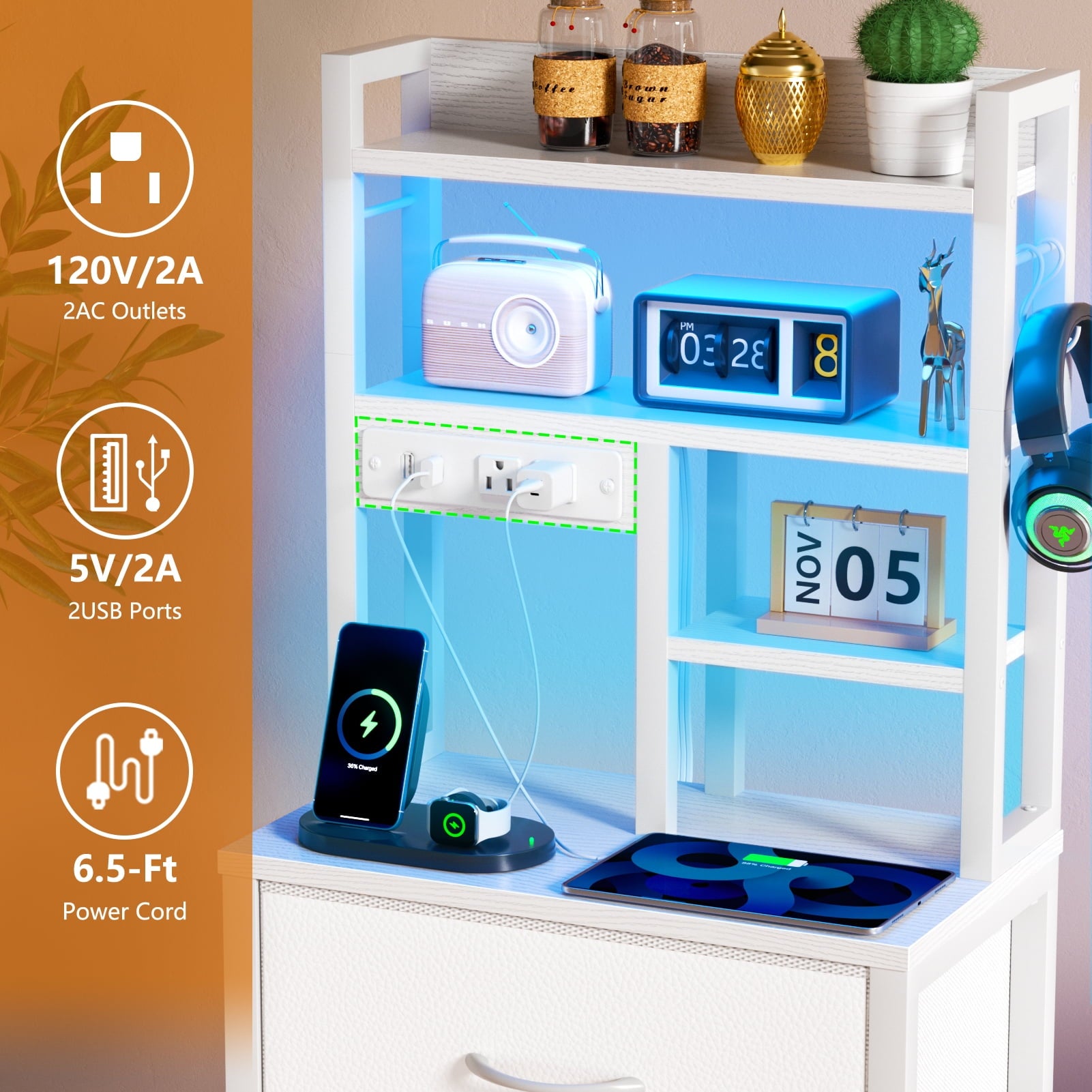 Satifur Tall Nightstand with charging station and led night is a best complementary to your livingroom, bedroom, office, etc. Constructed of selected particle board and sturdy metal frame, this organizer unit provides with good load capacity and last for years. The 3 fabric drawes and 4 open shelves helps you manage your stuffs and keep room tidy. It also include colorful led lights for adding atomosphere to the house.
