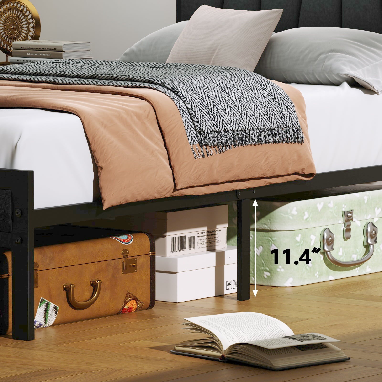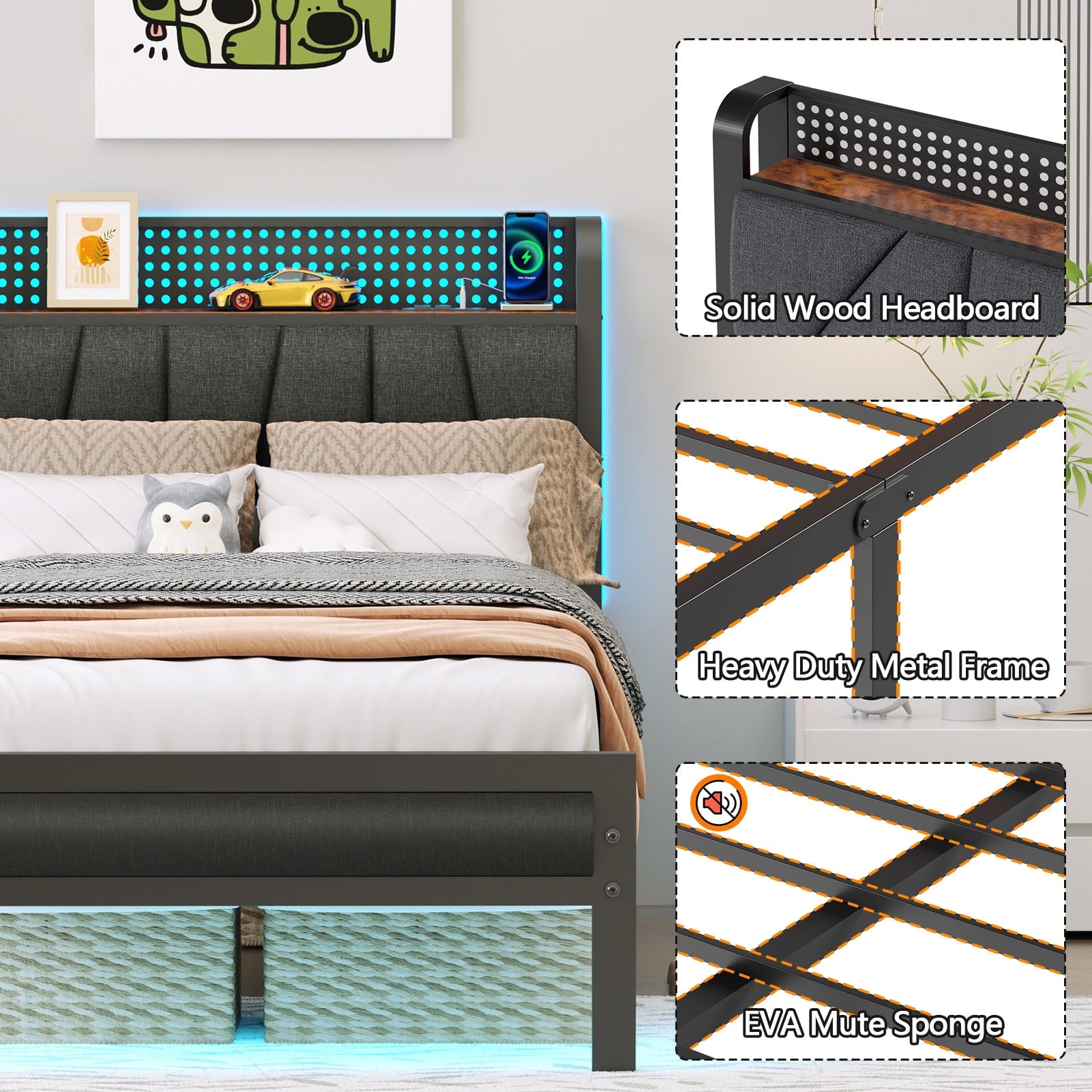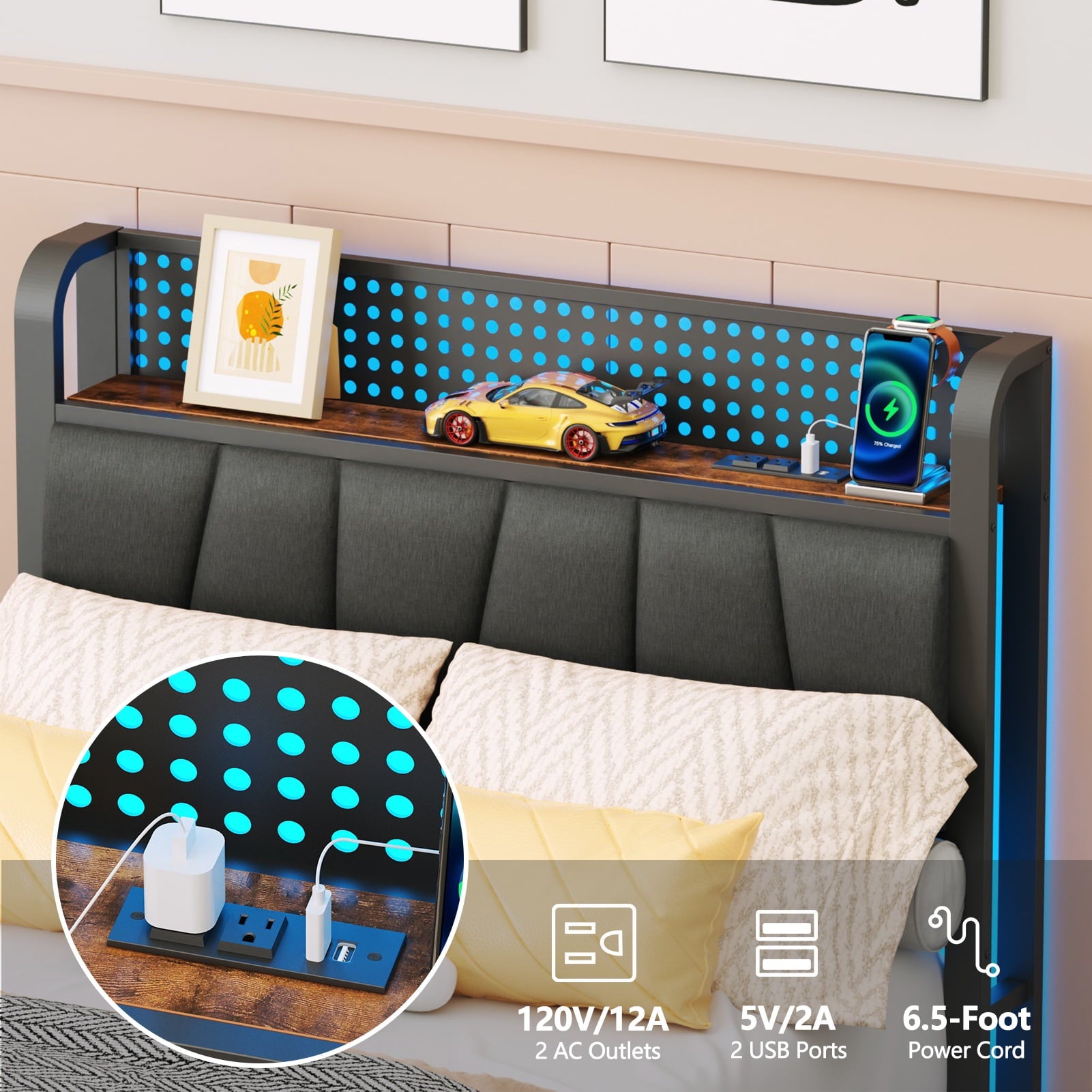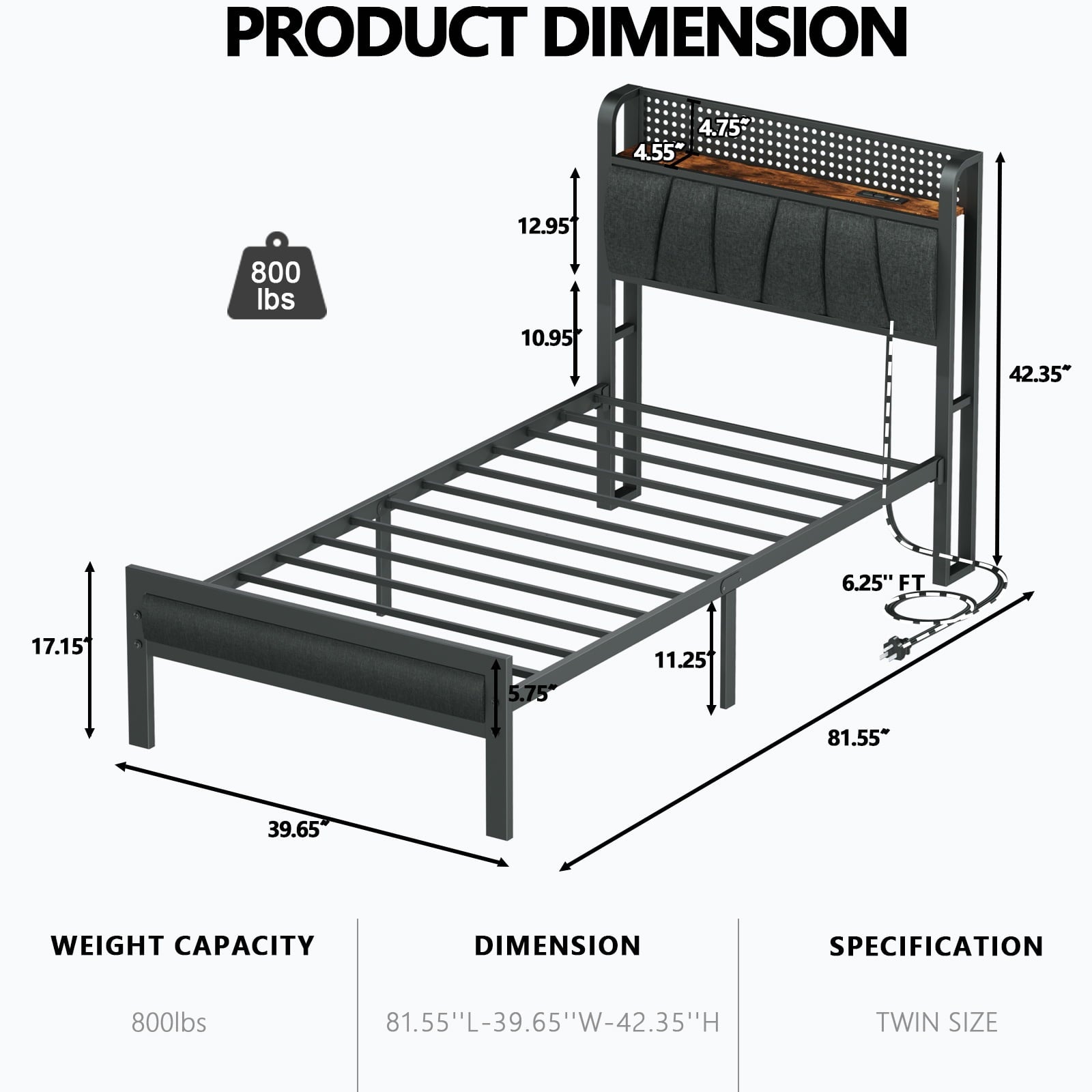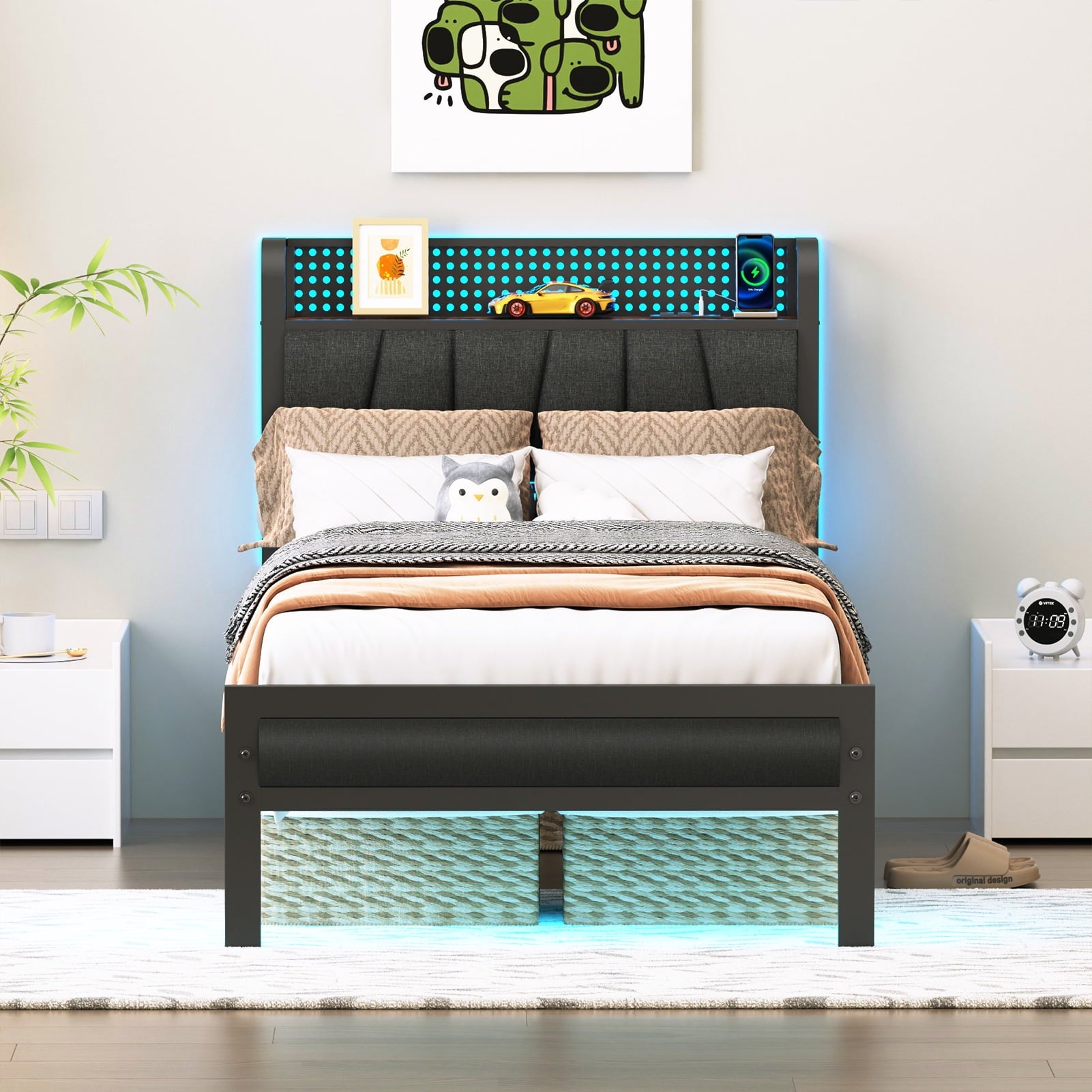 Satifur Twin Bed Frame with Upholstered Storage Headboard, Metal Platform Bed Station with Charging Station & LED, Noise-Free.No Box Spring Needed