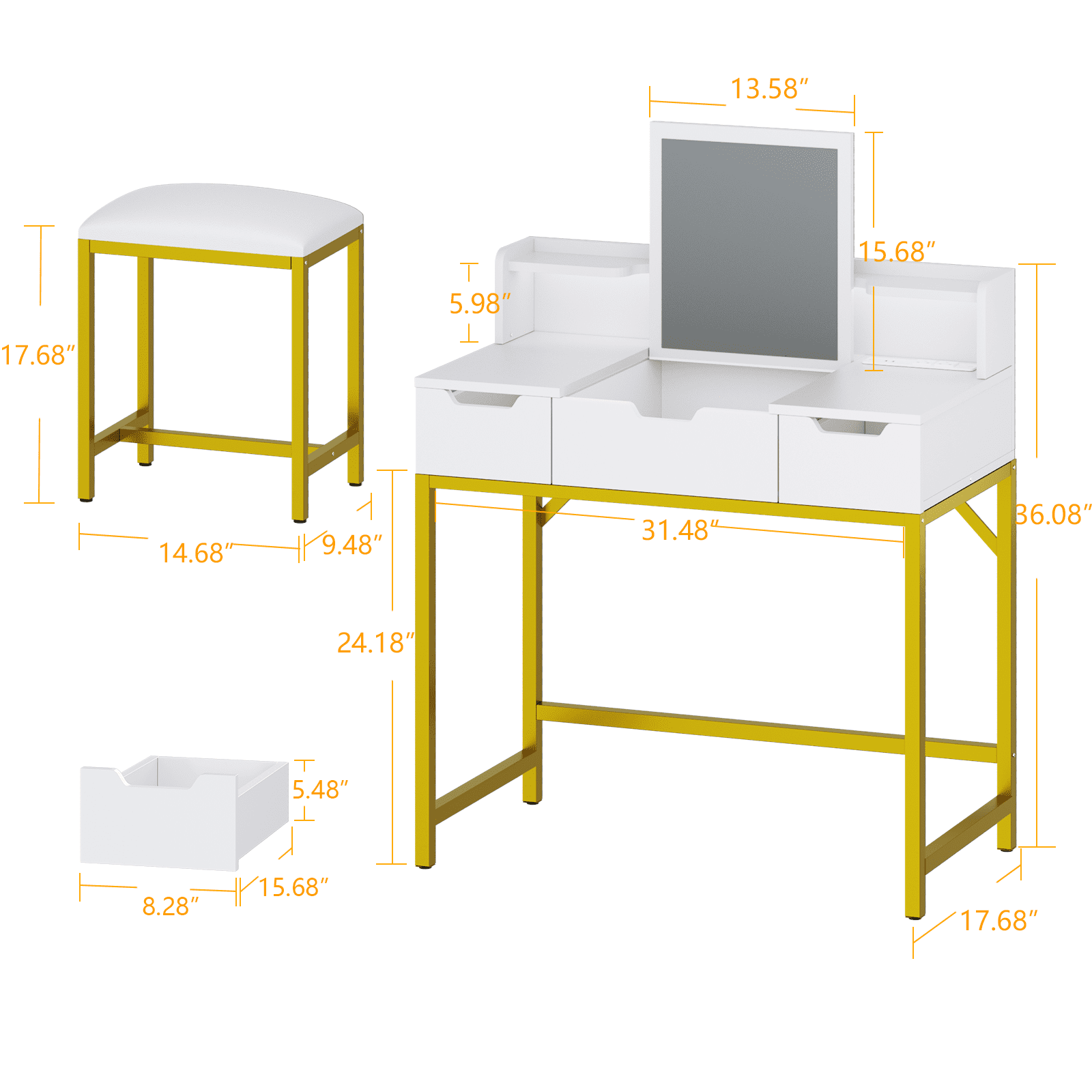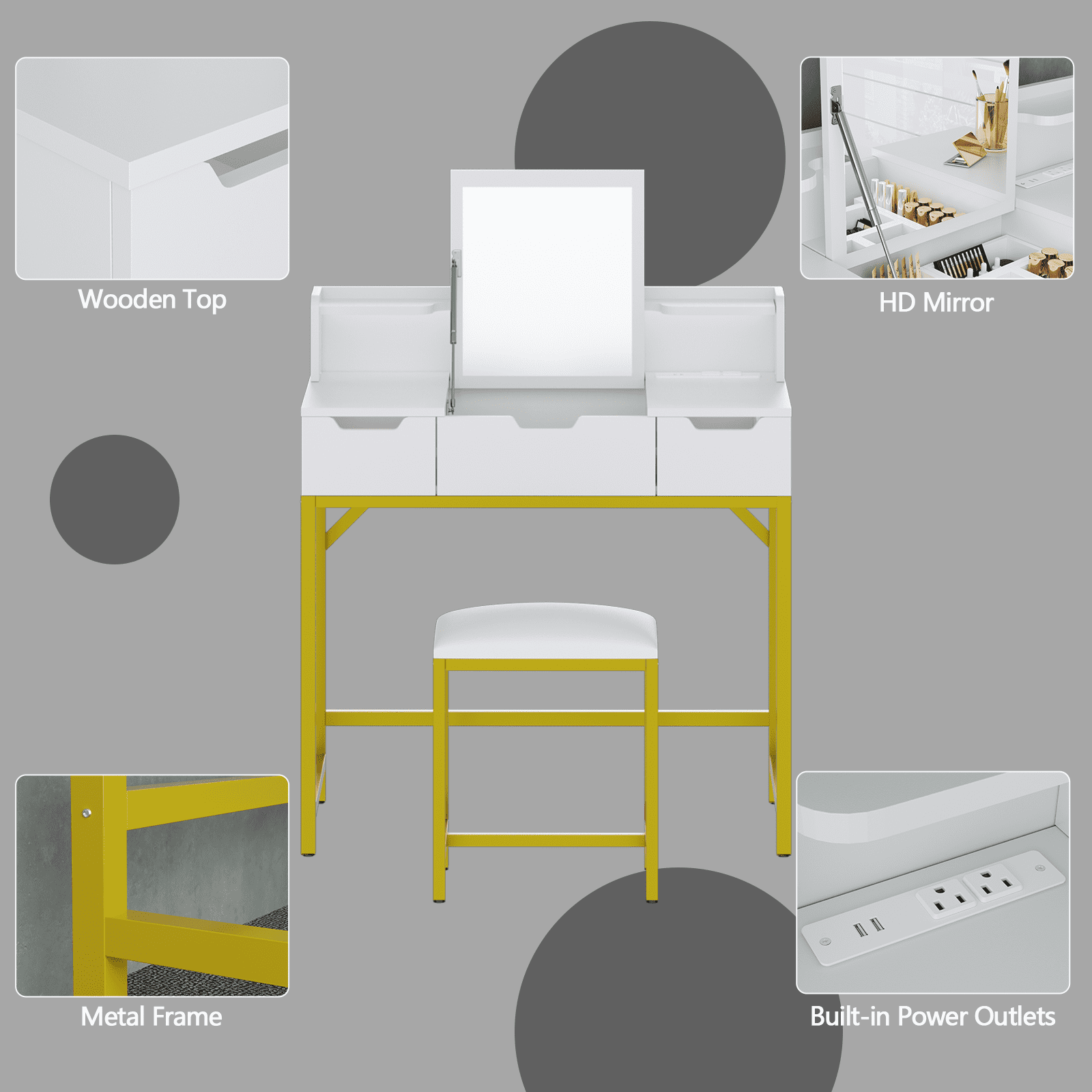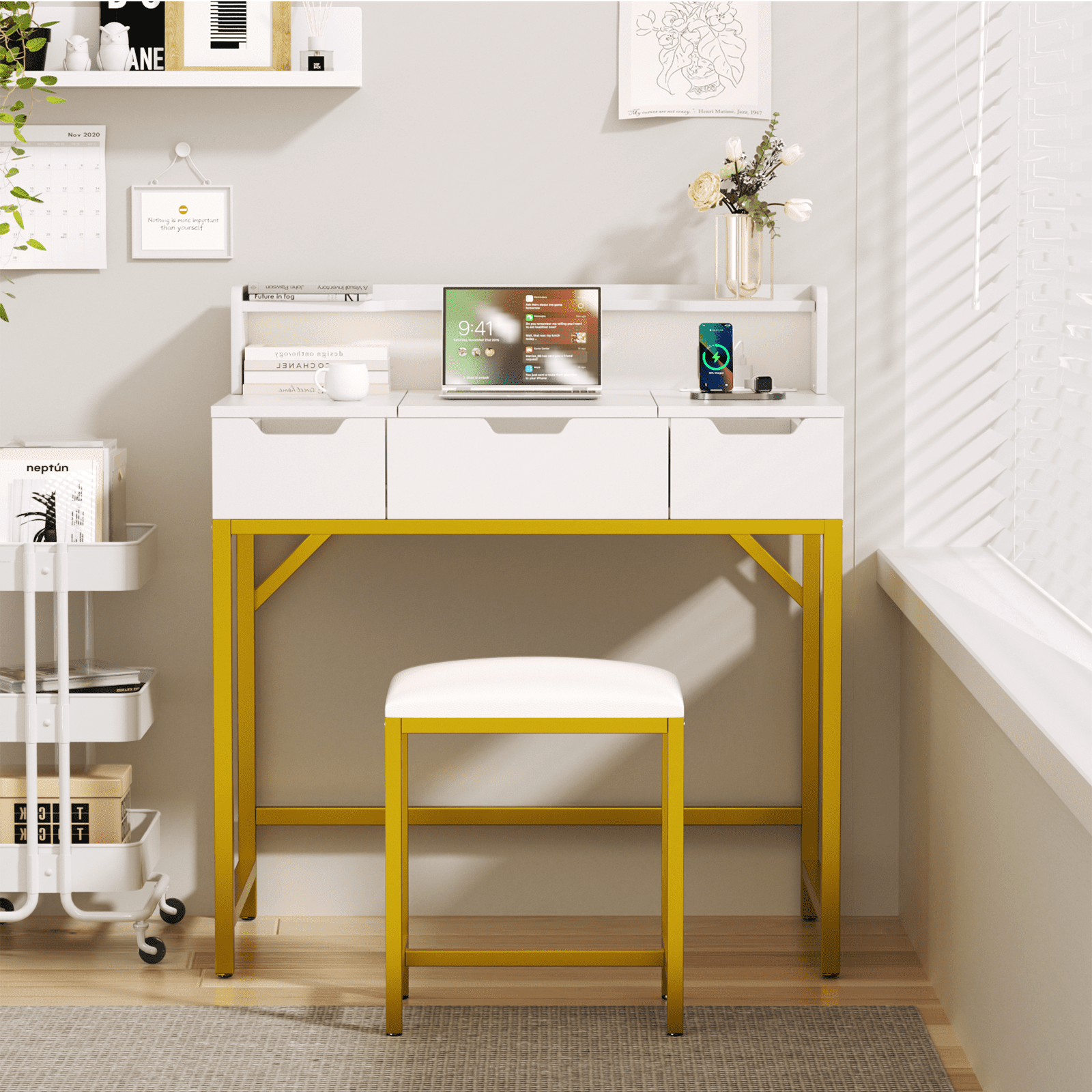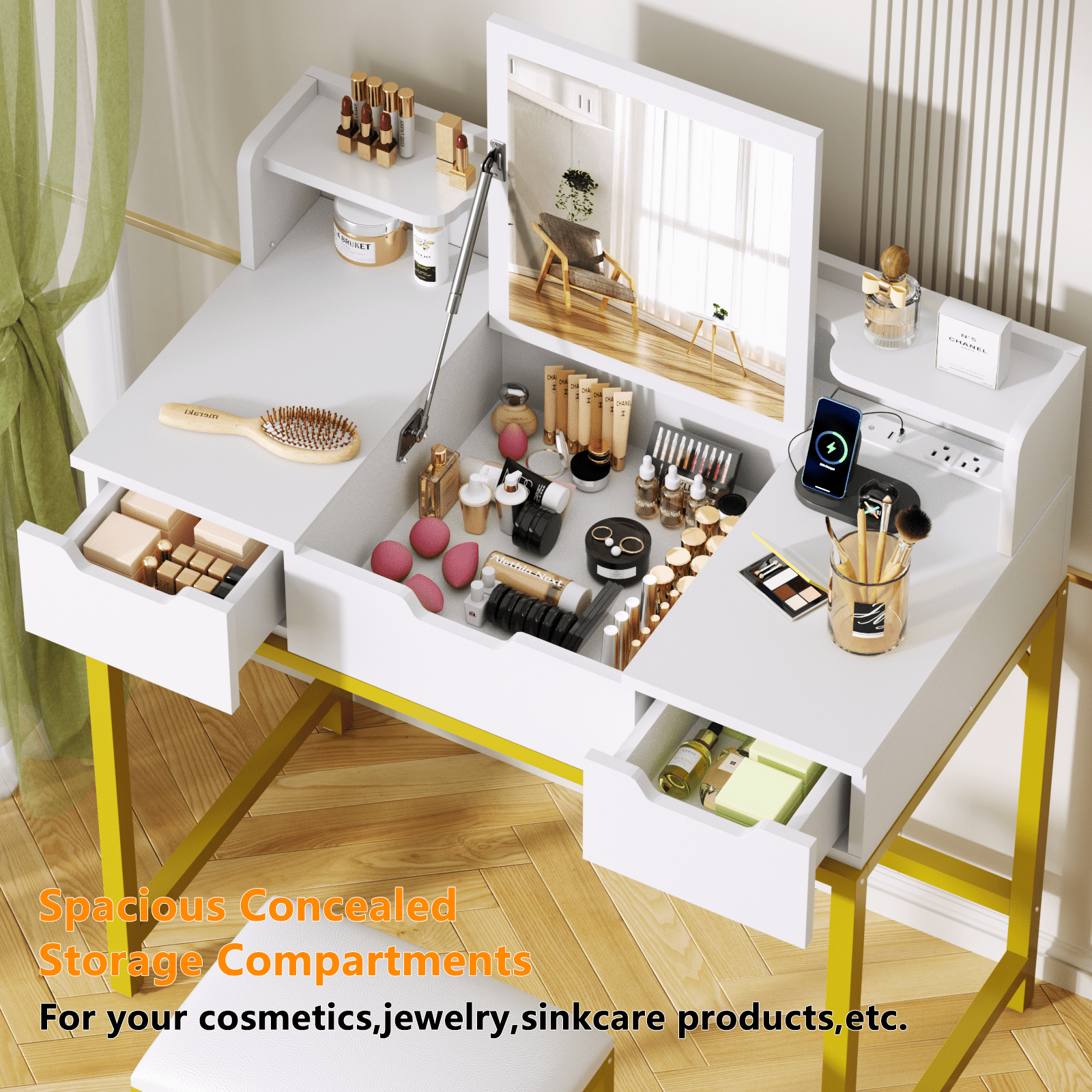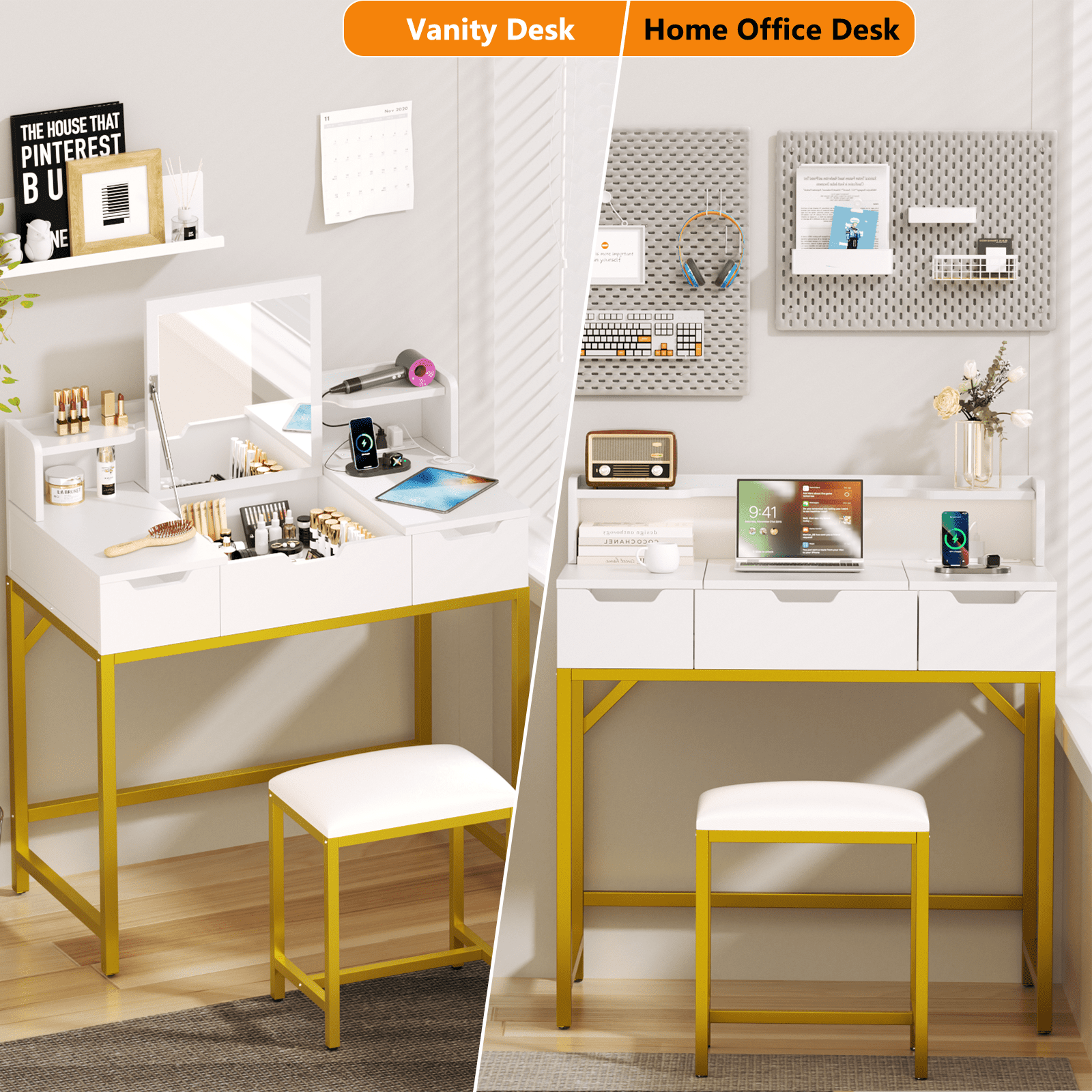 Satifur Vanity Desk 2 in 1 Design with Mirror and Charging Station Makeup Table with Chair and Storage Space