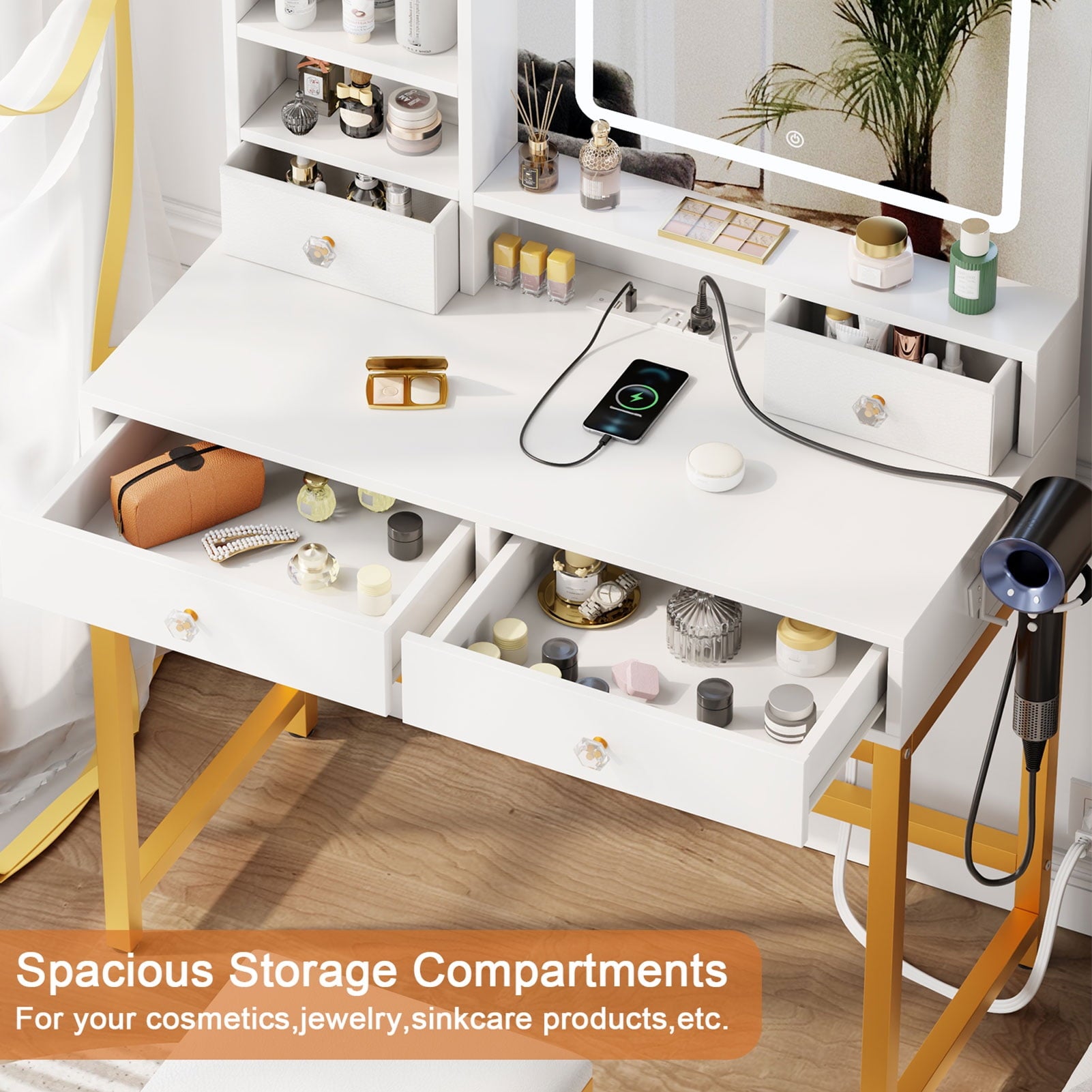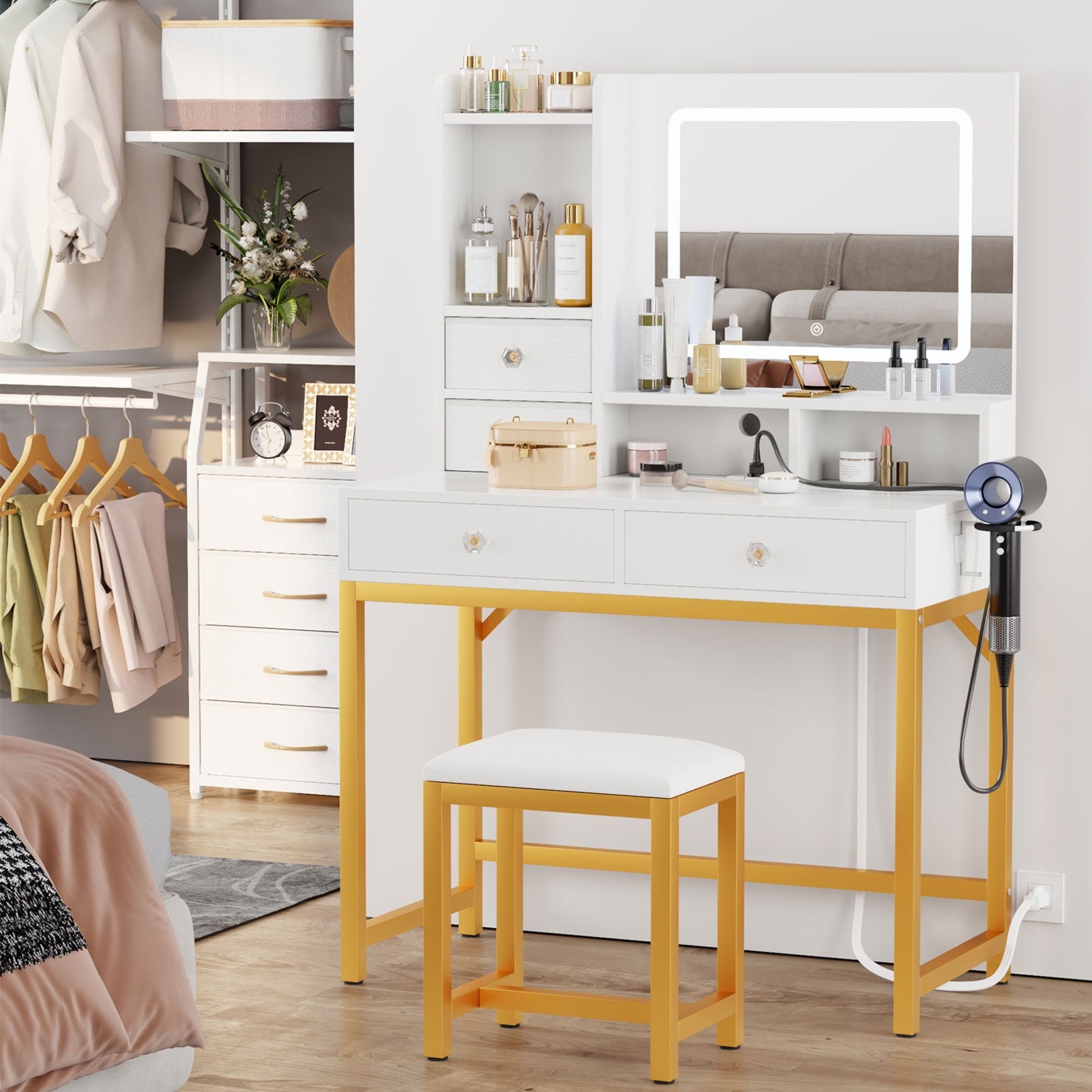 Satifur Vanity Desk Set with Light Mirror & Power Outlet, Makeup Table with Drawers, Adjustable Cabinet/Makeup Vanity Stool for Women, Girls