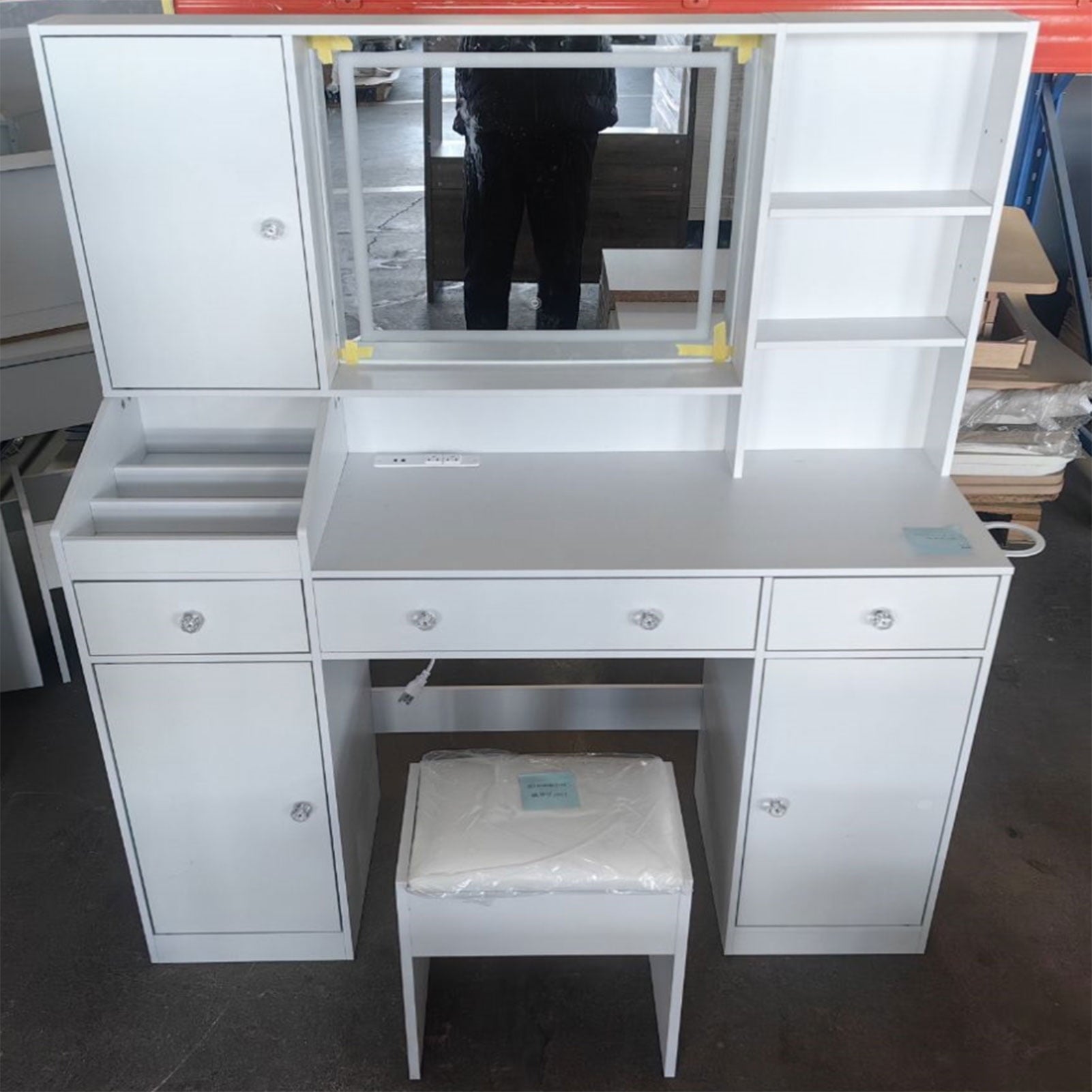 Satifur Vanity Desk Set with Mirror, LED Lights & Outlet, Adult Makeup Table with Jewelry Cabinet, Storage Drawers & Stool