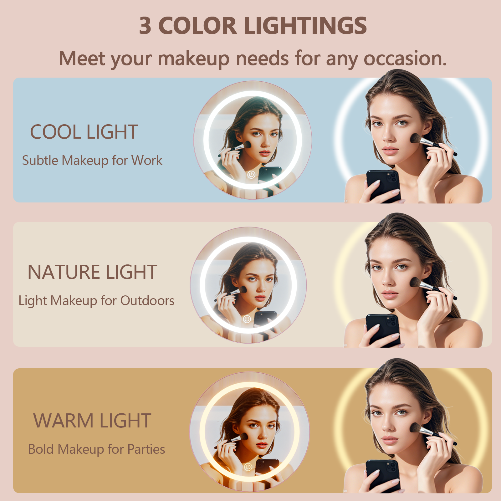 Customizable Lighting: Lighted mirror with 3 color settings and adjustable brightness, ideal for various makeup needs and environments