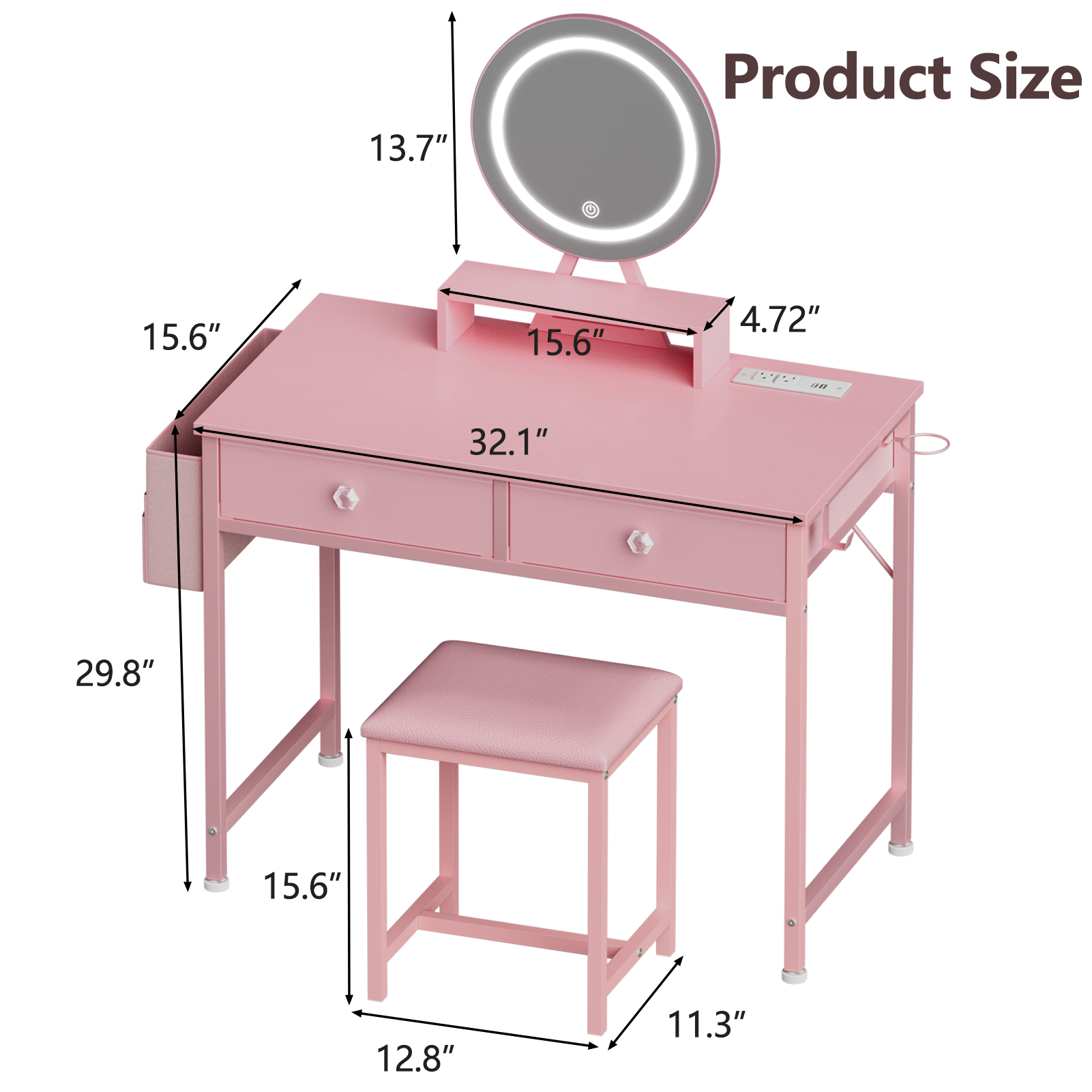 Satifur Vanity Desk with Mirror & Lights, GRWM Vanity with Drawers, Makeup Dressing Table with Stool & Charging, Pink