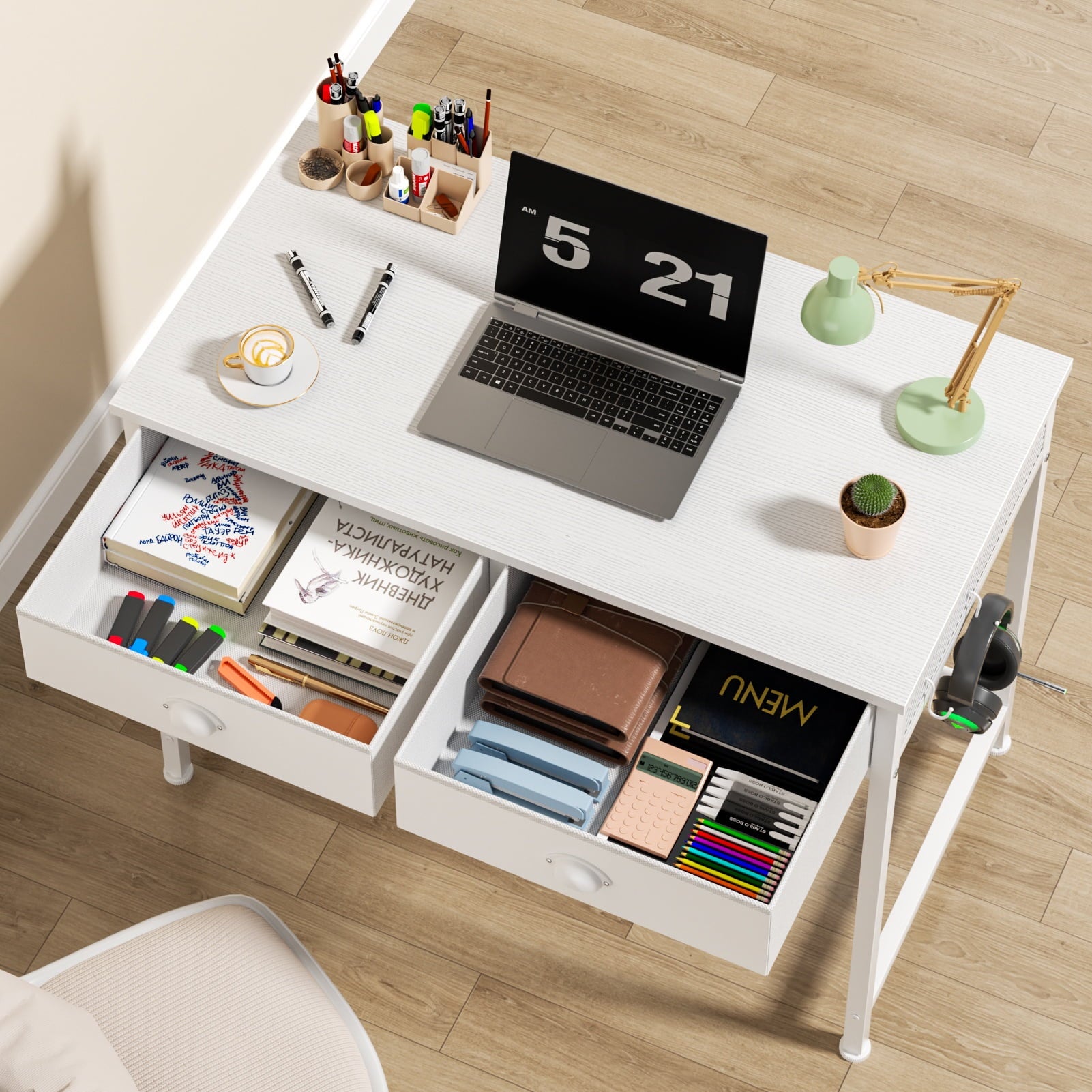 -- Includes two removable hooks for hanging bags and headphones, with ample space for PC, laptop, printer, and other office tools.