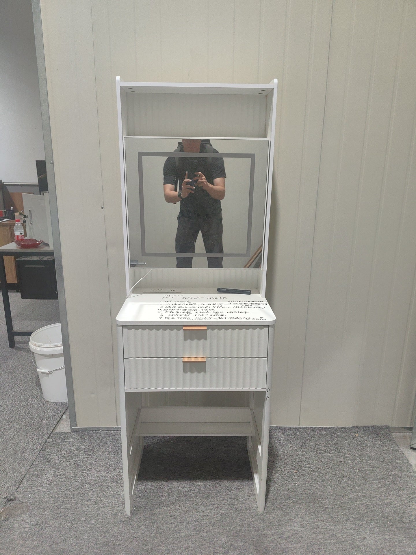 - Wooden drawers and shelves provide ample storage for cosmetics and skincare products.