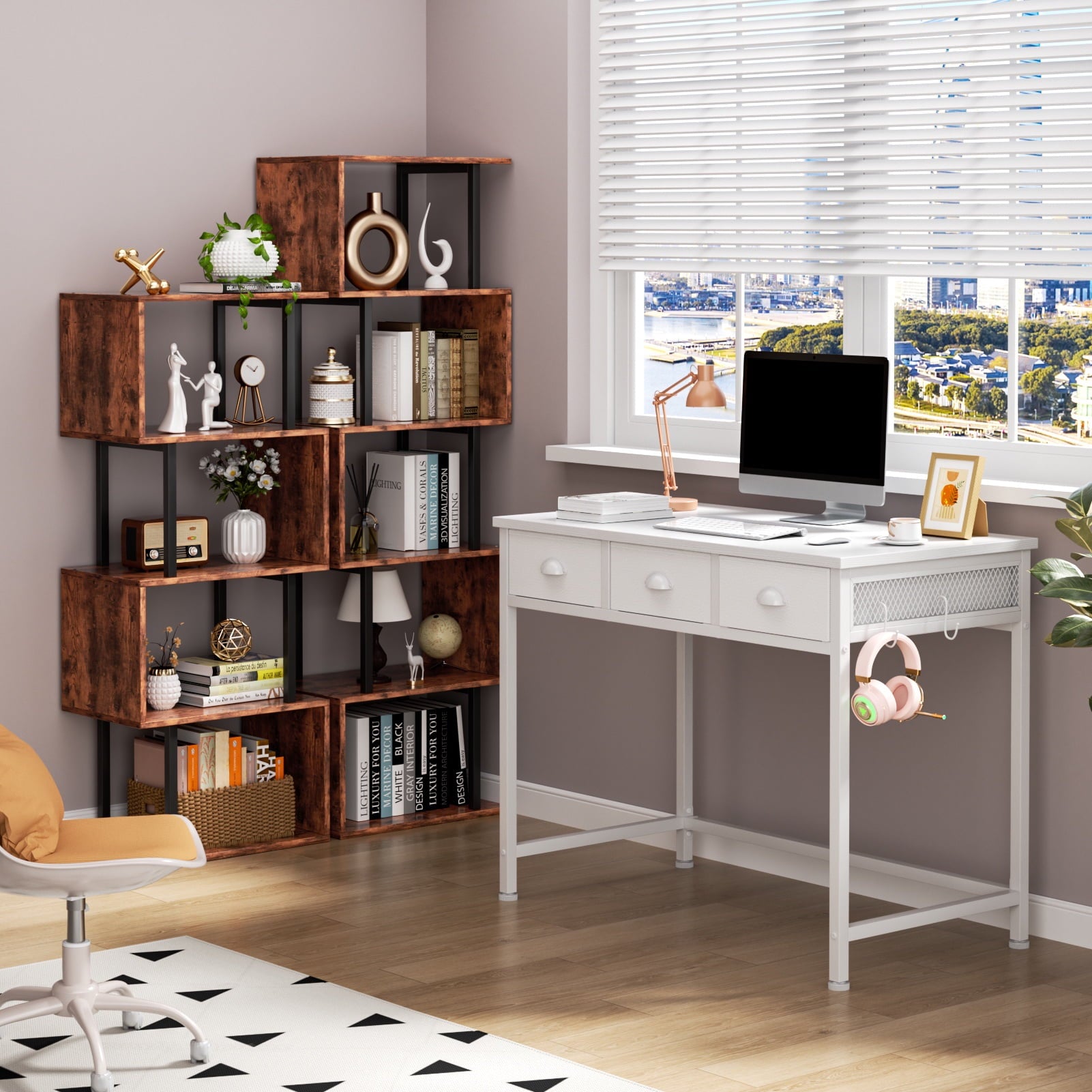 Satifur White Desk with Drawers & Hooks, Computer Writing Desk with 3 Fabric Drawers for Bedroom, Home Office