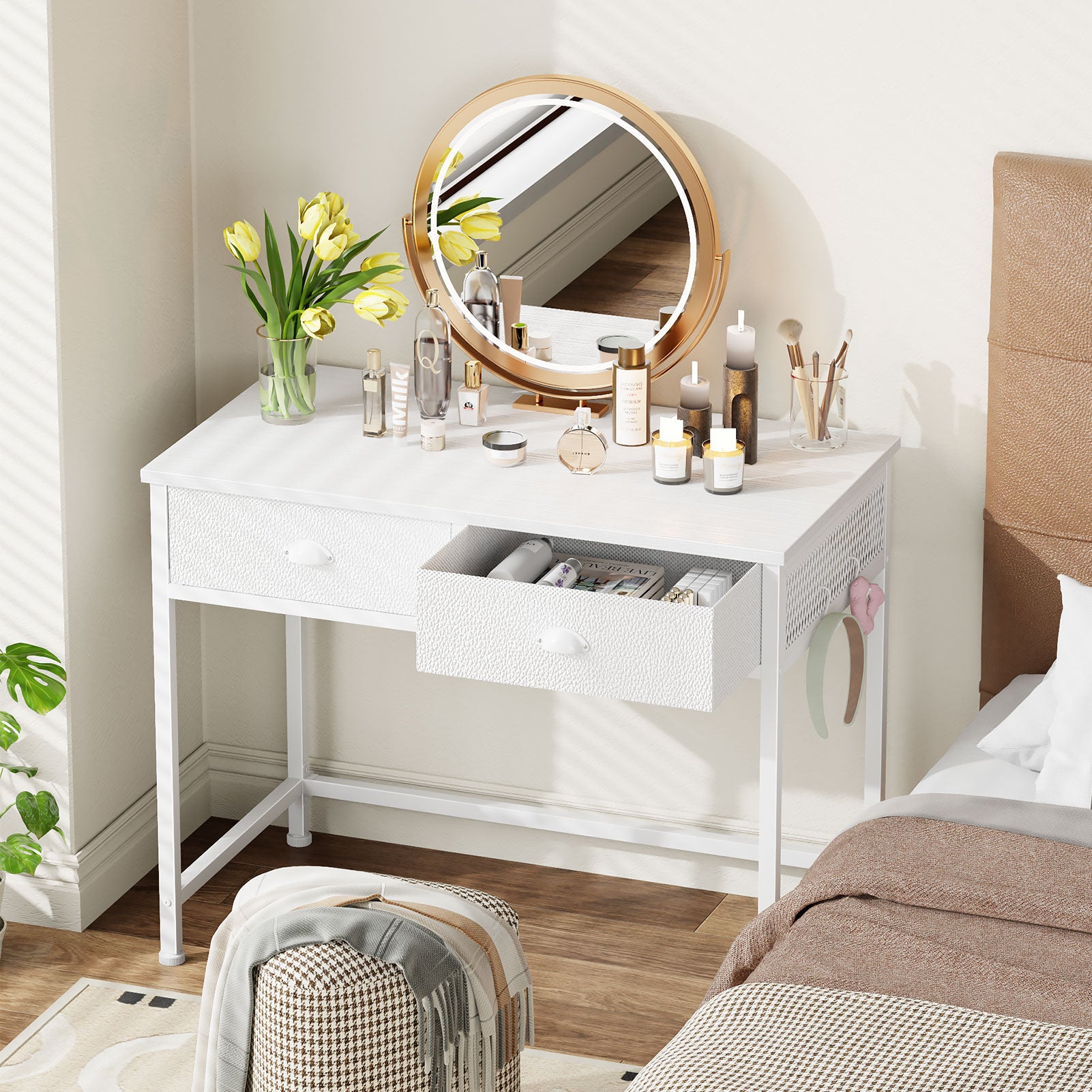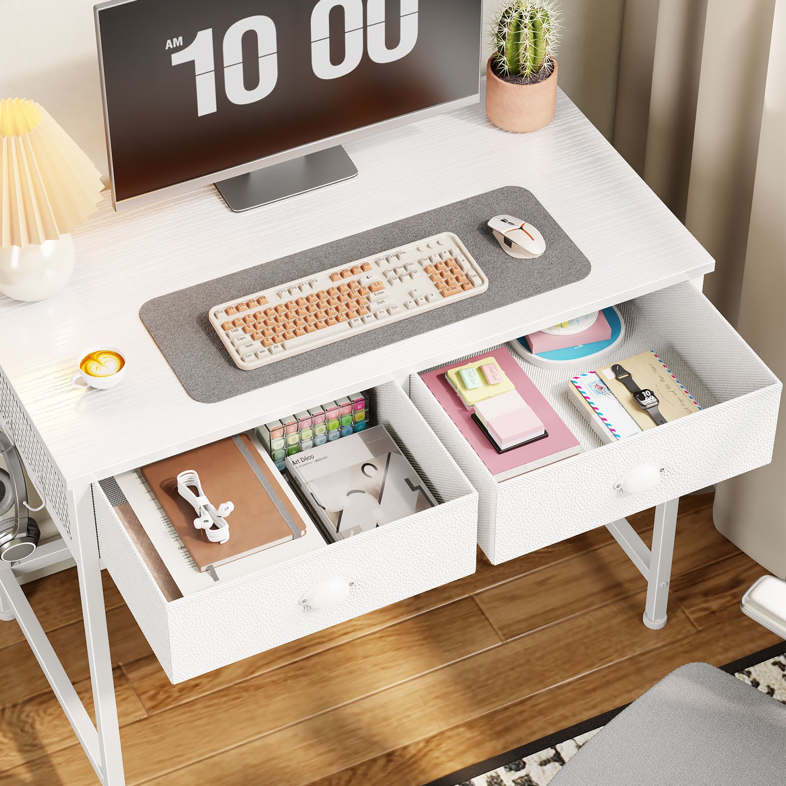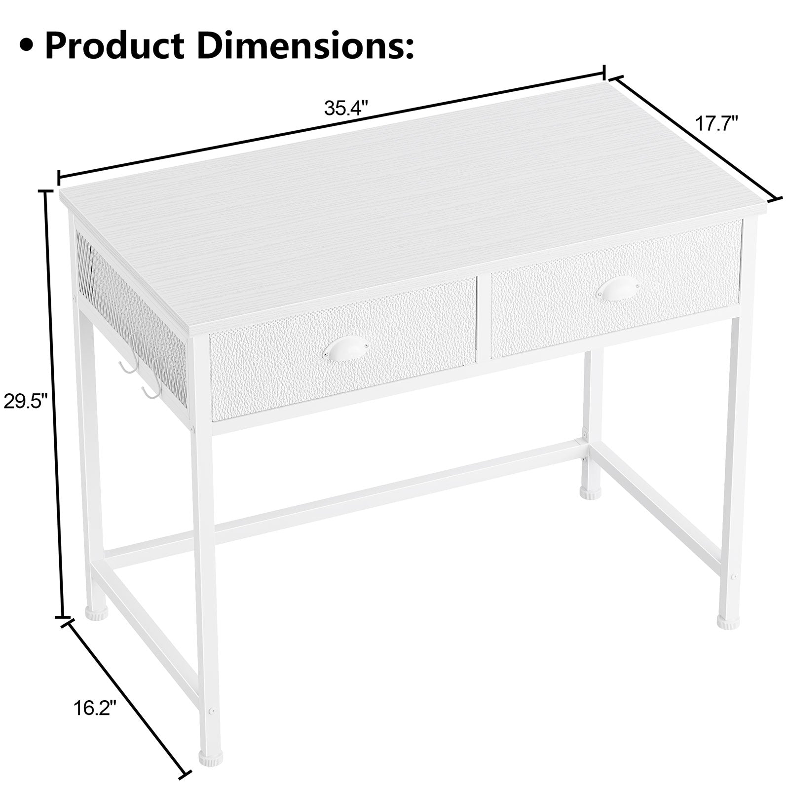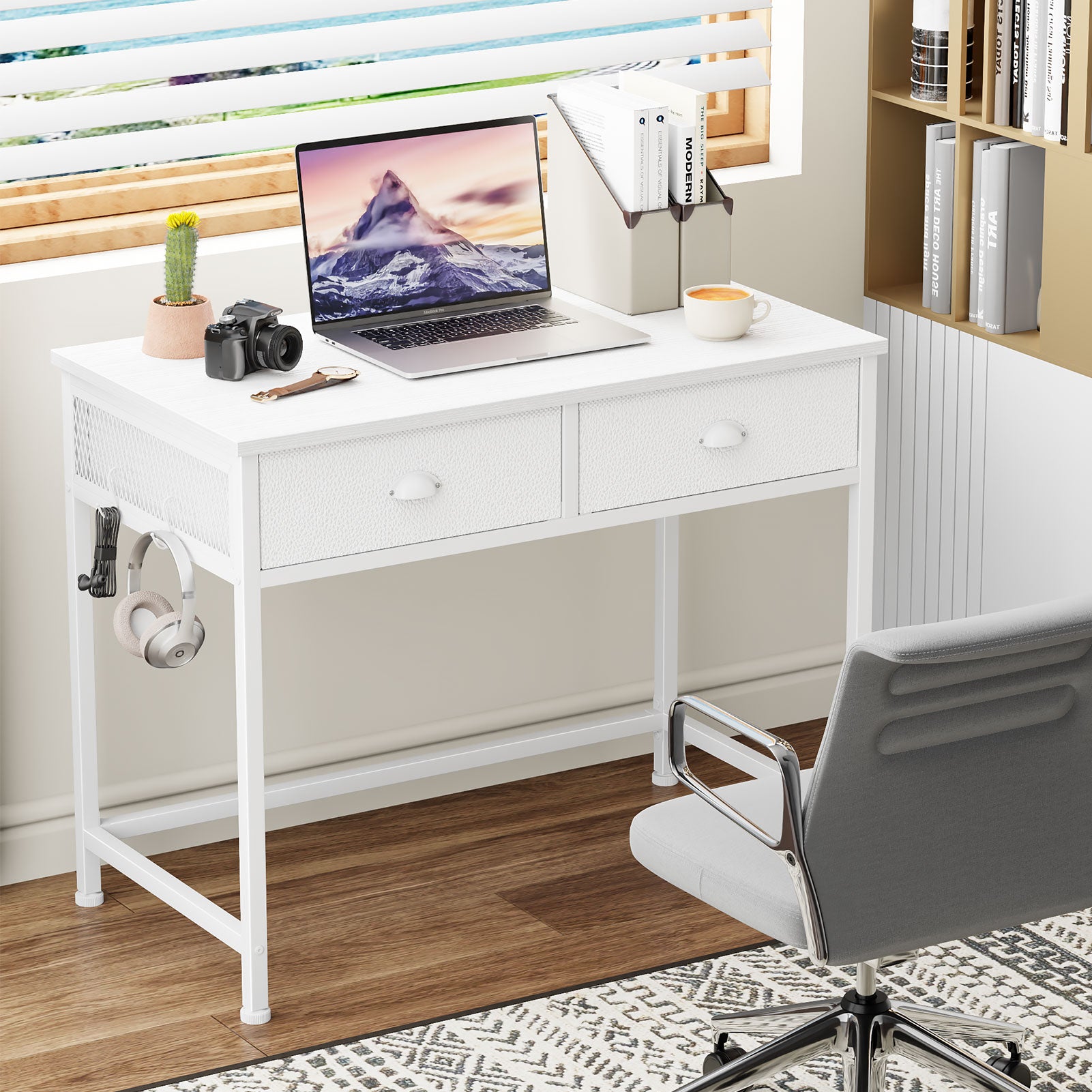Satifur White Writing Desk with Drawers & Hooks, 34" Computer Desk with 2 Fabric Drawers