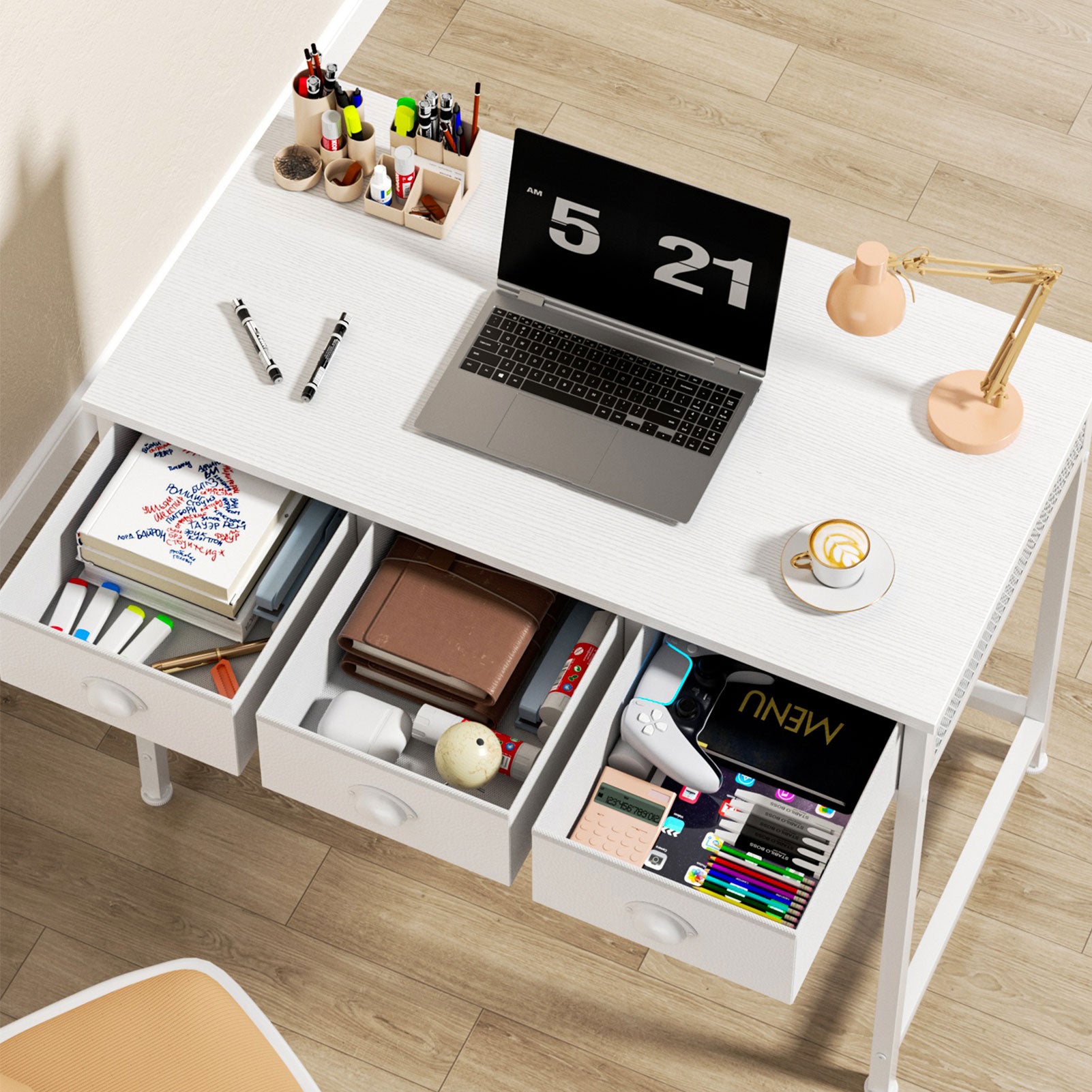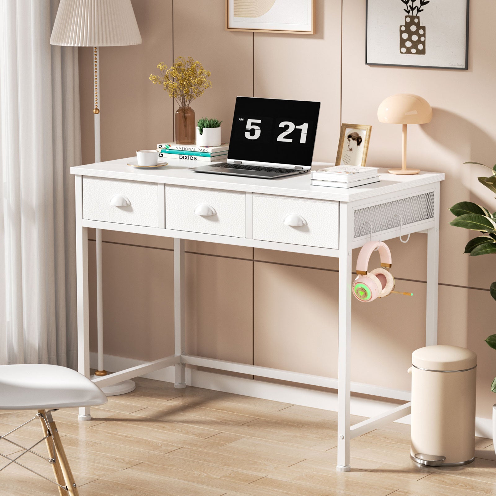Satifur White Writing Desk with Drawers & Hooks, 40" Computer Desk with 3 Fabric Drawers
