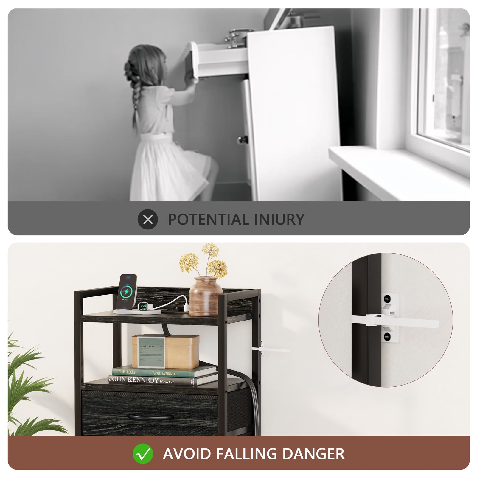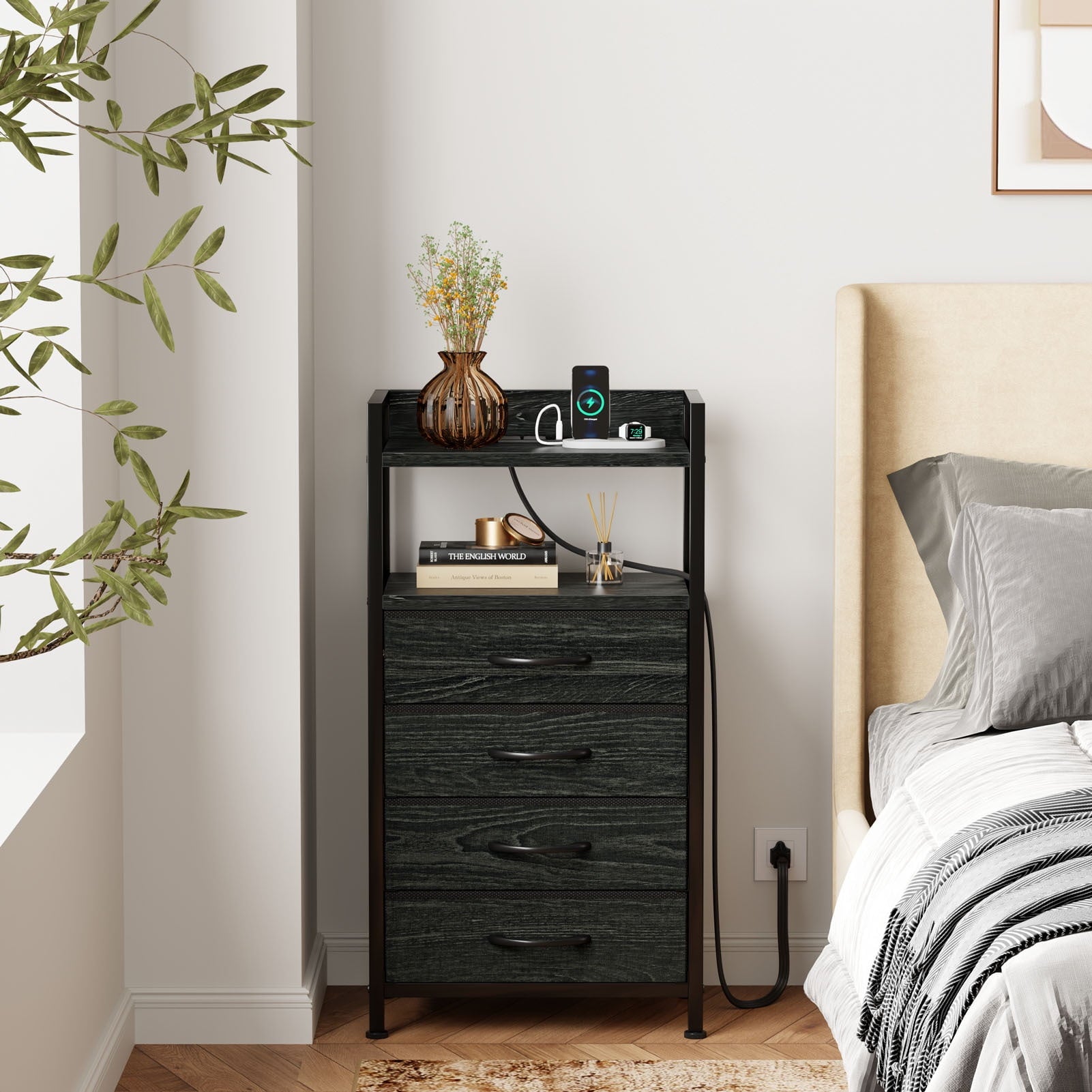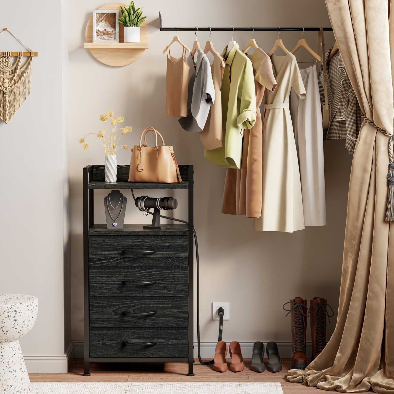 This stylish dresser features 2 AC outlets and 2 USB ports for easy device charging, along with RGB LED lights that sync with your music for a dynamic touch. Ideal for adults, it includes 4 spacious fabric drawers for organizing items like remote controls, keys, and small clothing, with a top wooden shelf for lamps and decorations. Made with a sturdy frame, wood board, and non-woven fabric, the drawers can hold up to 10 lbs, and the top can support 50 lbs. Adjustable feet enhance stability, and an anti-toppling device ensures safety.